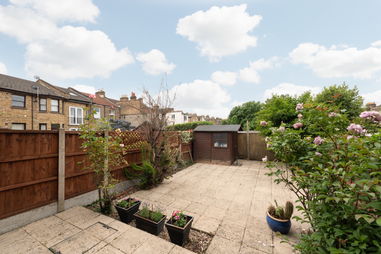 Low maintenance and south-west facing, the garden enjoys both daytime and evening sunshine. An extensive paved terrace is bounded by borders with mature shrubs, and there´s a useful shed for storage.