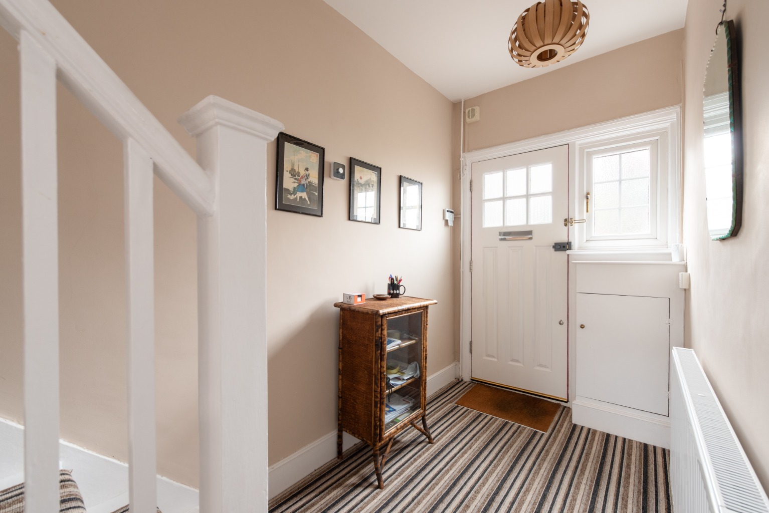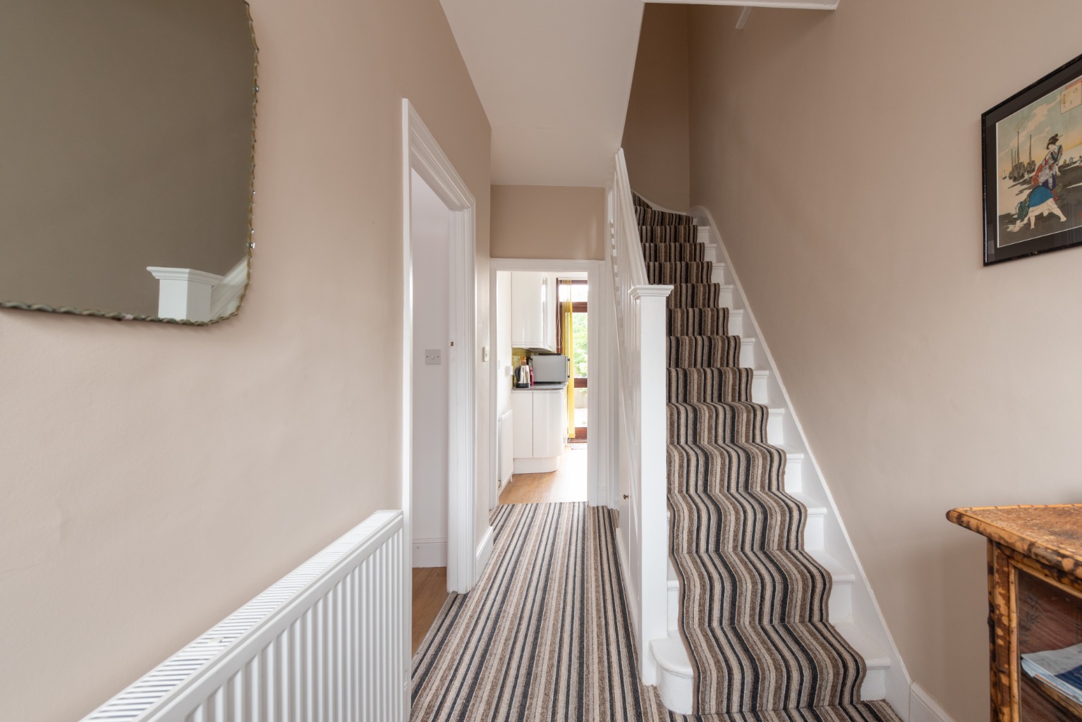 Set on a quiet street, a small front garden with well-tended hedges leads to the beautifully restored front door and into the large, bright hallway. Warm cappuccino walls pick out the colours in the high quality contemporary patterned carpet, which extends to the first-floor landing. There´s space for a small table, your coats and shoes plus a useful understairs storage cupboard.