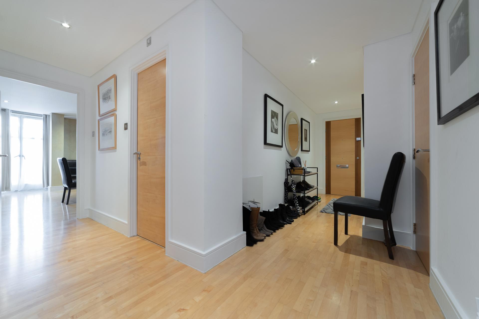 The apartment features two generous double bedrooms, including a principal suite with a modern en-suite shower room, alongside a contemporary family bathroom. The fully fitted integrated kitchen is sleek and modern, while the spacious living room boasts attractive wood flooring and provides an inviting space for both relaxing and entertaining.
