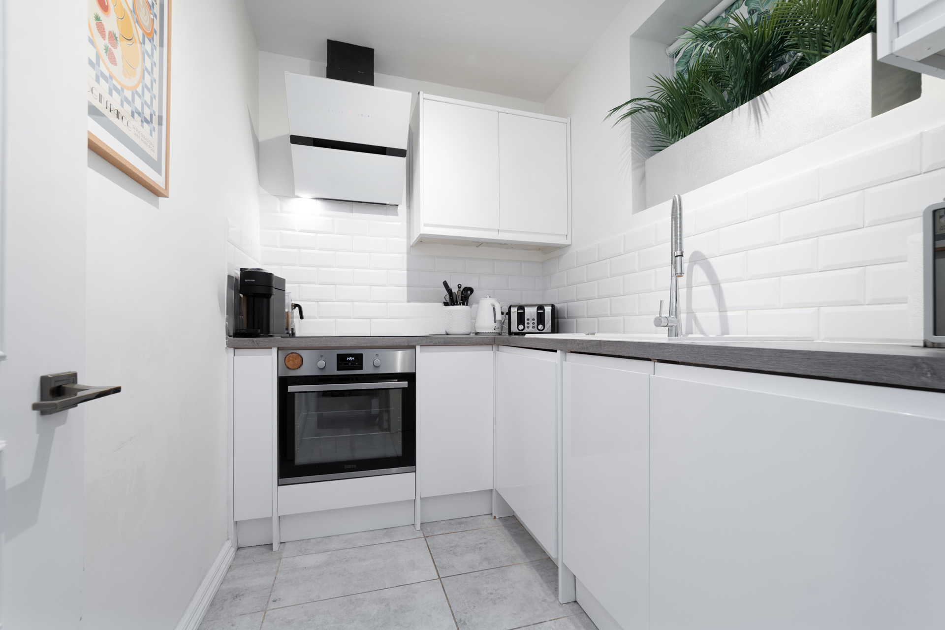 The property comprises a bright and spacious reception room with sliding doors opening onto a private balcony, creating a wonderful extension of the living space and allowing for plenty of natural light. The fully fitted kitchen is thoughtfully designed and includes integrated appliances such as a washing machine, fridge freezer and ample storage.