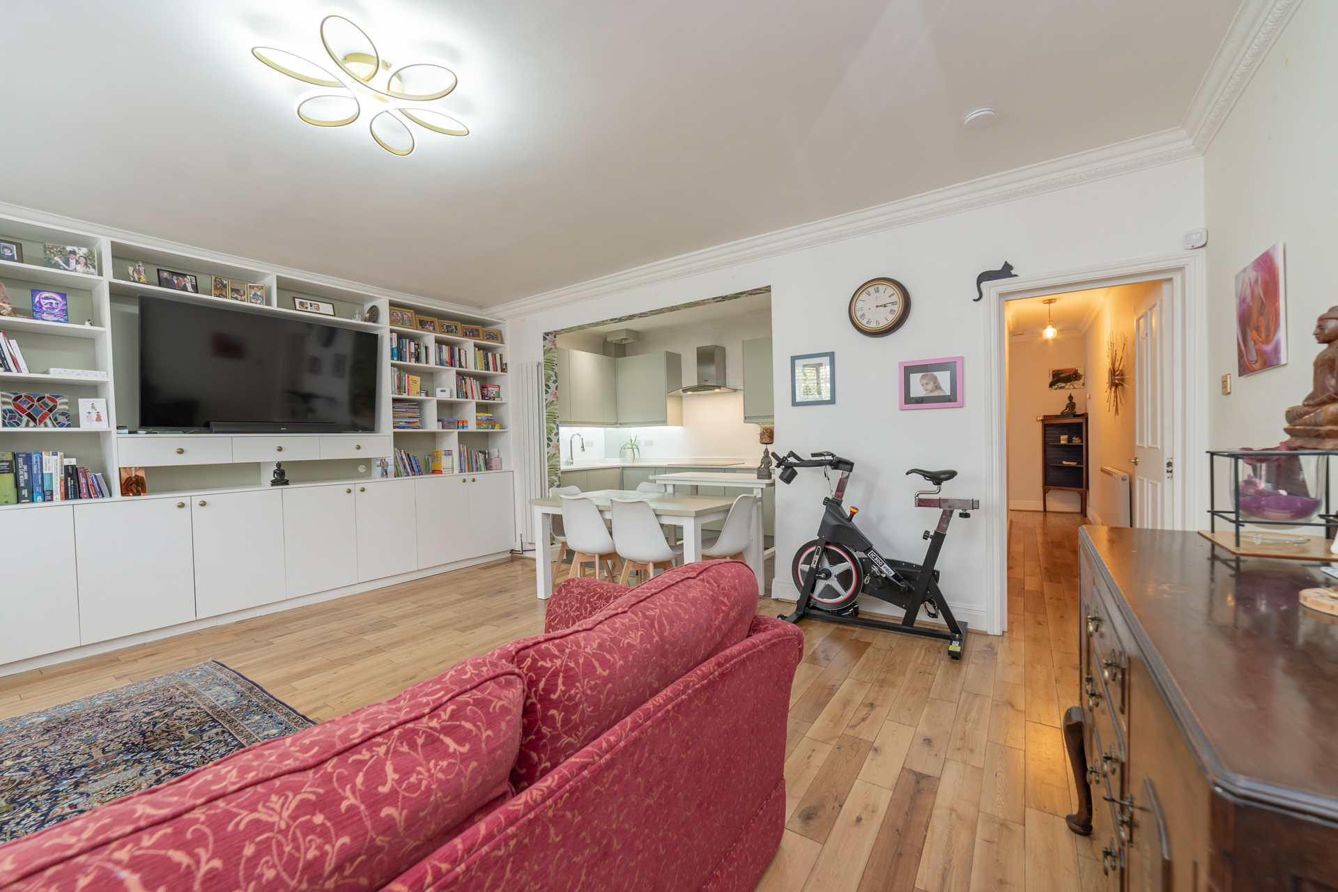 The flat comprises: own private entrance, hallway with door to a large understairs storage cupboard currently housing the washing machine and dryer, generous reception room with wood flooring and built in book shelves, modern kitchen with integrated appliances, primary bedroom with built-in wardrobes, second double bedroom also with built-in wardrobes, modern family bathroom and a large private south facing garden.