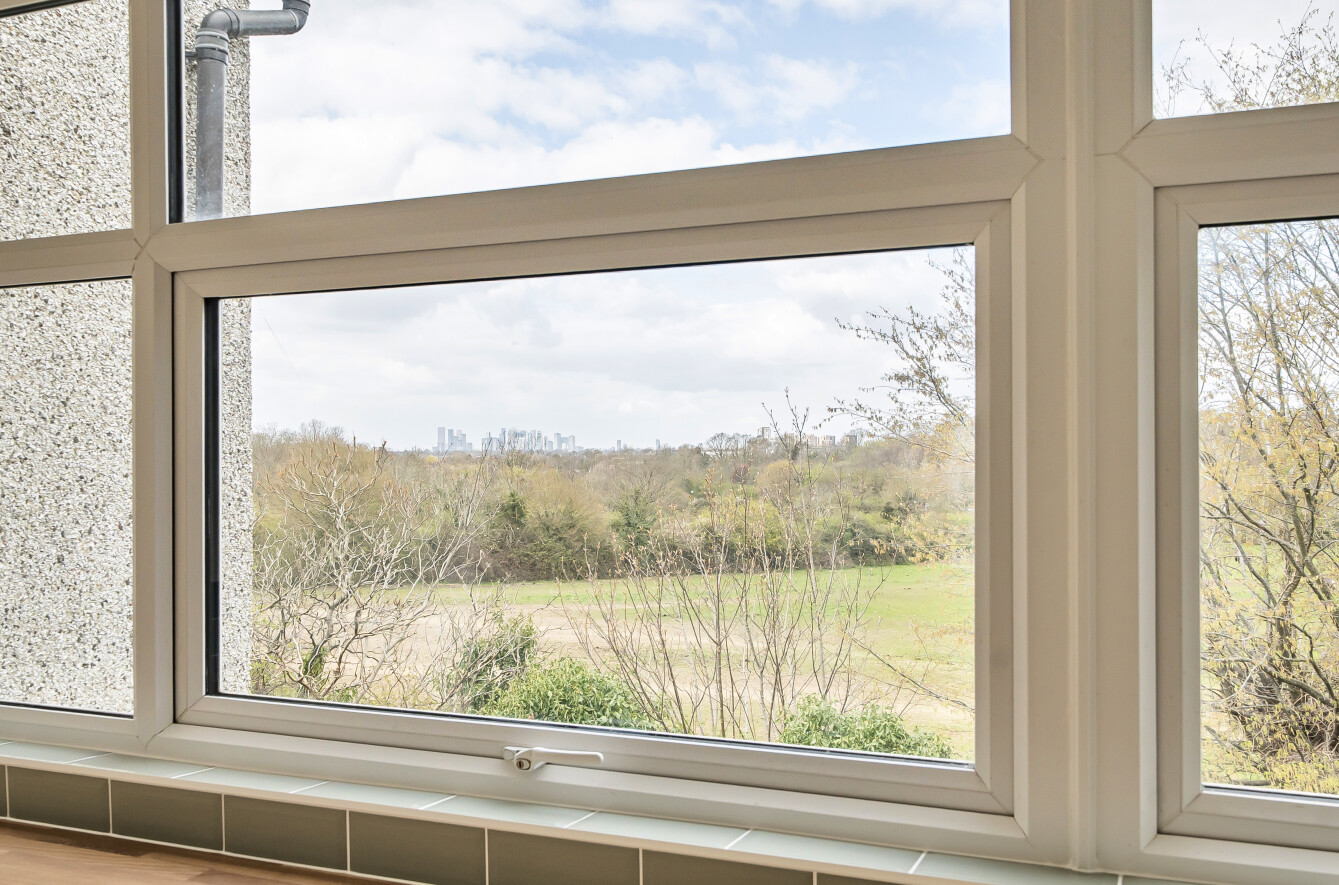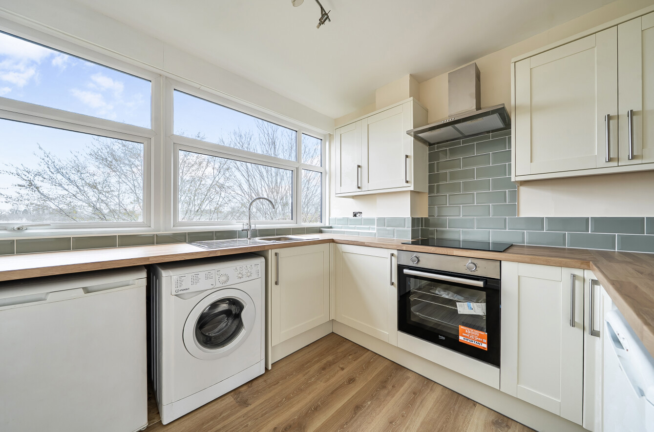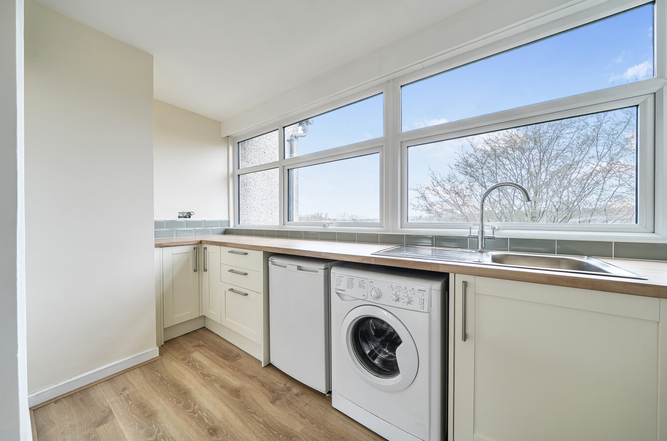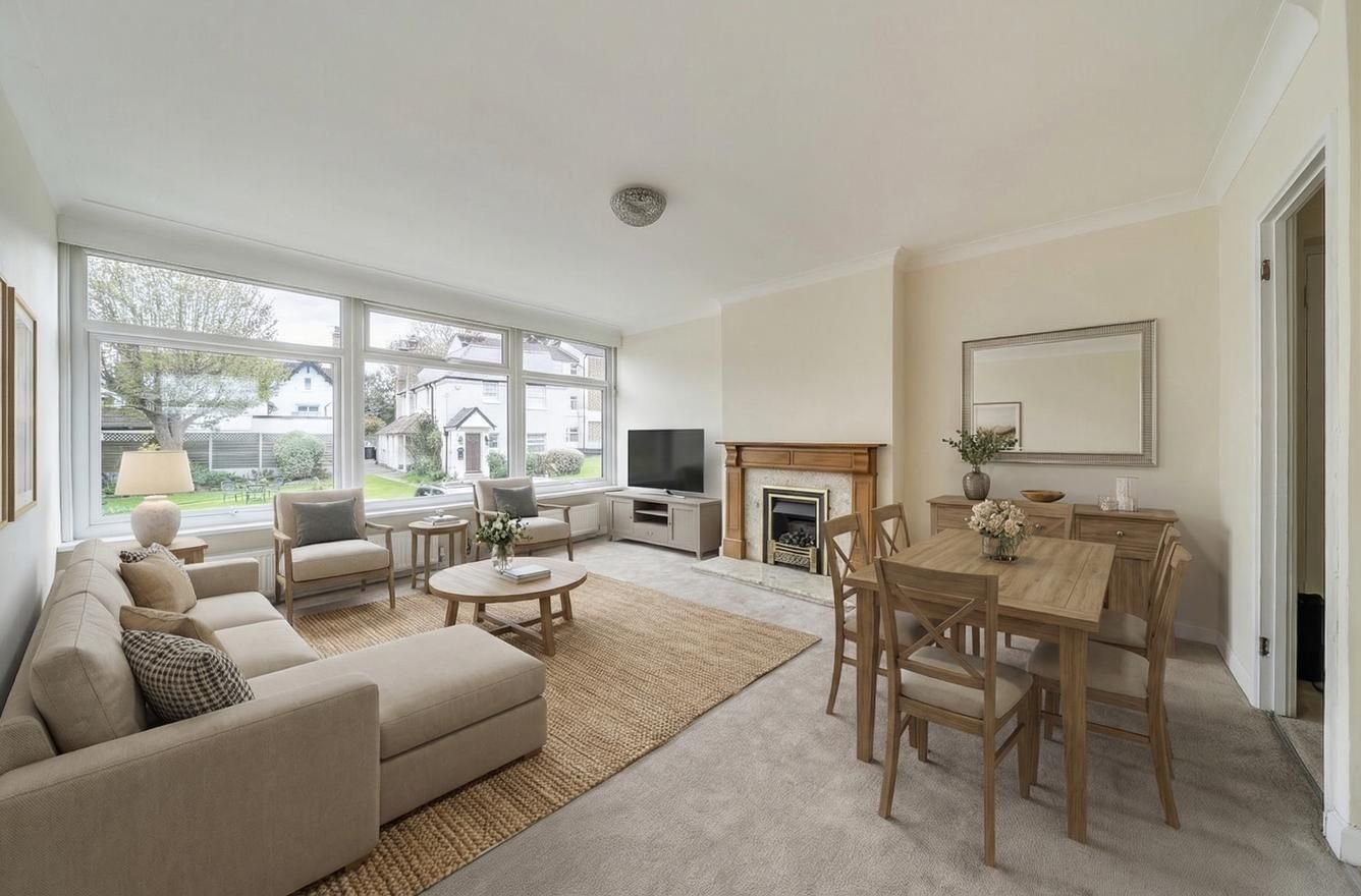 Living/Dining Room: A spacious (212 sq ft), light and bright room to the front of the property with large picture window overlooking the communal grounds. There is a gas fire as a focal point and space here for comfy seating as well as a dining table and chairs.