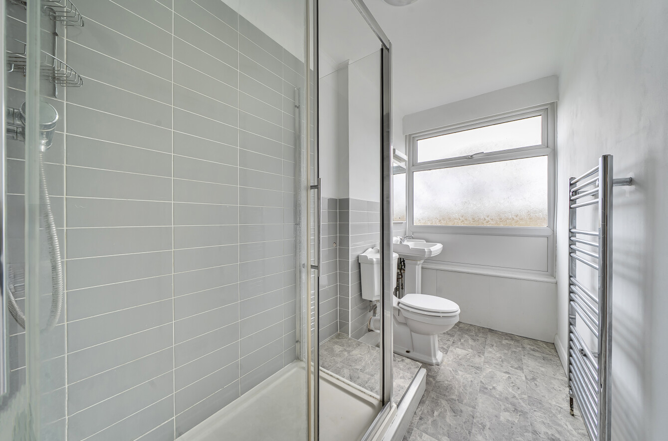 Shower Room: Fitted with a white suite, WC, pedestal wash basin and a walk in shower cubicle with wall mounted electric shower. The walls are part tiled, there is a chrome heated towel rail and window for light and ventilation.