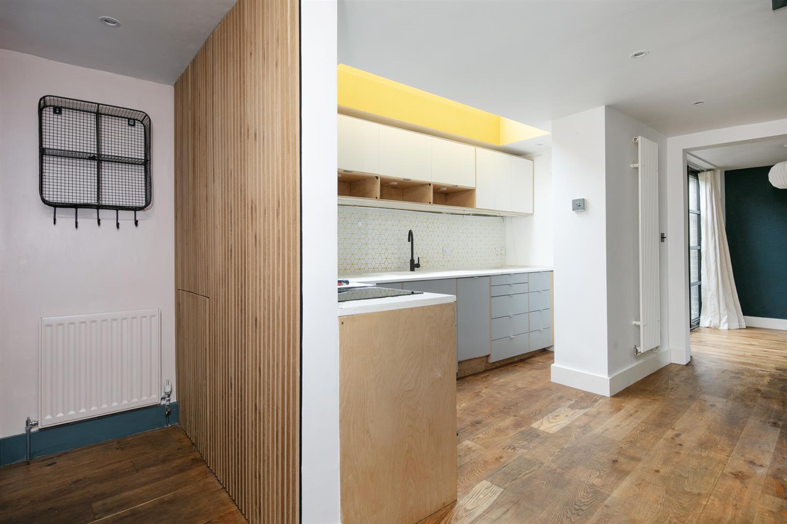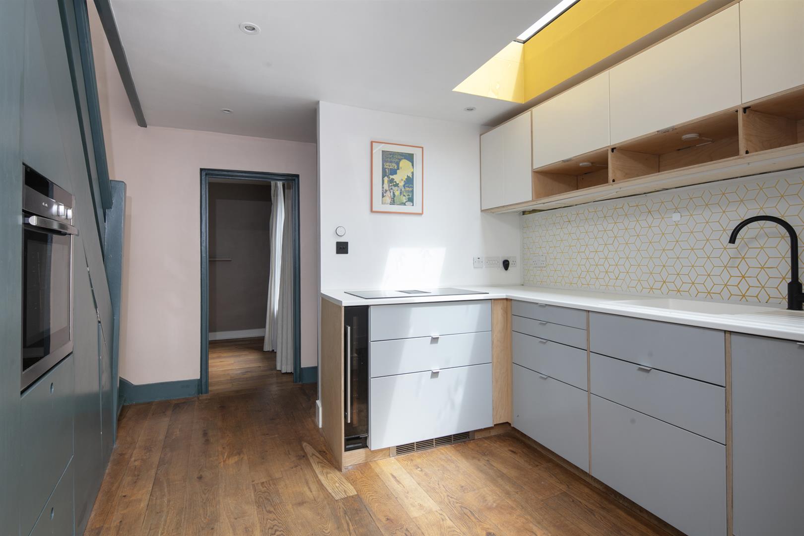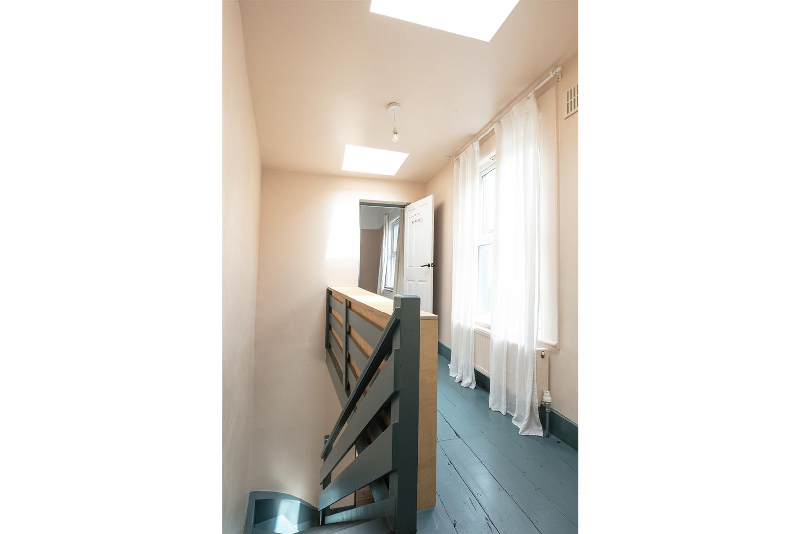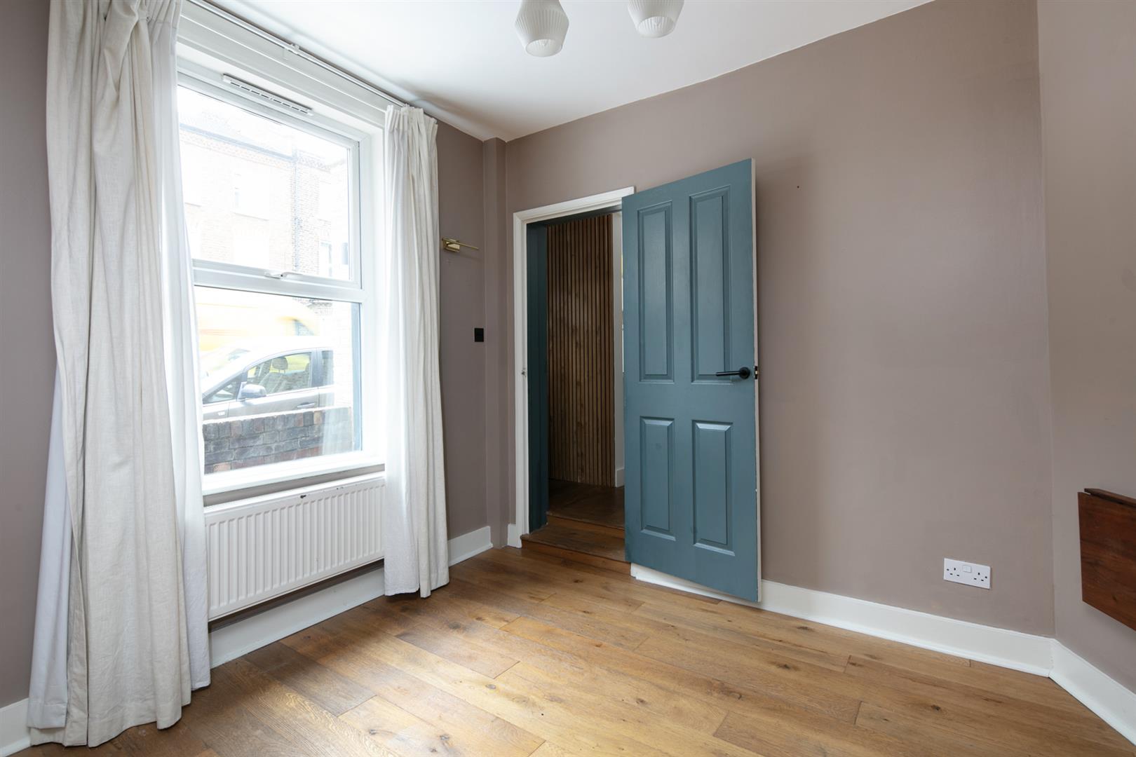 A handsome exterior with London stock brickwork greets you. An inner porch with modern oblong wooden panneling leads inward to your open plan kitchen. This enjoys a flood of light from a large skylight. The cabinets and tiling are tasteful and modern. A large dual aspect reception room adjoins to the right with access to two separate patios. Completing the ground floor is a double bedroom which sits the far side of the entrance hall. Upward bound you find a bright, spacious landing with front aspect sash window and shelving. Two futher double bedrooms sit off the landing, as does a super slick bathroom with funky matt black fixtures, half bath and dishy tiling. The wc has been kept separate to aid morning traffic.