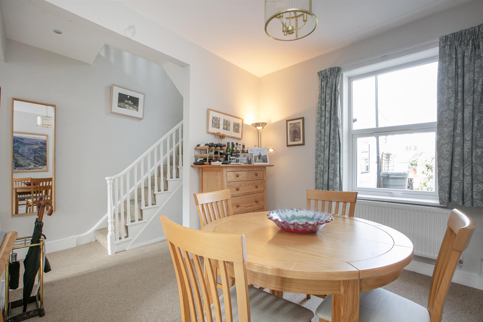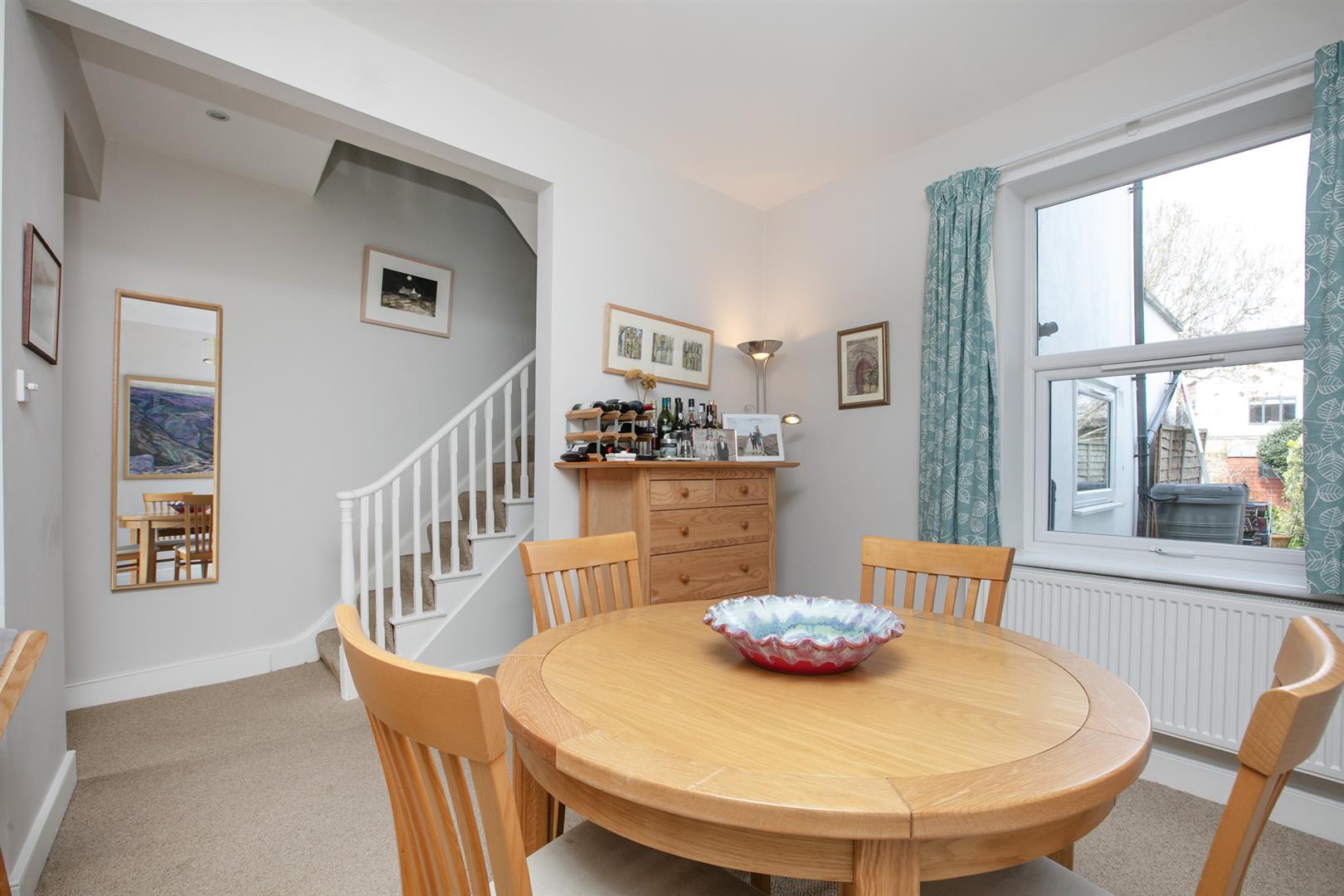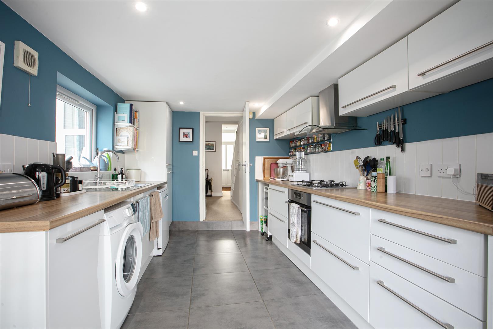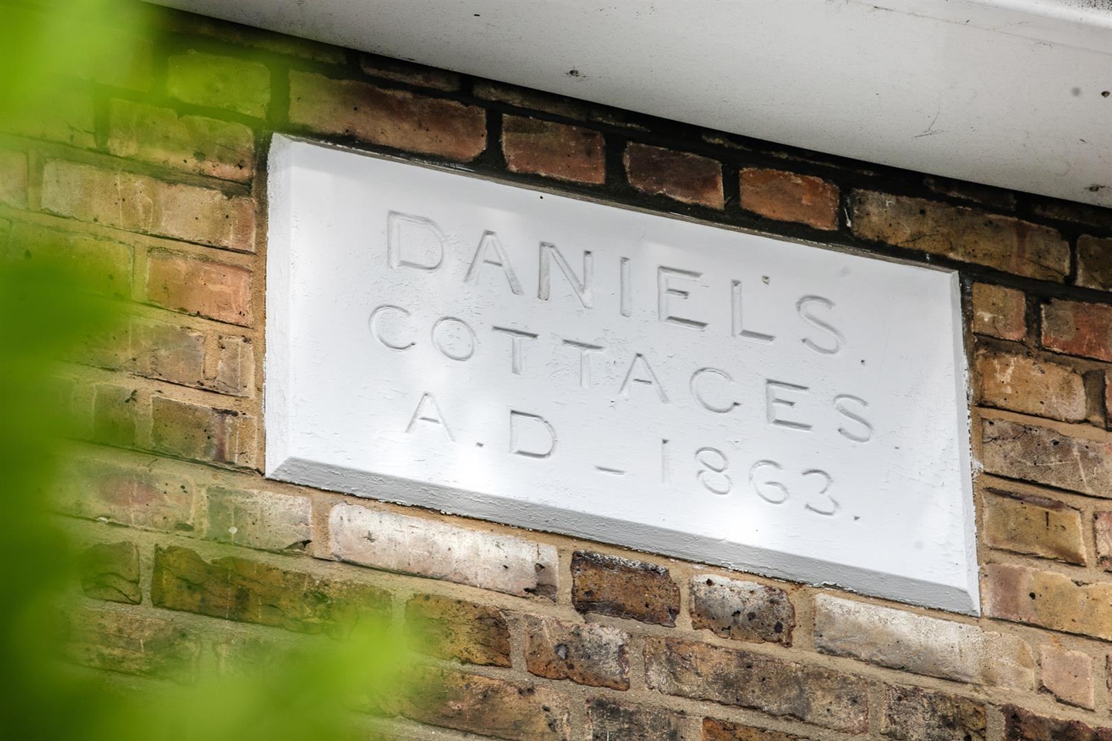 The handsome exterior enjoys the dappled shade of a mature tree and is crowned in the original motif 'Daniel's Cottages' from 1863. A carpeted hall leads to your semi-open plan living area which runs double length to afford comfortable lounging, dining and entertaining space. A leafy private front aspect and further rear-facing window ensures a light and airy vibe and there is plentiful bespoke cabinetry. A handy understairs storage point precedes your generous kitchen/diner which sits down a single step and offers a dual aspect. Generous cabinet and counter-space on either side stretches confidently and there's a a four ring gas hob, oven and space for all the white goods. A family dining area precedes French doors which open out to a York stone patio from whence you can enjoy your noticeably lush lawn. It's bordered with fragrant mature shrubs and posies and there's a greenhouse raised planters, shed and further neat rear patio. Upward bound you find the master bedroom fronting the street through two large casement windows. Bespoke blue wardrobes complement perfectly the lovely pale blue walls. A modern mostly tiled bathroom comes next with trough-style wash hand basin, tiled bath, modern loo and heated towel rail. Bedroom two faces rear and will comfortably house a double bed. The third and final bedroom, currently arranged as a wonderful study/music room, is bathed in light from two Velux and a further rear-facing window.