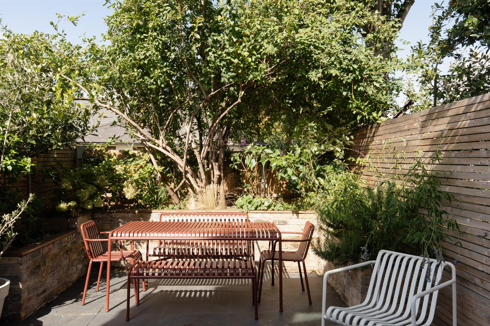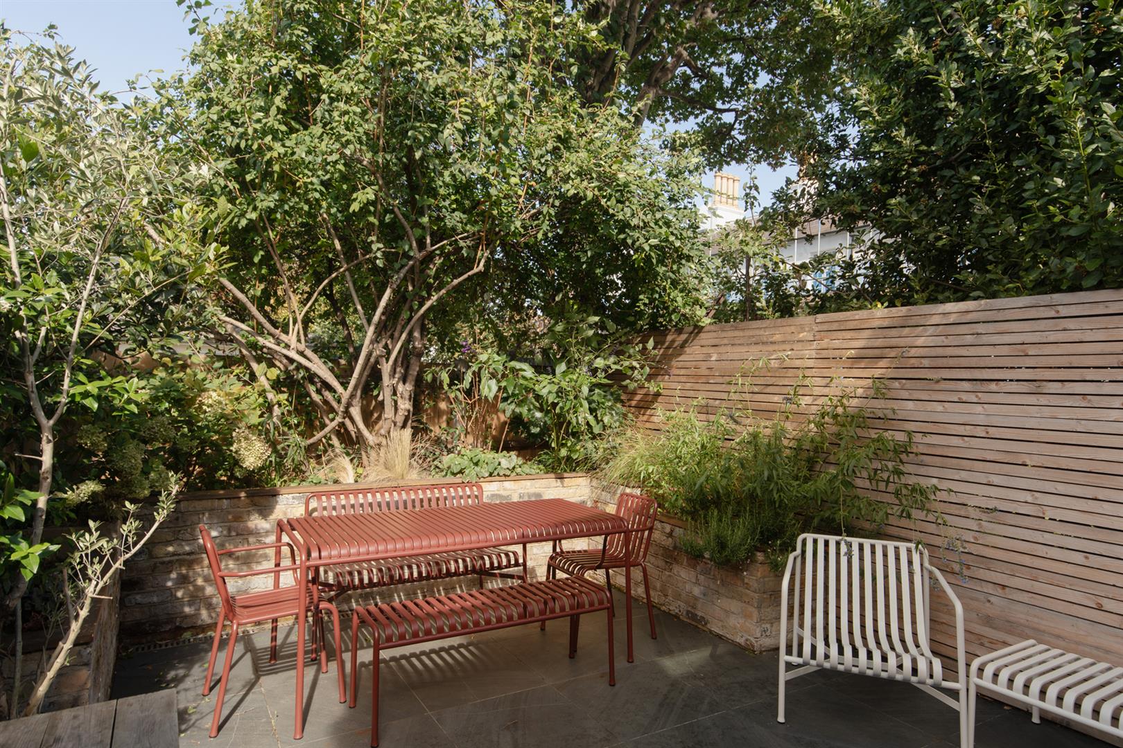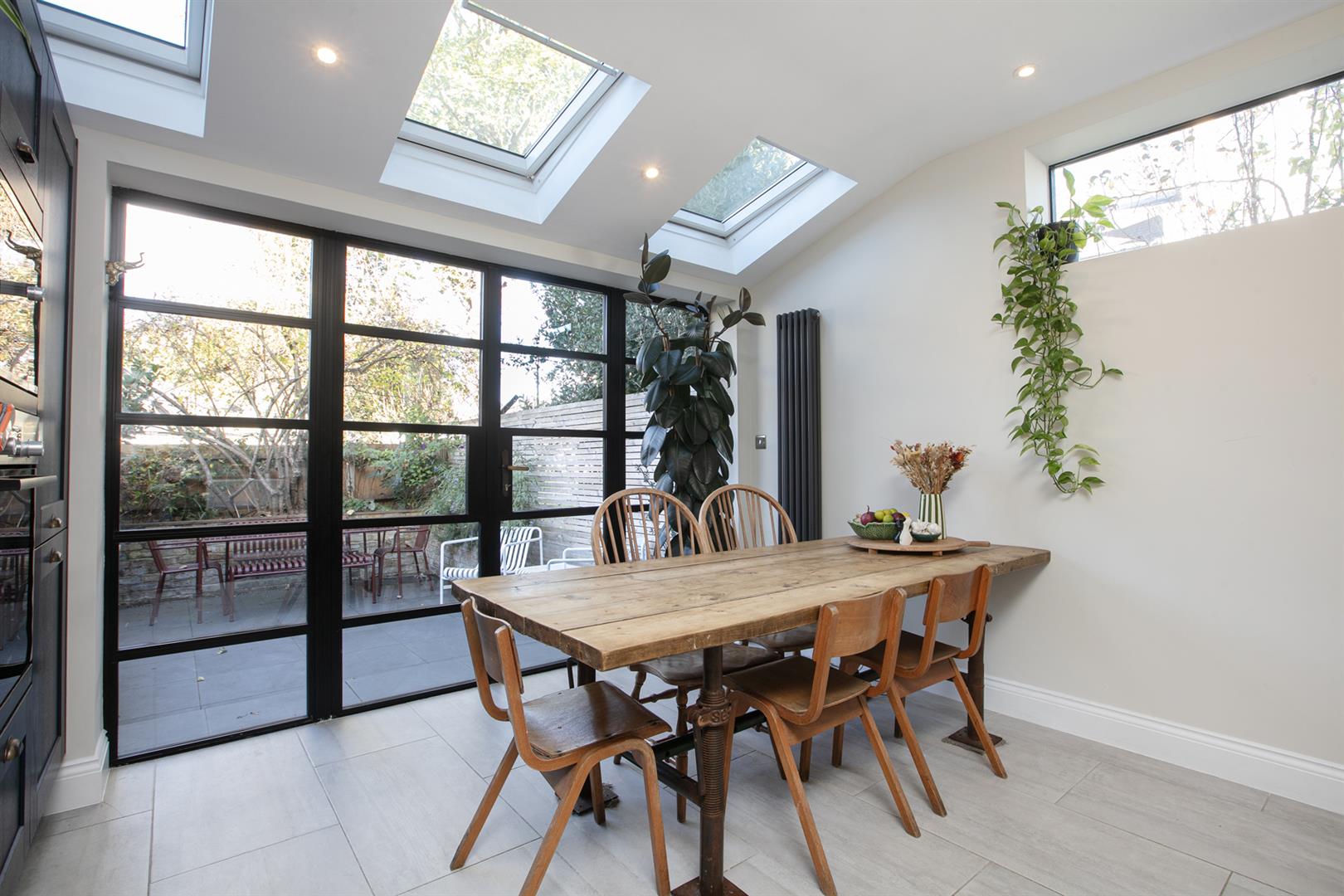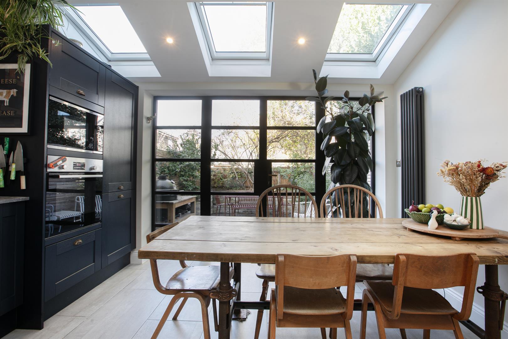 A comfortable lounge precedes the breakfast bar which will house five for morning coffee. A step leads down to your wonderful kitchen which dons wooden shaker-style wooden cabinets running into an L. These are crowned in snazzy mottled grey Quartz counters. Appliances include a four ring induction hob, integrated dishwasher, washing machine, fridge/freezer, microwave and oven. Floor-to-ceiling Crittall doors frame the paved garden beautifully. Three Velux and two side-aspect picture windows keep the living space bright and airy. Outside you enjoy a raised planter on three sides hosting bay tree, Jasmine and Hydrangea to name but a few.