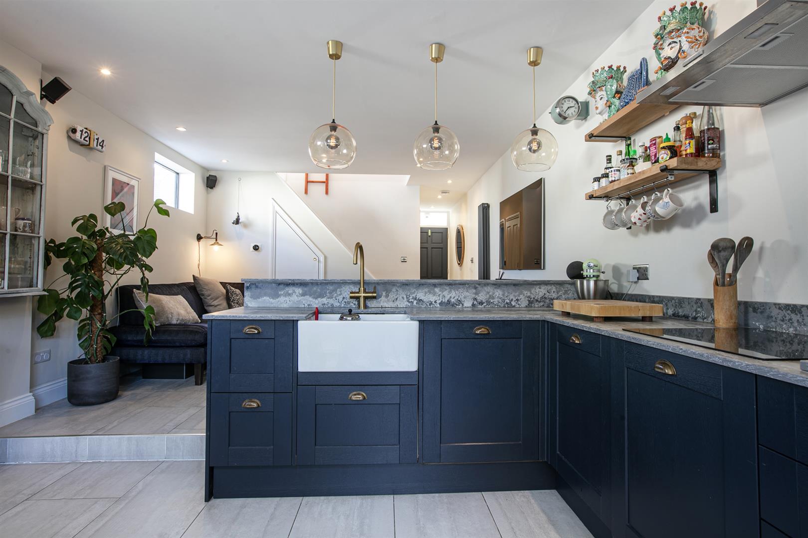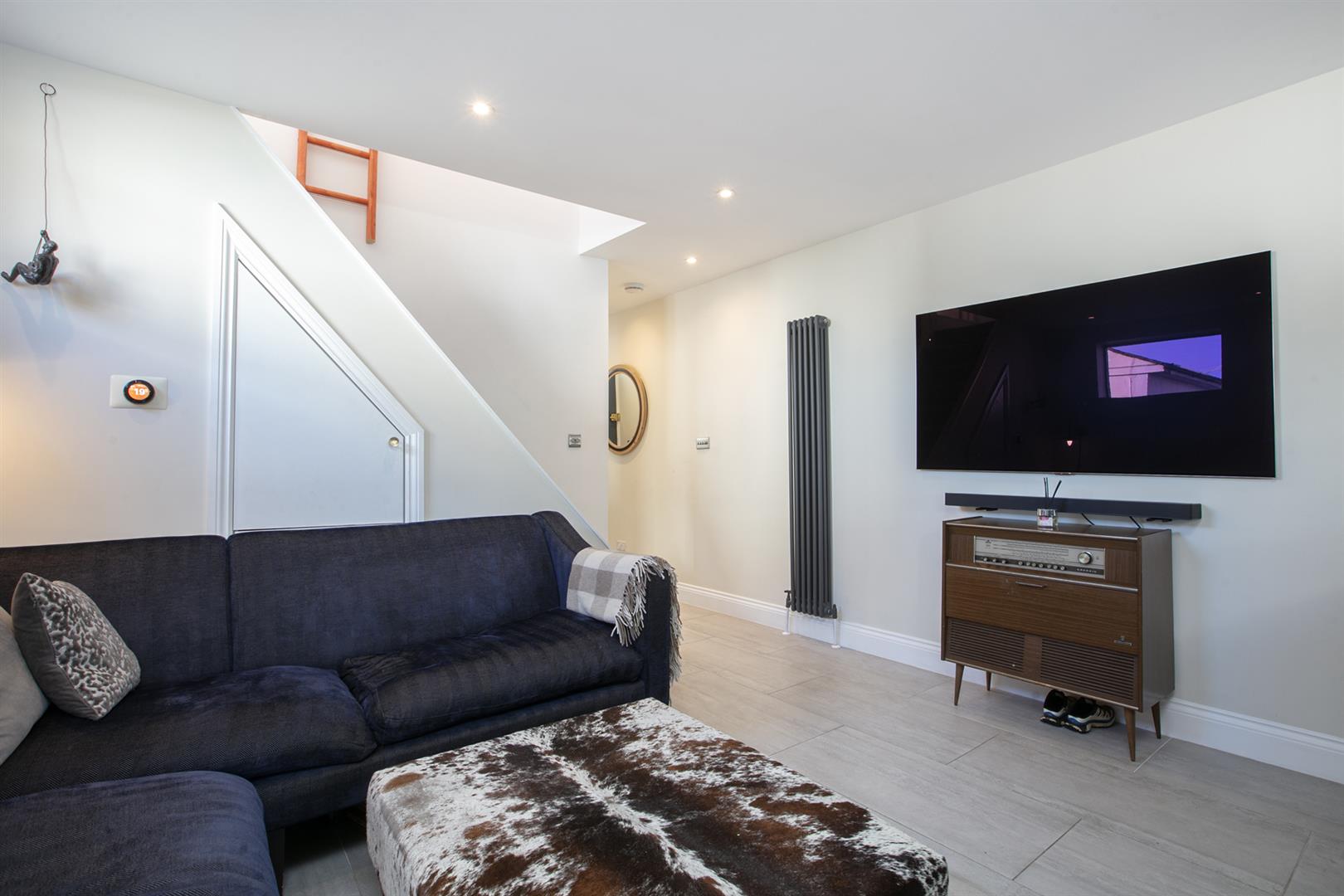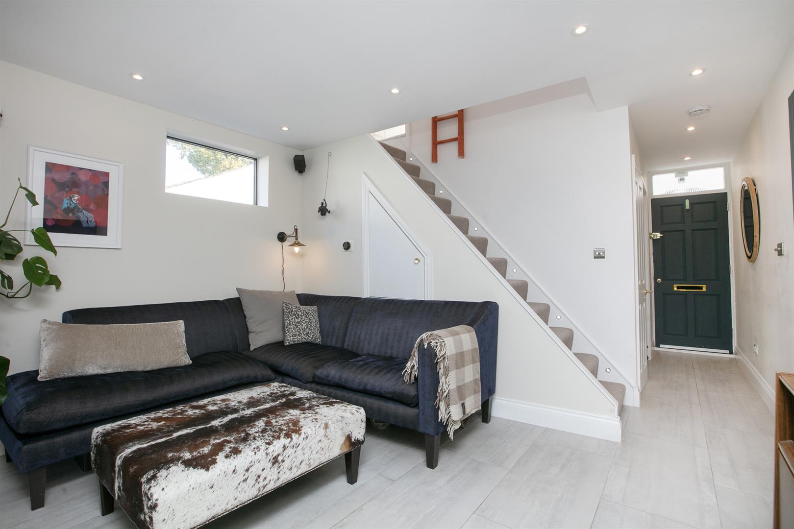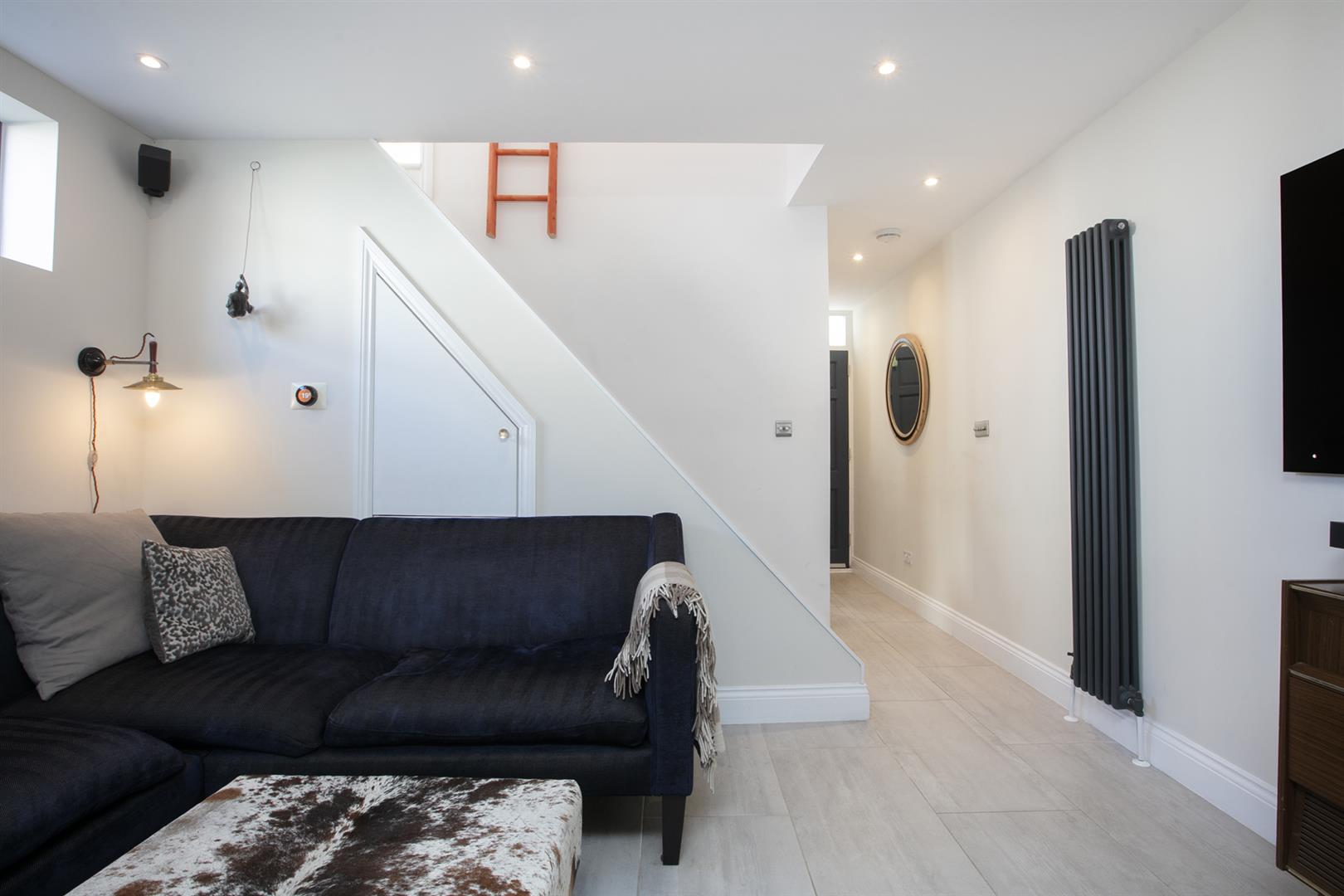 Enter into a tiled hall with a neat, front-facing guest bedroom on your right hand side. It's a bright room with fitted storage, adjoining ensuite shower room. louvered blinds and yummy 'Hague Blue' walls. There's a handy guest wc further along the hall with wonderful ostrich-themed wallpaper from 'House of Hackney'. The rest of the ground floor widens to the full width of the building to offer a spacious modern and beautifully laid-out living space.