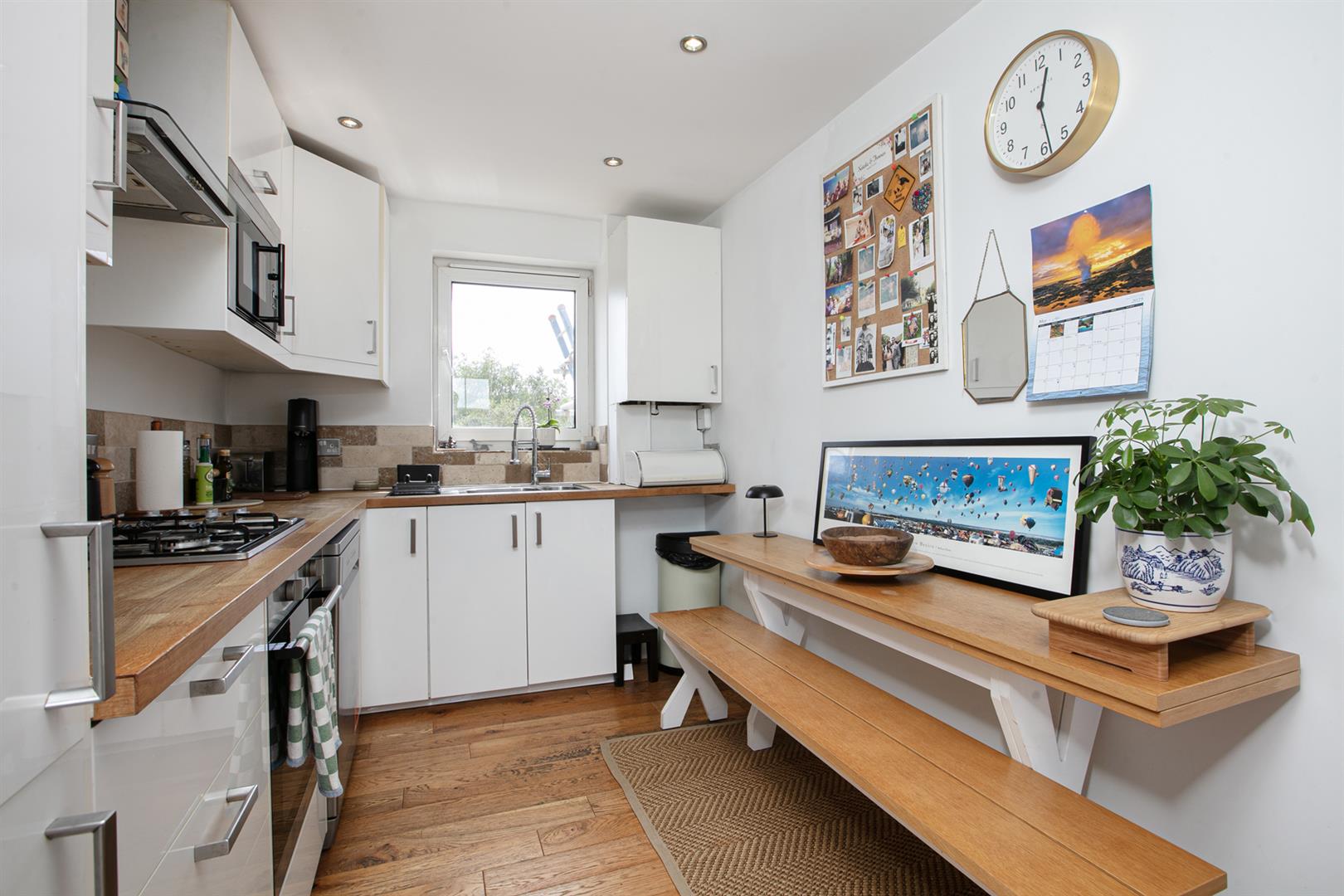 Steps lead upward to a shared entrance. The inner hall is carpeted and supplies access to the lovely communal garden. It's a leafy spot with tonnes of space for sunbathing and hobnobbing with the neighbours. Heading upward to the second floor you find your inner hall boasts solid oak flooring, crisp white decor and access to a handy storage loft. The fab L-shaped living space sits to the right and enjoys an aspect to both front and rear. Twin front aspect double glazed sash, each with louvered blinds, supply sweeping views toward the Shard and Canary Wharf with the leafy expanse of Nunhead Green sitting happily in the foreground. The lounge is bright and comfortable and leads to the modern, well-stocked kitchen/diner. Here you find solid counters, four ring gas hob, stainless steel sink, oven and integrated fridge/freezer.