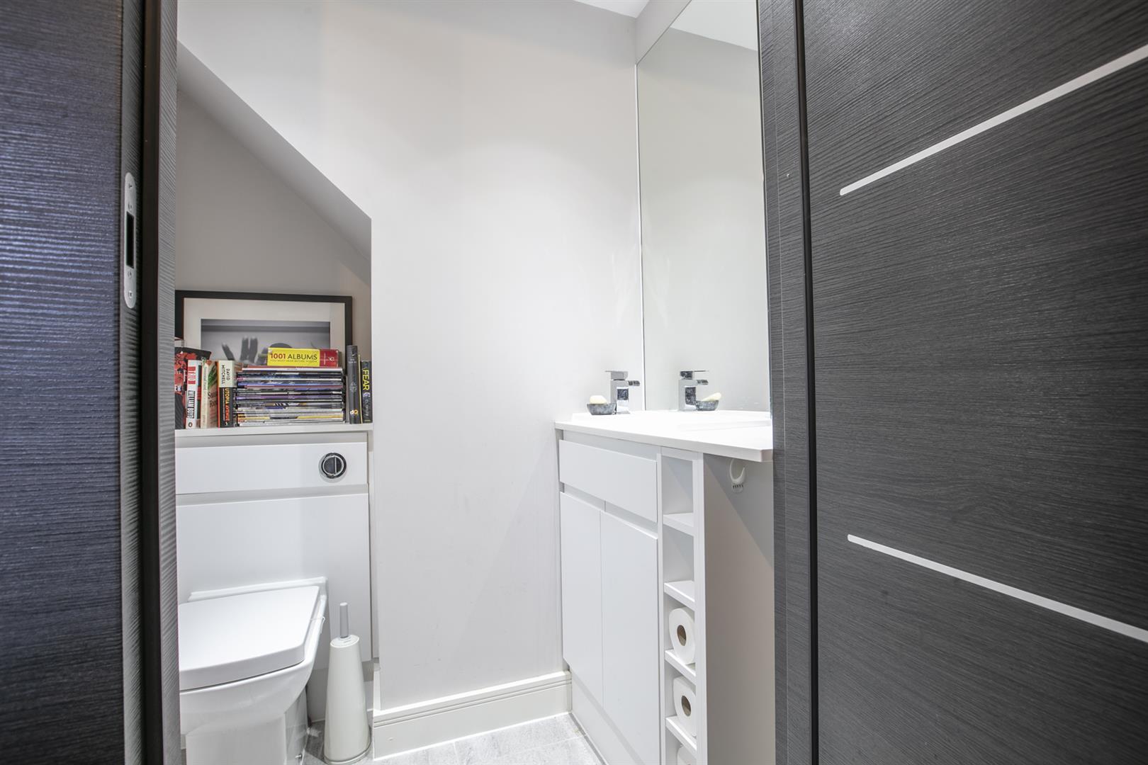 The exterior enjoys some lovely period detail including an arched entrance lobby which is shared with one other property. Once inside the house you meet wonderful whitewash wooden flooring running the full length of the ground floor. Crisp grey walls compliment it perfectly. A handy guest with contemporary fittings, loo, wash hand basin and storage is accessed through a wide modern door with fancy handles. Proceeding this is a well appointed seating area which leads in turn to the kitchen. Plentiful cabinets and counters run into an L on the rear wall and your slick appliances include dishwasher, fridge freezer, double oven and a four ring hob. There's even an integrated vacuum system built into the wall! A deep understairs storage will house all your beloved tatt.