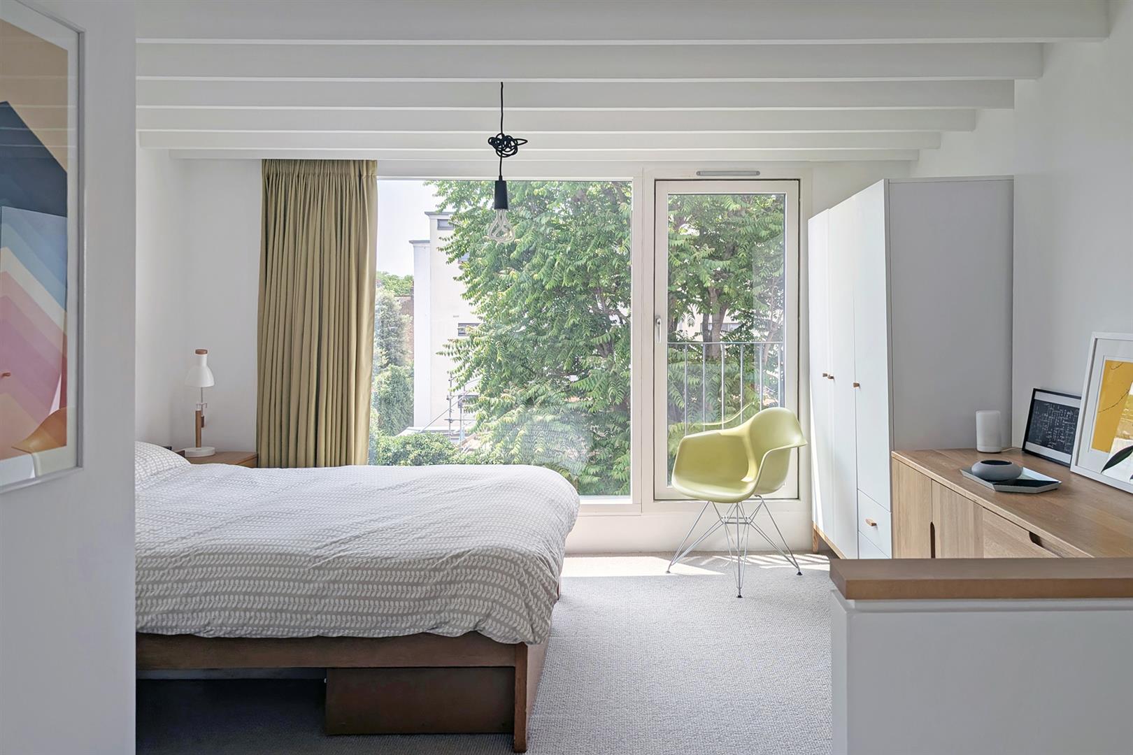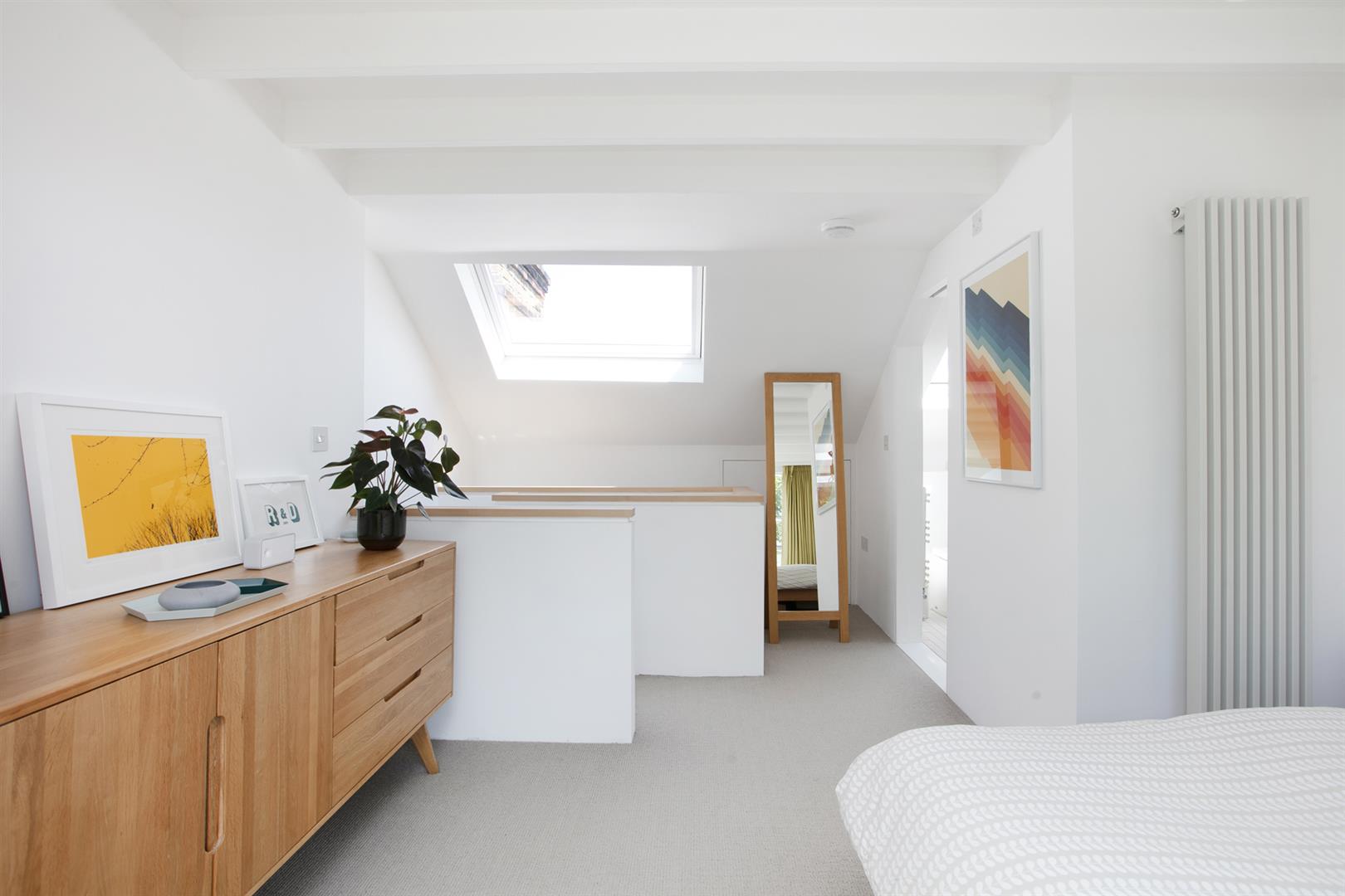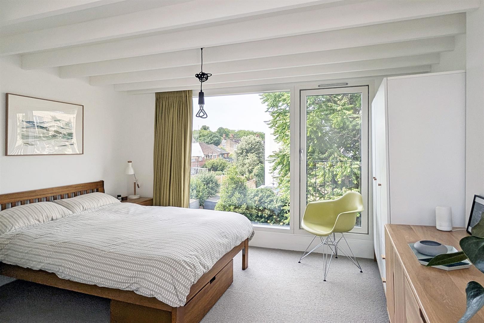But it's the top floor that really steals the show. The loft extension has been done with real care, creating a peaceful bedroom sanctuary with a Juliet balcony and a big picture window that looks out over the treetops. There's plenty of storage tucked into the eaves, a Velux window for extra sunshine, and a sleek en suite shower room that makes it feel like a hotel suite at home. Deep low-level loft storage supplies a perfect hiding space for the Christmas tree and Uni notes.