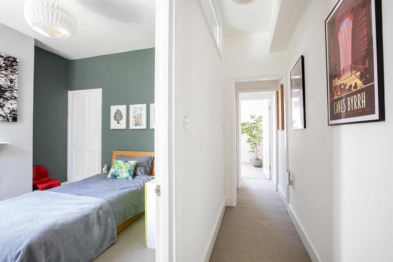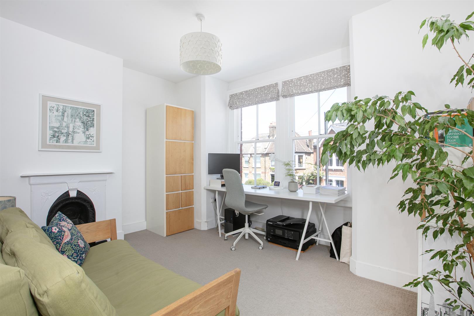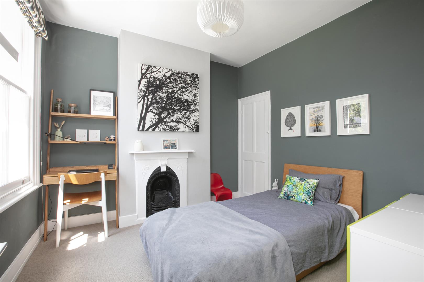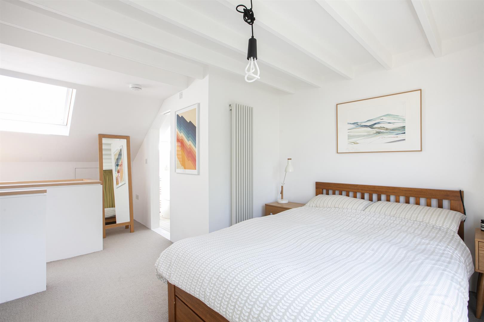 But it's the top floor that really steals the show. The loft extension has been done with real care, creating a peaceful bedroom sanctuary with a Juliet balcony and a big picture window that looks out over the treetops. There's plenty of storage tucked into the eaves, a Velux window for extra sunshine, and a sleek en suite shower room that makes it feel like a hotel suite at home. Deep low-level loft storage supplies a perfect hiding space for the Christmas tree and Uni notes.