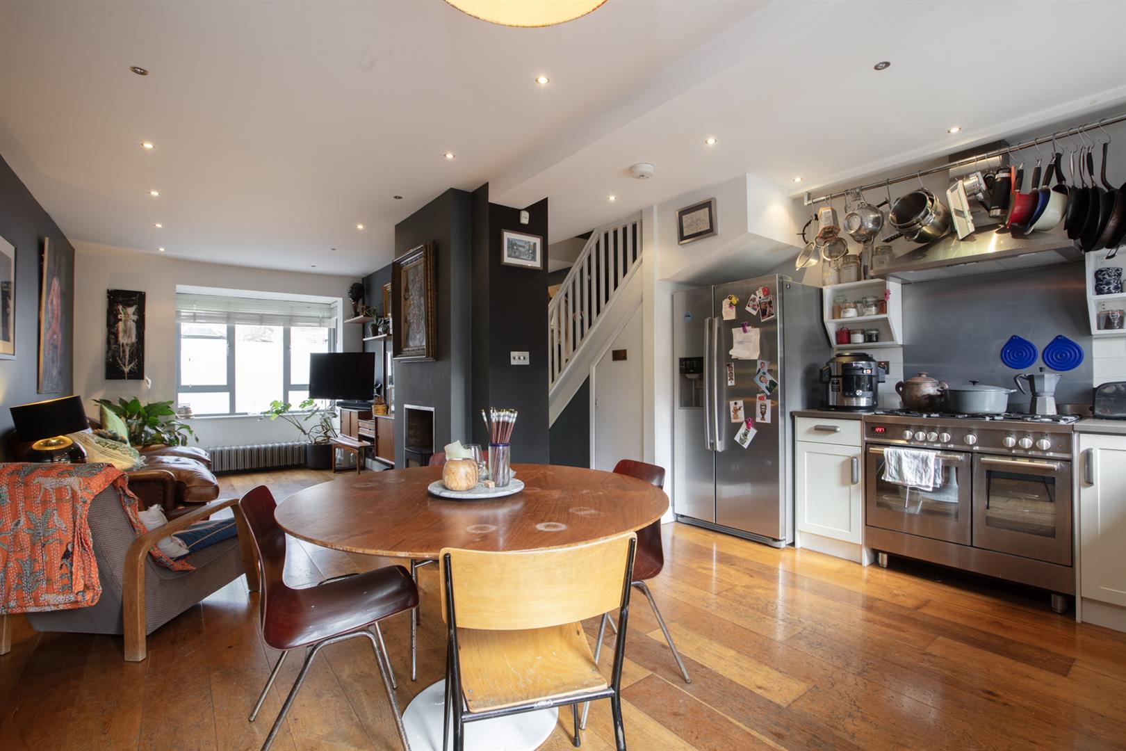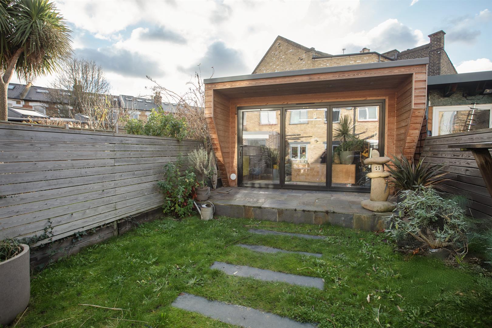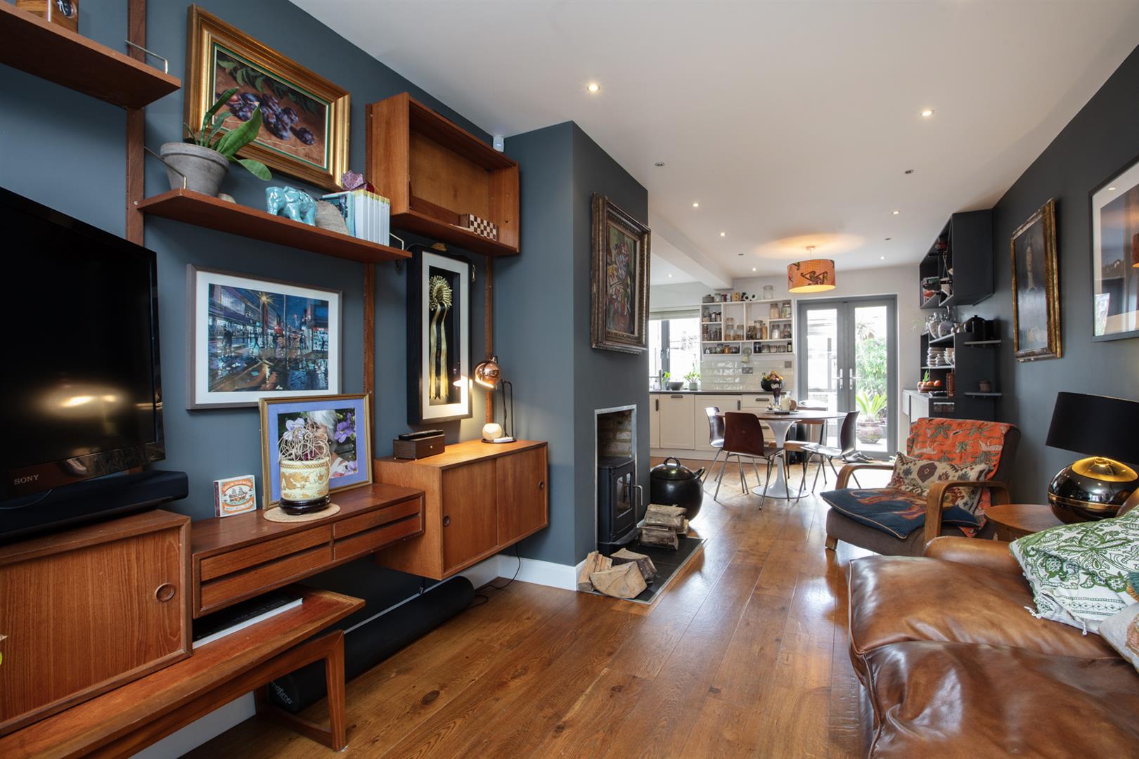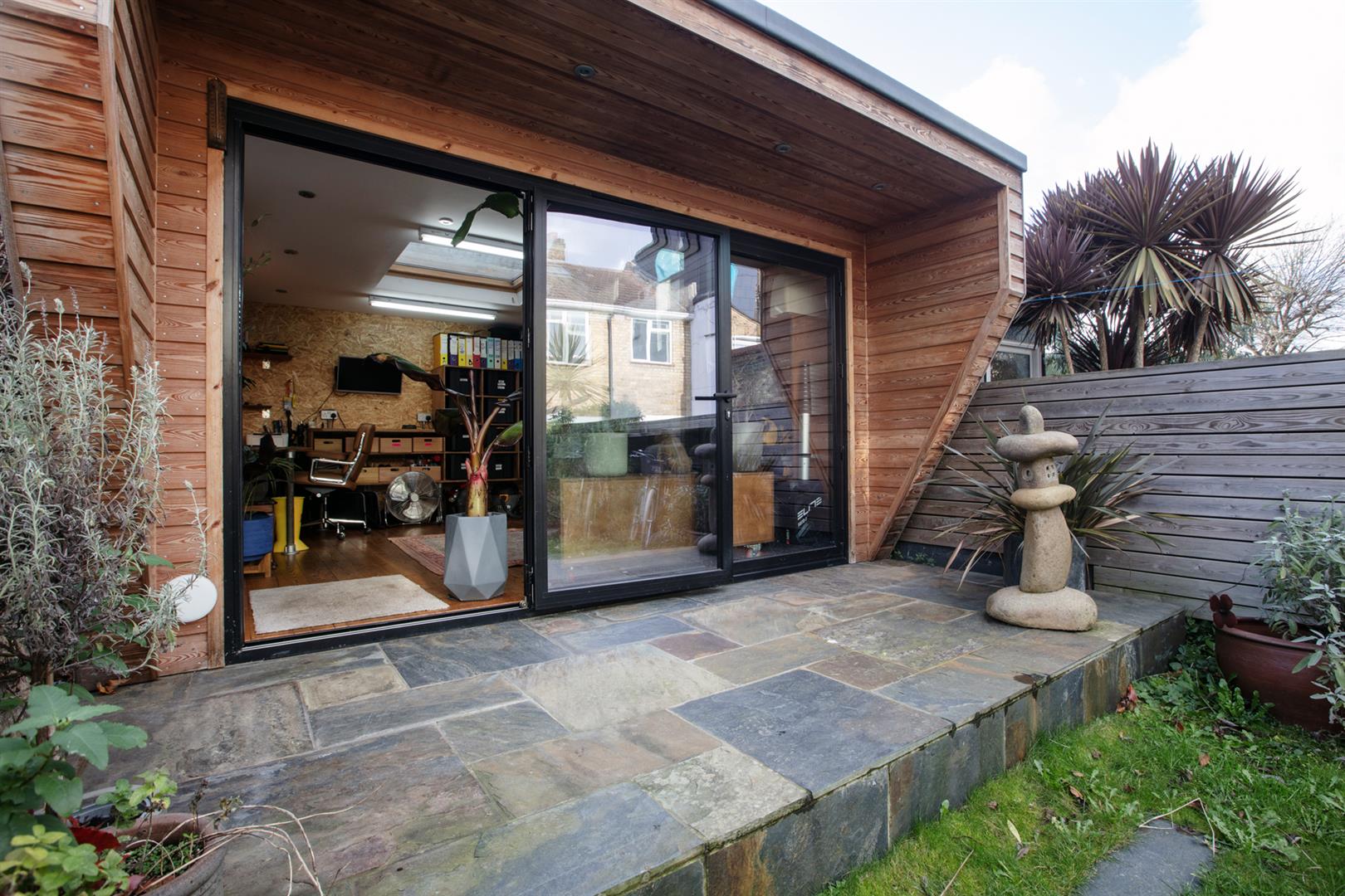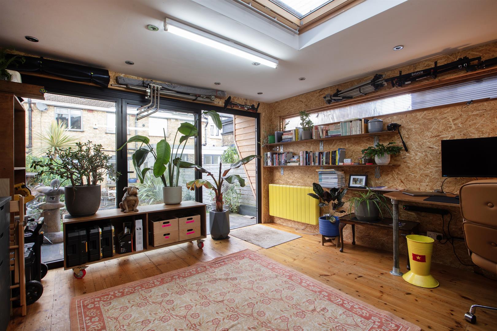 The smart exterior sits behind a mature tree and bears the name next to the contemporary door. Enter to the hall to find handsome wooden floors and neutral walls. The stairs is painted white and has a Sisal runner. Head right to meet the lounging area with square bay, cast iron school house radiators and a beautiful multi fuel stove. This runs uninterrupted to the dining area and kitchen which spans the full width of the house. Quartz counters, cream cabinets and a rather impressive five ring gas range will woo you at first glimpse. There's an integrated dishwasher and space left for an American fridge/freezer. The space wraps round to the rear of the hall offering complete ease of access throughout. Your garden is reached through cool aluminium French doors where you first meet a paved patio. A generous lawn then keeps you company up the garden path to that splendid garden studio which boasts rustic wooden walls and a large skylight and folding glass doors for tonnes of light. The garden soaks in abundant southerly light throughout the day. It's a little micro-climate where the flowers and wildlife thrive.