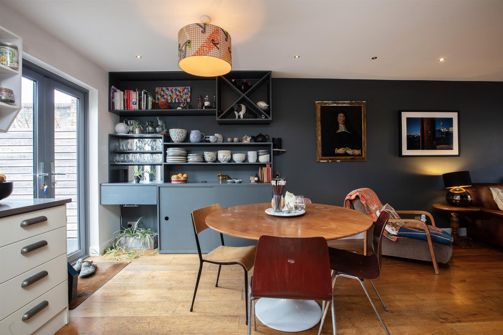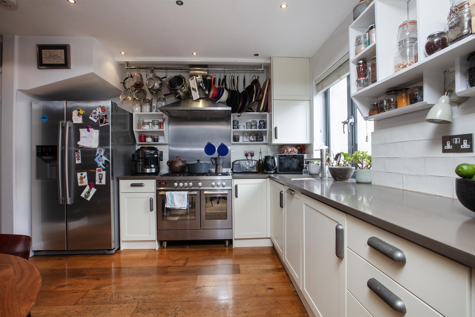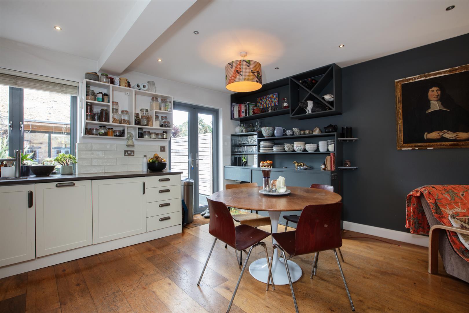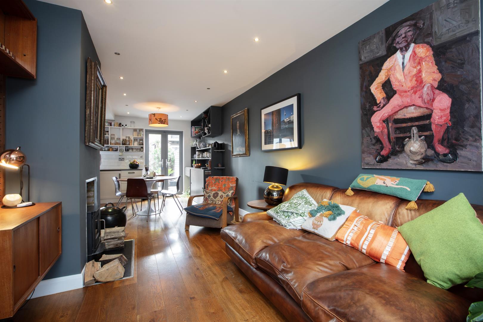 The smart exterior sits behind a mature tree and bears the name next to the contemporary door. Enter to the hall to find handsome wooden floors and neutral walls. The stairs is painted white and has a Sisal runner. Head right to meet the lounging area with square bay, cast iron school house radiators and a beautiful multi fuel stove. This runs uninterrupted to the dining area and kitchen which spans the full width of the house. Quartz counters, cream cabinets and a rather impressive five ring gas range will woo you at first glimpse. There's an integrated dishwasher and space left for an American fridge/freezer. The space wraps round to the rear of the hall offering complete ease of access throughout. Your garden is reached through cool aluminium French doors where you first meet a paved patio. A generous lawn then keeps you company up the garden path to that splendid garden studio which boasts rustic wooden walls and a large skylight and folding glass doors for tonnes of light. The garden soaks in abundant southerly light throughout the day. It's a little micro-climate where the flowers and wildlife thrive.