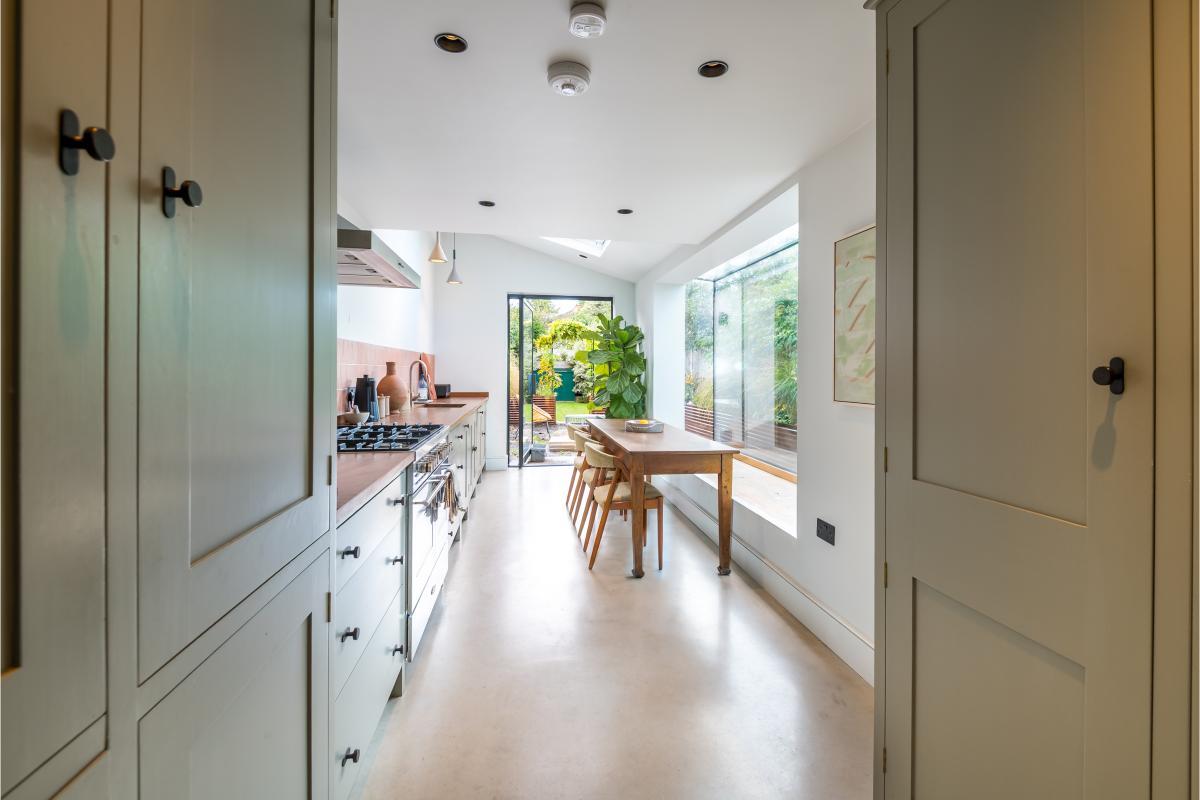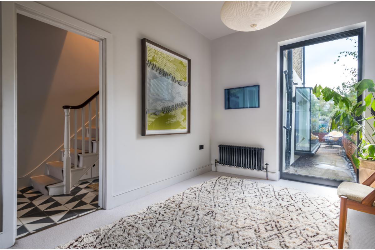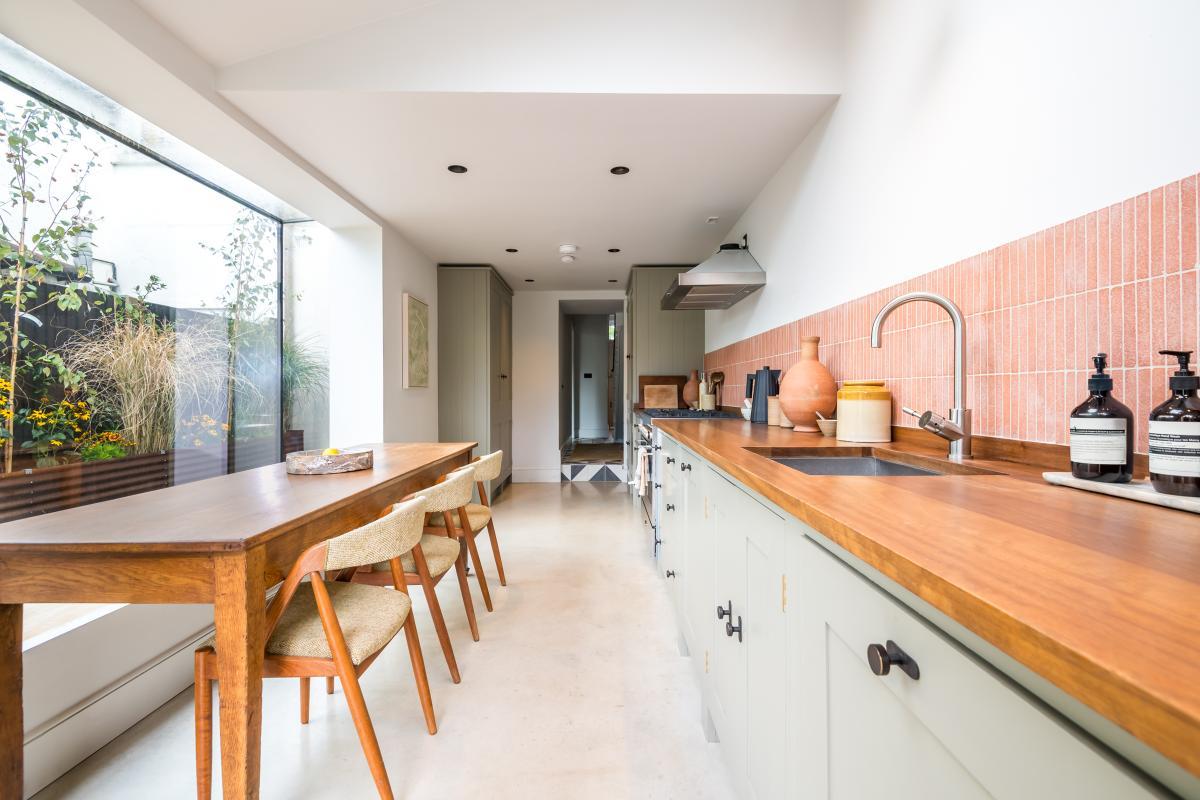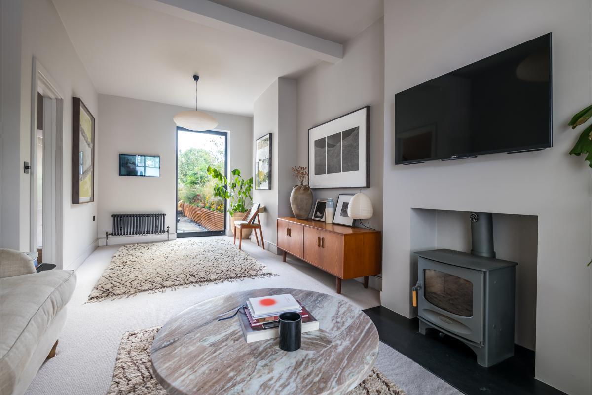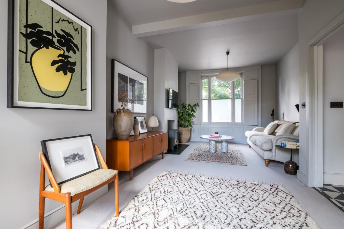 The home opens into a generous double reception room, with soft natural tones, large sash windows, and a wood-burning stove creating a welcoming atmosphere. At the rear, a striking kitchen and dining area extends across the width of the house, featuring bespoke cabinetry, a statement terracotta tiled splashback, and expansive glass doors that flood the space with light while leading directly onto the landscaped garden. The garden itself is cleverly zoned, with a lush lawn, seating area, and mature planting for year-round enjoyment. Upstairs, two double bedrooms are complemented by a stylish family bathroom complete with a freestanding bath and contemporary fixtures. Ample storage and refined finishes throughout complete this impressive home.