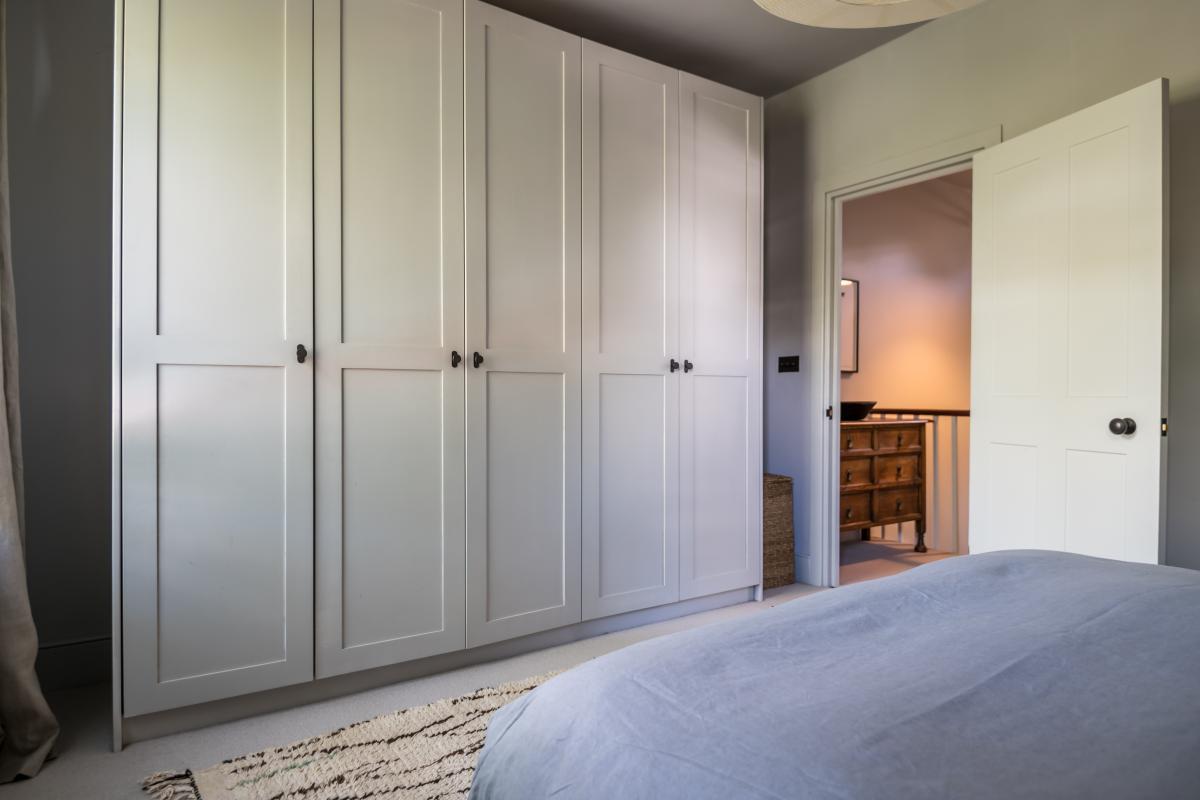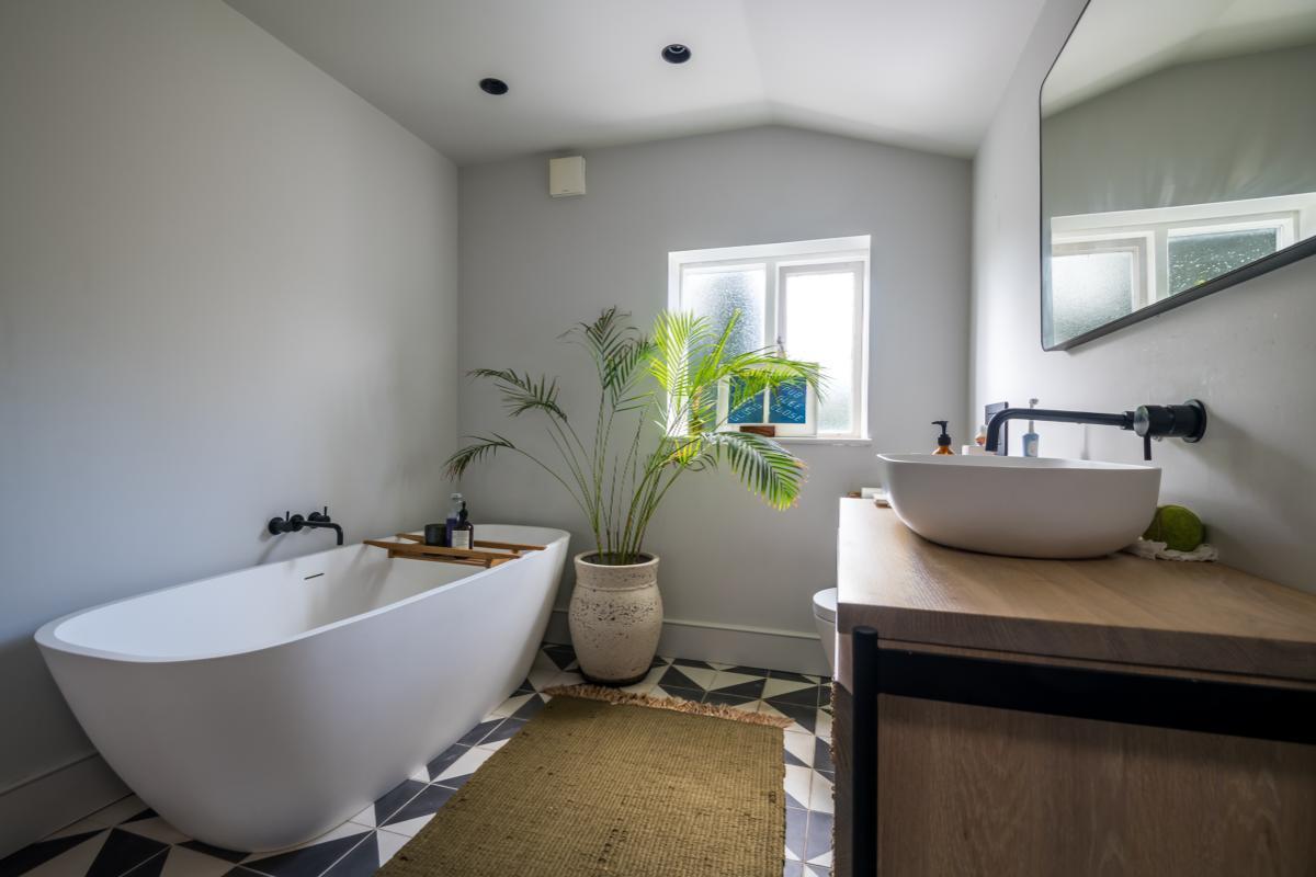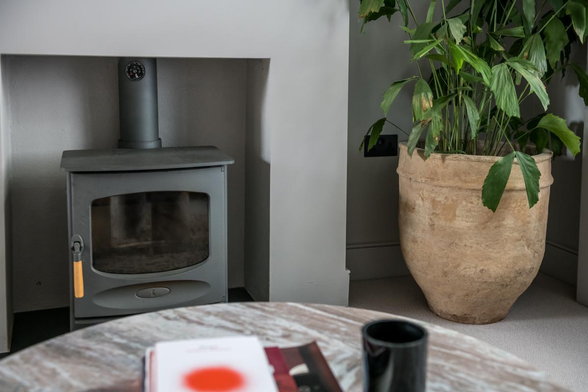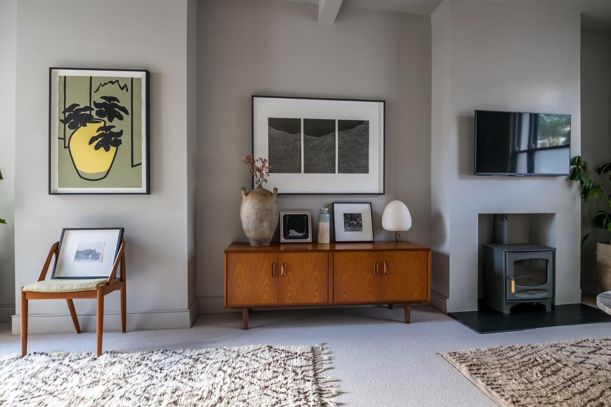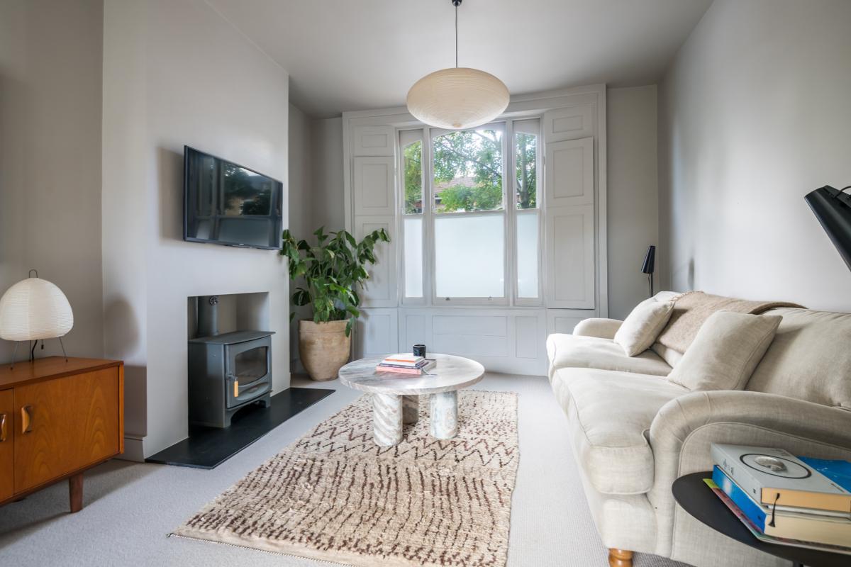 The home opens into a generous double reception room, with soft natural tones, large sash windows, and a wood-burning stove creating a welcoming atmosphere. At the rear, a striking kitchen and dining area extends across the width of the house, featuring bespoke cabinetry, a statement terracotta tiled splashback, and expansive glass doors that flood the space with light while leading directly onto the landscaped garden. The garden itself is cleverly zoned, with a lush lawn, seating area, and mature planting for year-round enjoyment. Upstairs, two double bedrooms are complemented by a stylish family bathroom complete with a freestanding bath and contemporary fixtures. Ample storage and refined finishes throughout complete this impressive home.