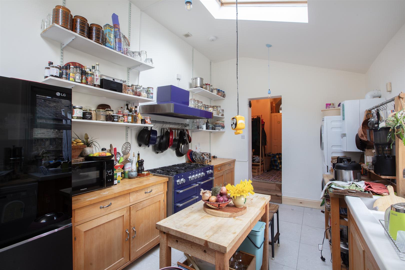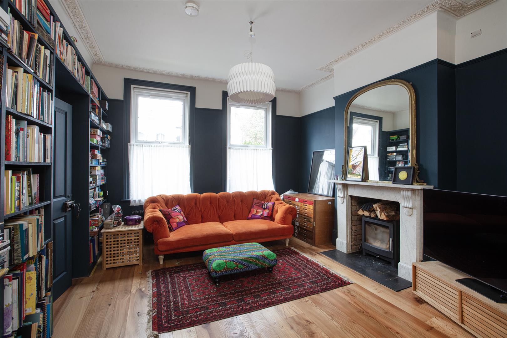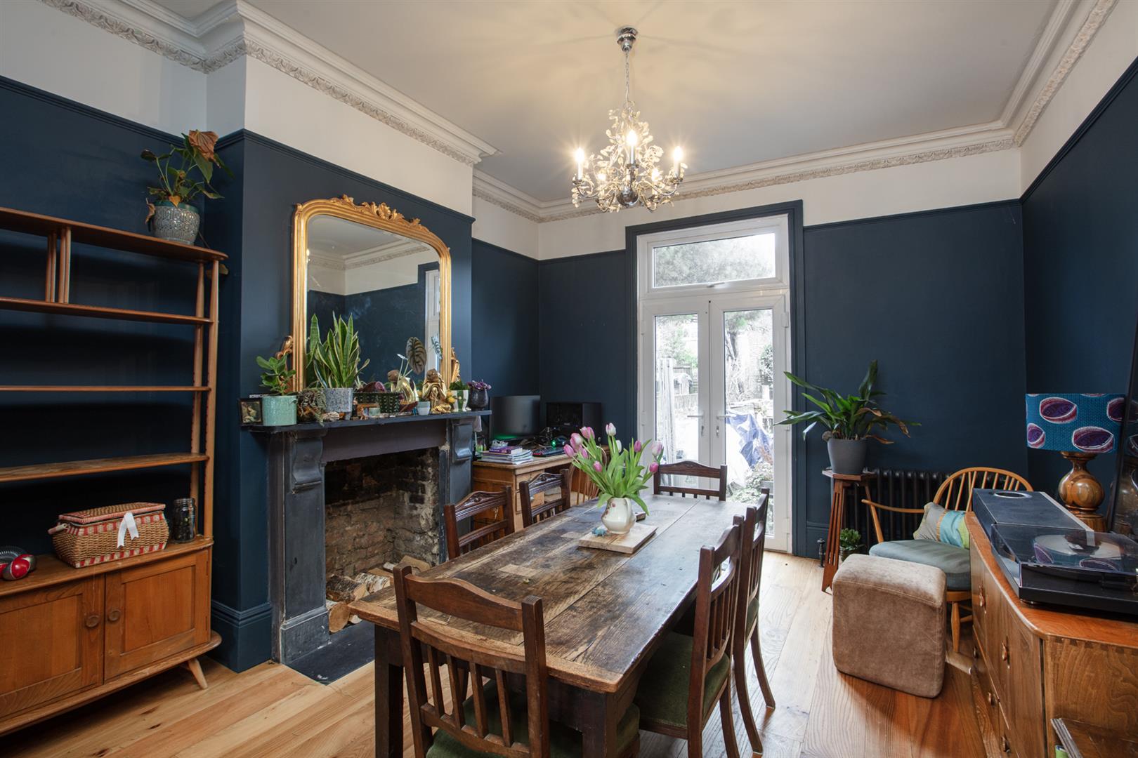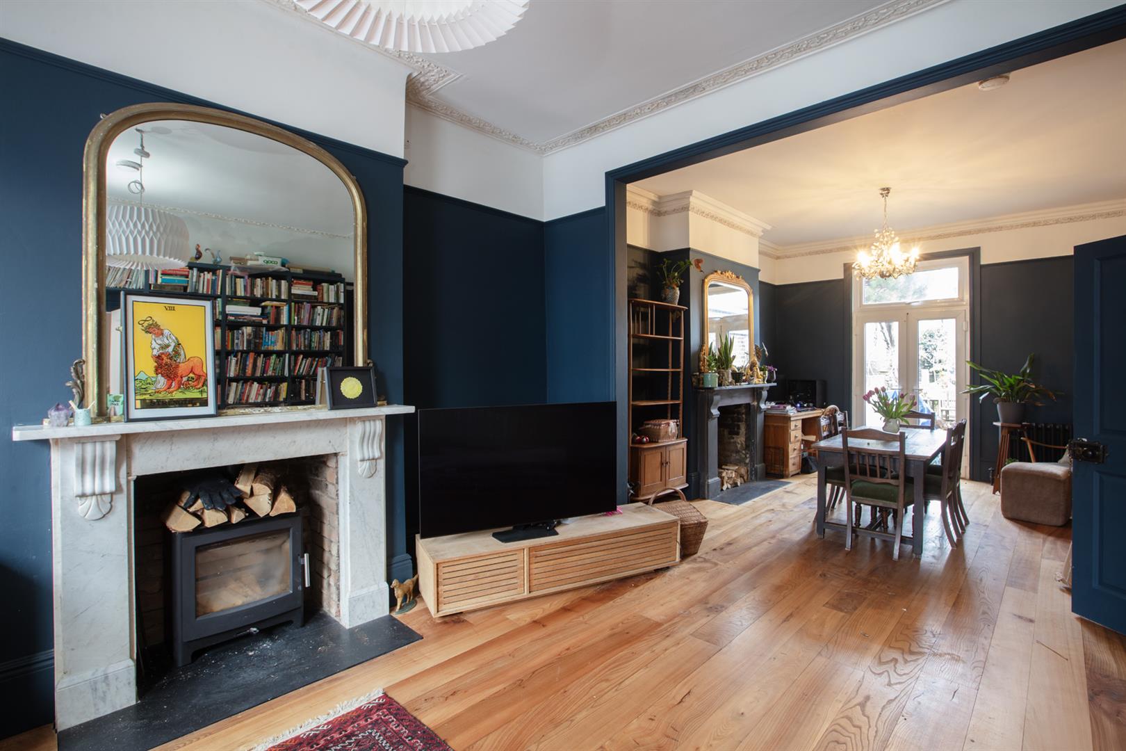 The house sits back from the road behind a decent sized front garden and next to an on street electric vehicle charging point. A classical recessed portico leads to the original door and inward to the hall. Here you find high ceilings and some perfectly chosen wall tones - Farrow and Ball's 'Setting Plaster' continues throughout this area complementing the tiled floor. Step left to meet that positively huge double reception which has an aspect to front and rear and is presented in rich 'Hague Blue'. Bespoke solid elm wooden floor offers a textured finish and there are twin original feature fireplaces, restored and cleaned ornate cornicing and bespoke built-in bookshelves!