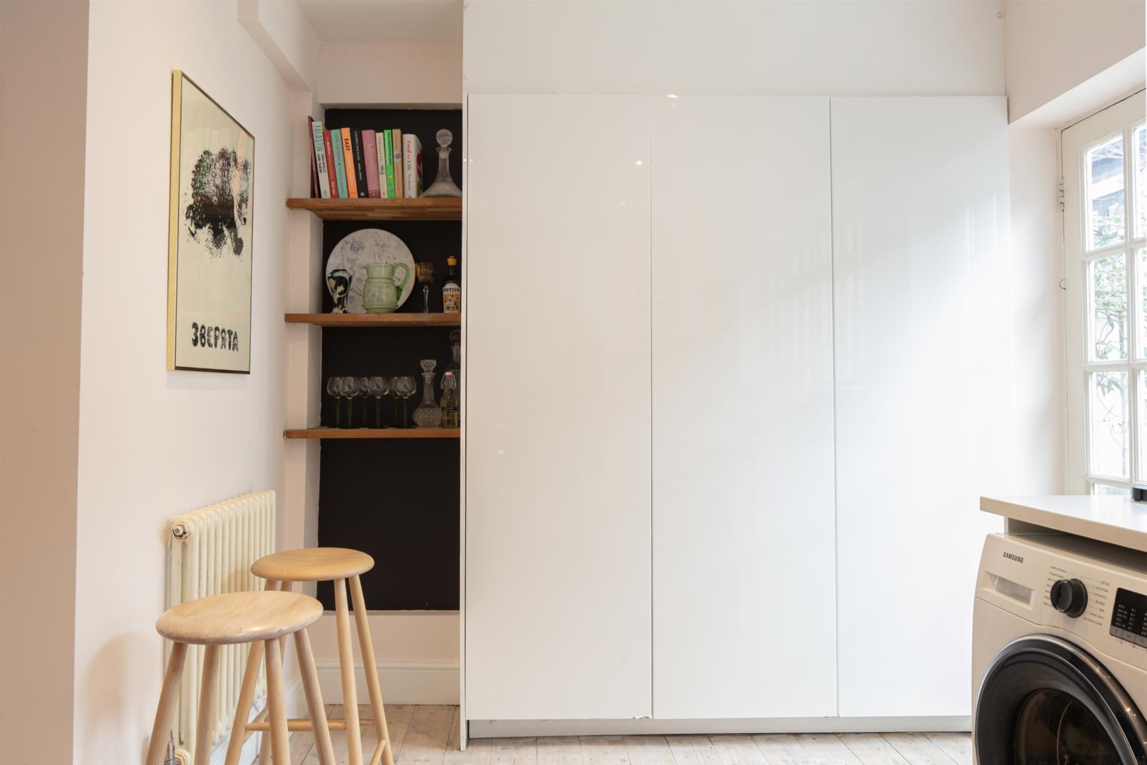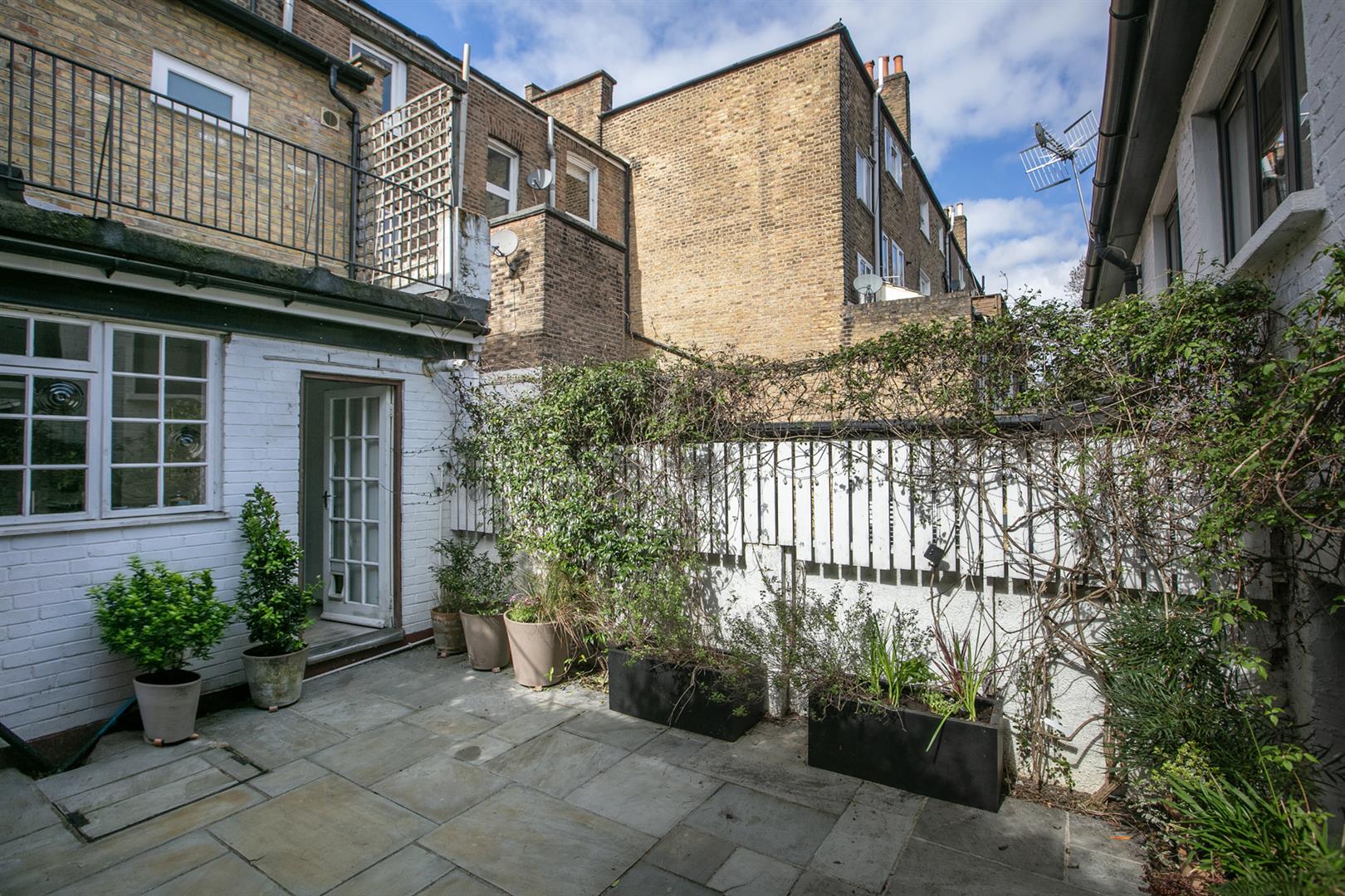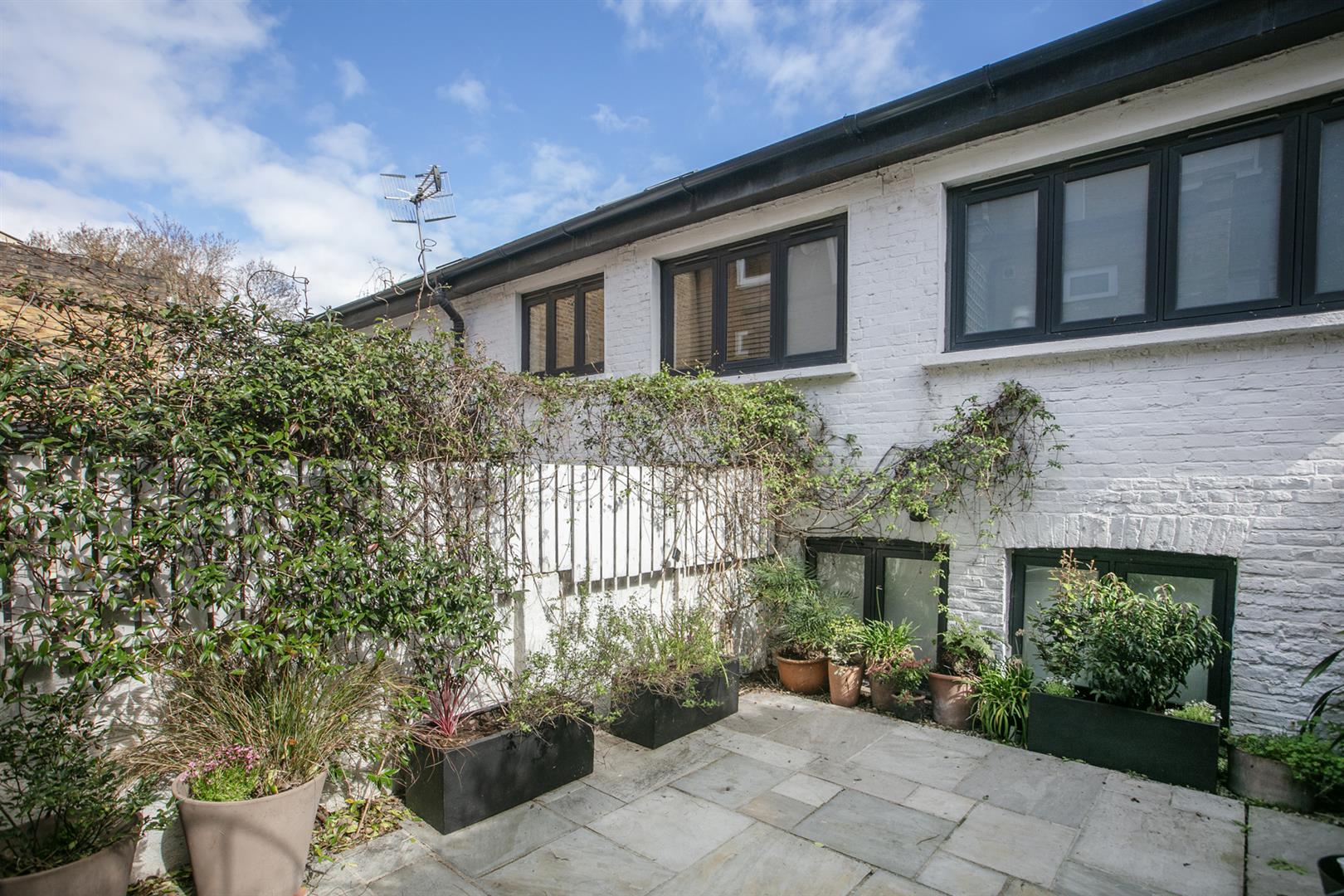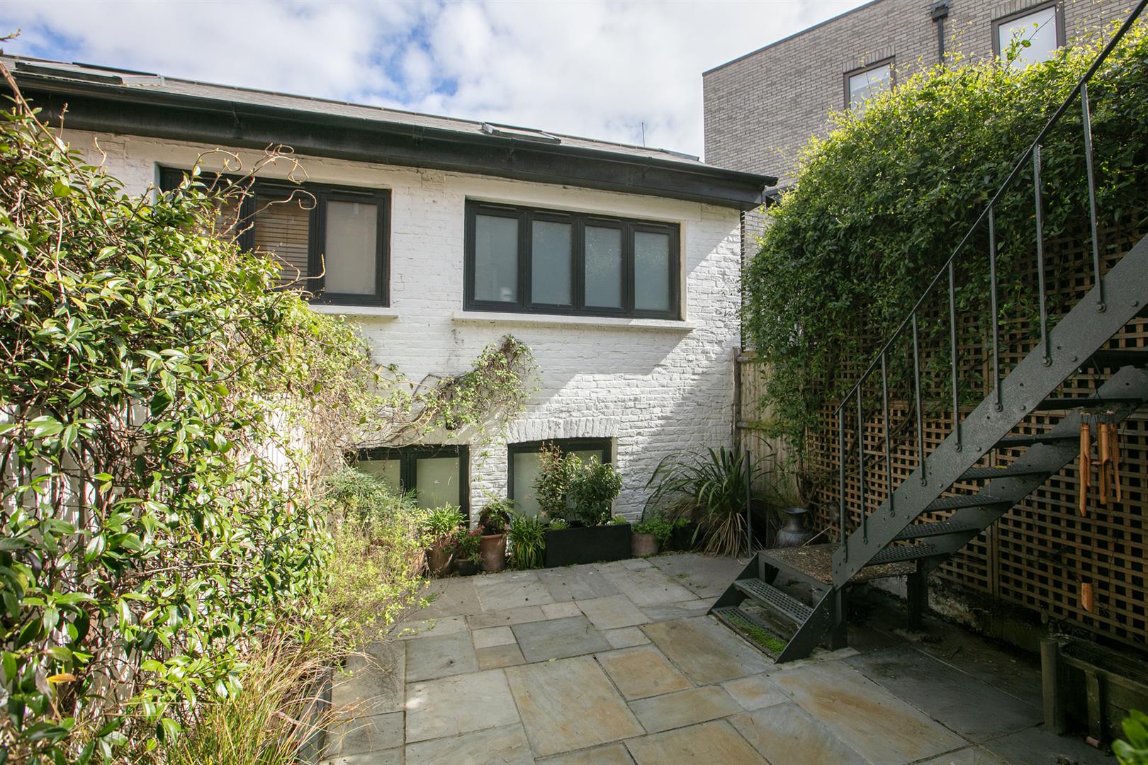 The front of the space enjoys a magnificent raised open-hearth, integrated shelving and a boastful front aspect sash window with fantastic views of the period temple opposite. Adjoining the dining area you find an L-shaped kitchen/diner which faces, through pretty casement windows, to your courtyard garden. There's space for all the white goods and a Chefmaster range will insist you cook up a storm. There's tonnes of counter space - easily enough for all your dicing and slicing and also breakfast bar-style dining. Tall seamless storage precedes the entrance to the rear garden which has mature greenery and a funky industrial staircase leading upward to your terrace.