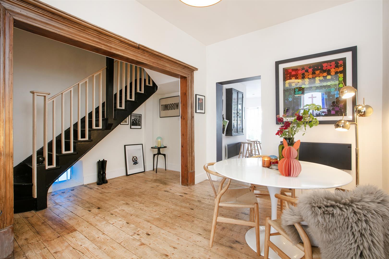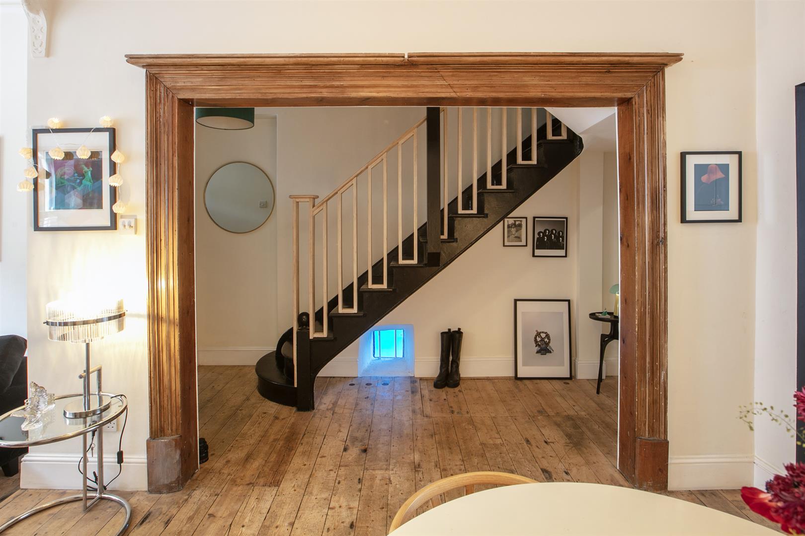 The flat-fronted exterior stands handsomely next to similarly attractive period properties. An arched recessed portico opens to your entrance hall where tall ceilings, school house radiators and some tasteful accented recessed walls supply depth. Dead ahead is your glorious staircase which has two elegantly curved lower steps. Jet black treads and risers contrast bespoke vertical wooden balustrades beautifully. The space underneath the staircase has been opened - it's great for shoes, art and perhaps some mood lighting. From here your super-impressive living area is announced through a double-width solid wooden arch. The space flows naturally to a double length, split naturally with one wide step. This offers distinction between lounging and formal dining areas.