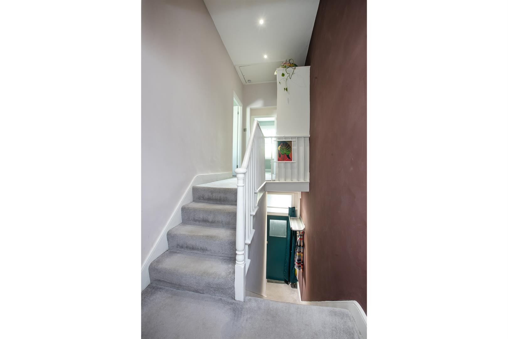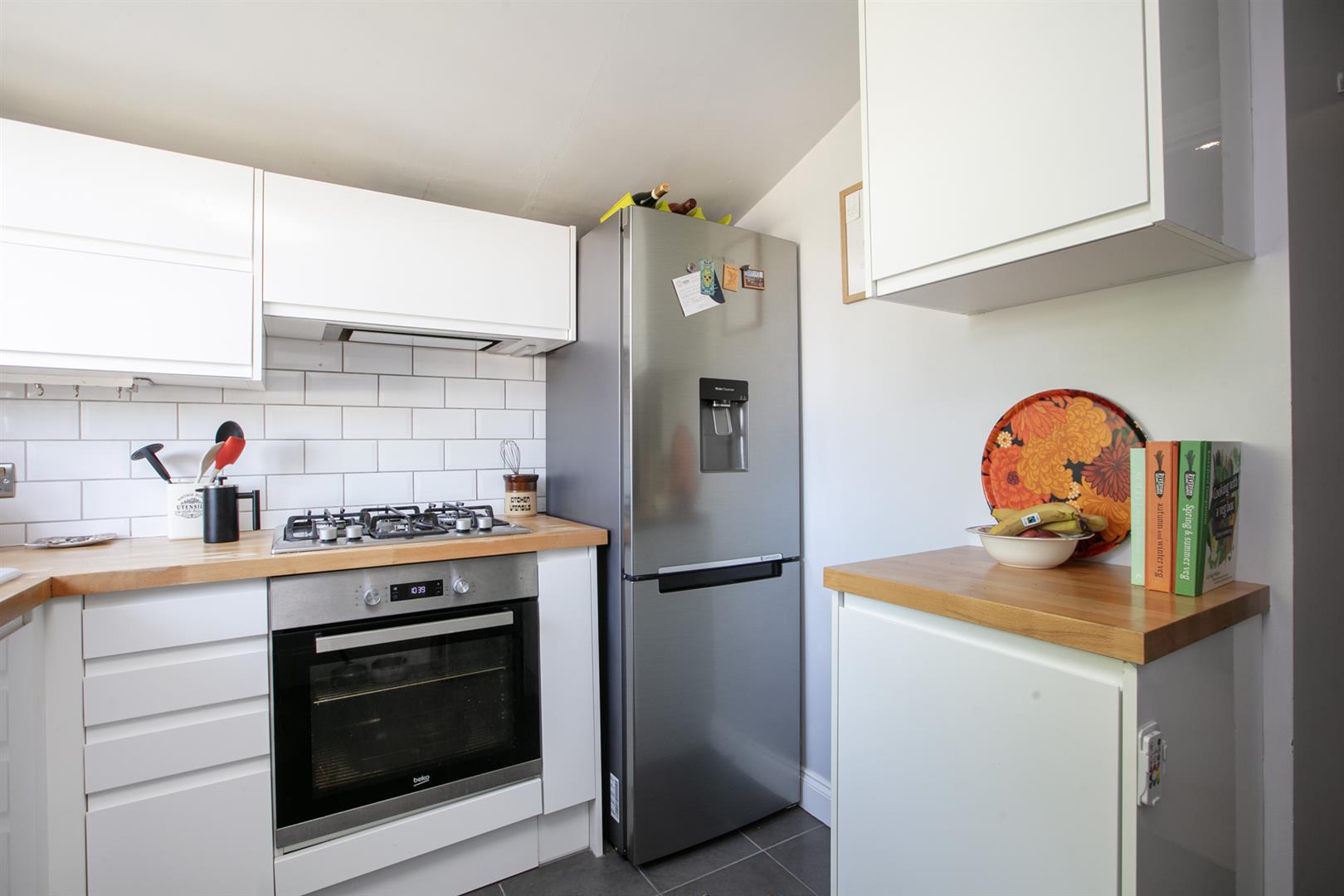 The property sits in a leafy pedestrian part of Kings Grove and is surrounded by similarly handsome period houses. Steps lead upward to the shared entrance. A carpeted inner stairwell invites you to the first floor with a stylish plum accent wall on the left side. The return hosts a bright kitchen with solid oak counters, white cabinets and a ceramic sink and drainer. Appliances include a dishwasher, built-in microwave oven, four ring hob and oven. Space-saving pot storage cupboards help keep things neat and tidy. A pleasant leafy rear aspect adds to the ambience.