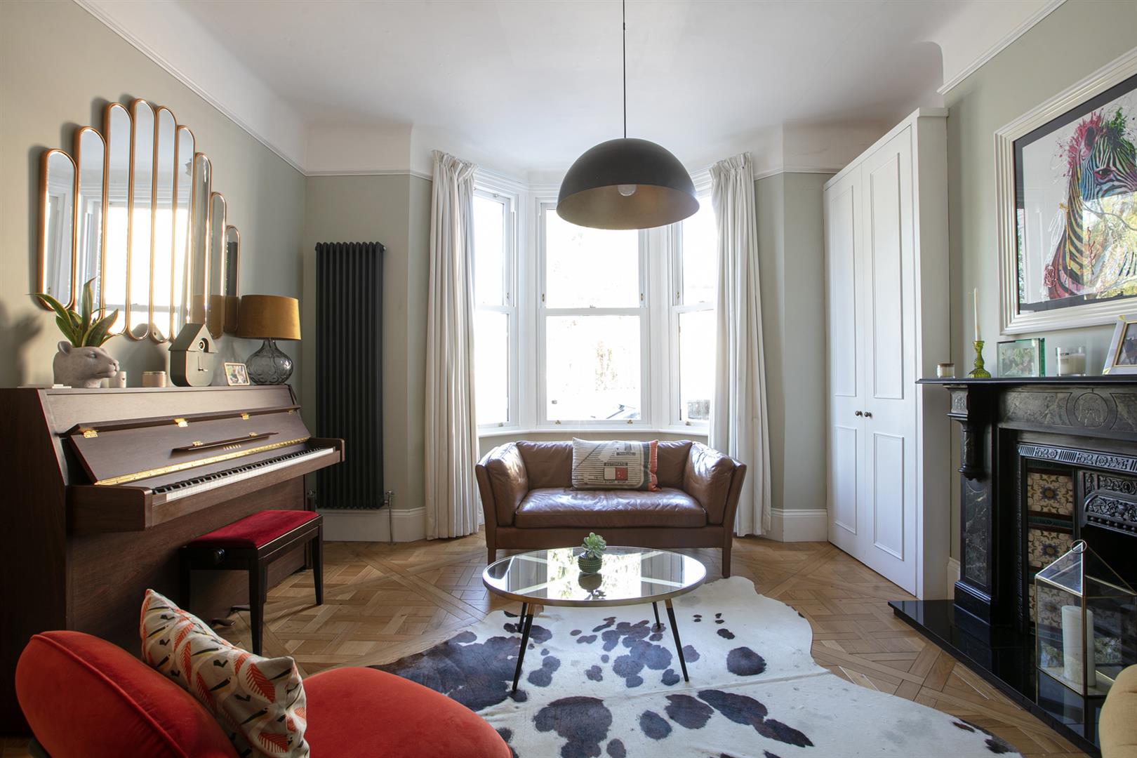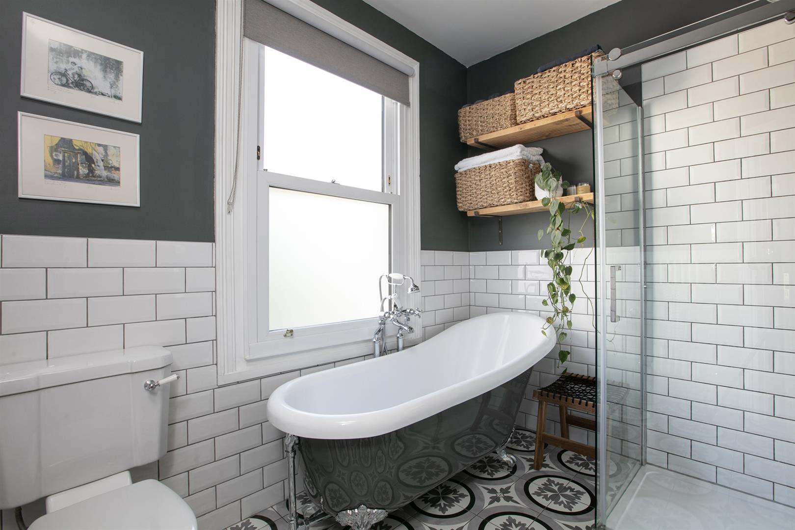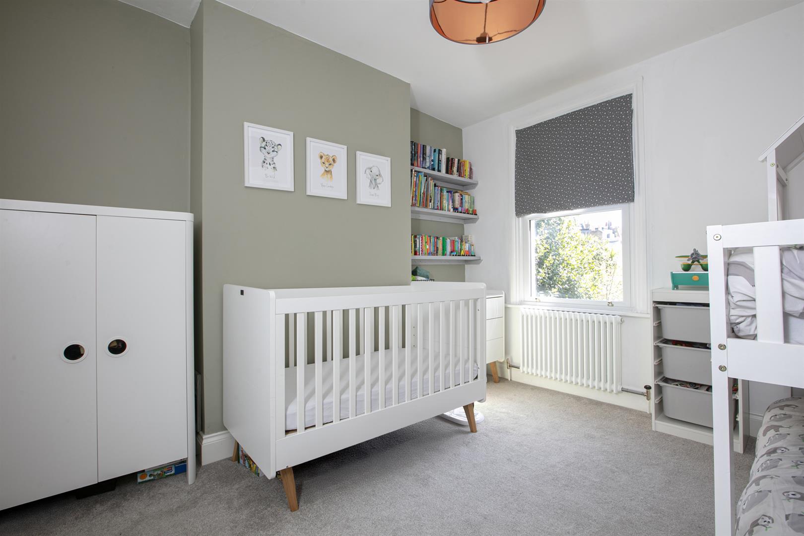 Upward bound you enjoy an original staircase, painted white and with a tasteful grey runner. The first return is similarly carpeted and leads to a reassuringly well proportioned rear-facing double bedroom with garden views - it's a notably pleasant aspect. Farrow and Ball's 'Drawing Room Blue' offer a moody contrast. Next to this sits the family bathroom which has both bath and shower, antique style loo and wash hand basin - with Farrow and Ball 'Down pipe' on the walls. The front aspect master double has the most wonderful parkside vista. We can imagine curling up with a book in that wide bay window no matter what the weather. The house enjoys such a sense of privacy without being directly over-looked. Bedroom three is another rear-facing double with peaceful views.