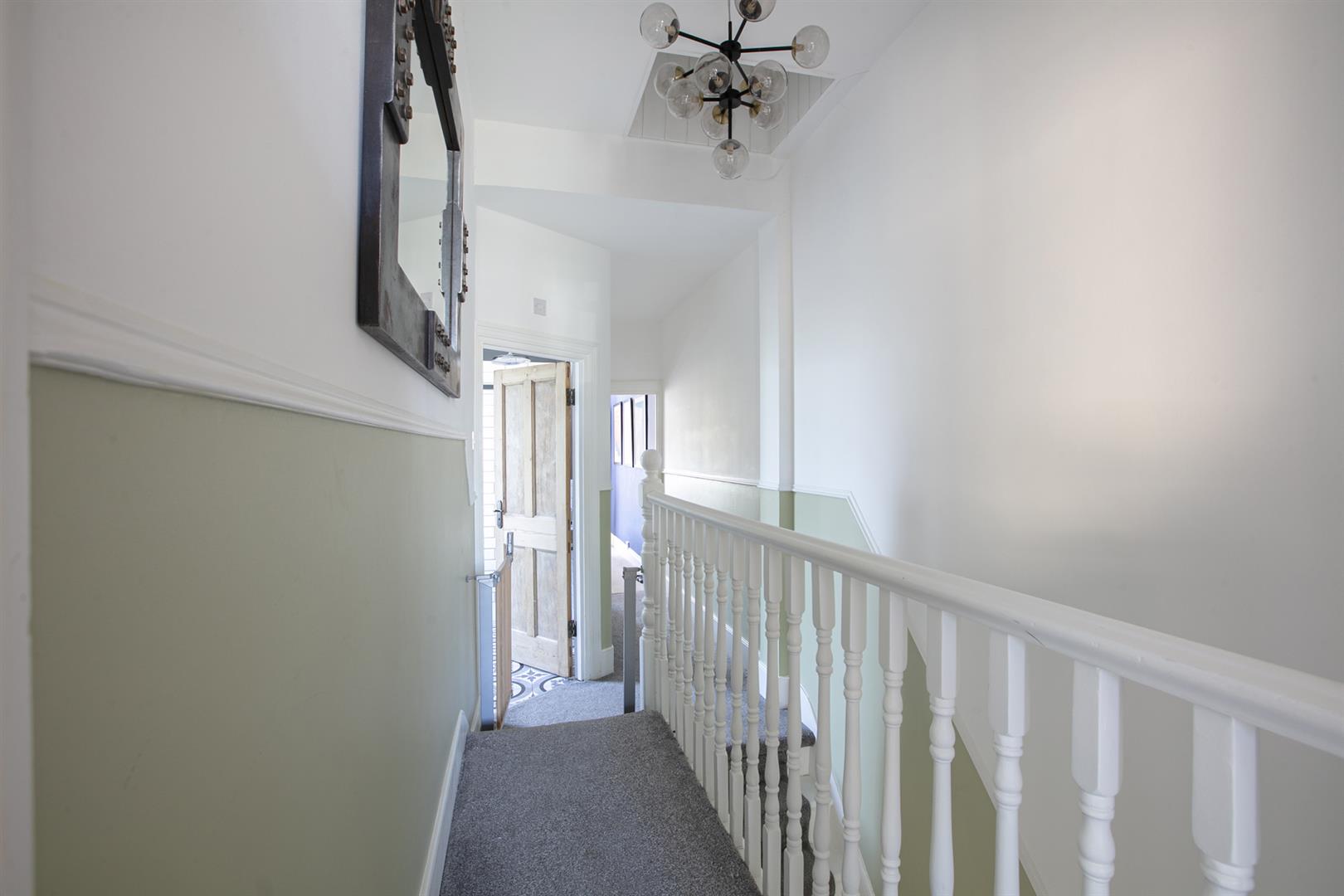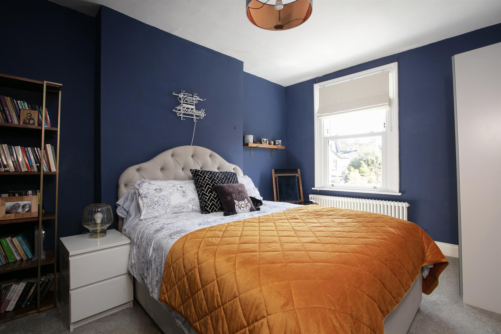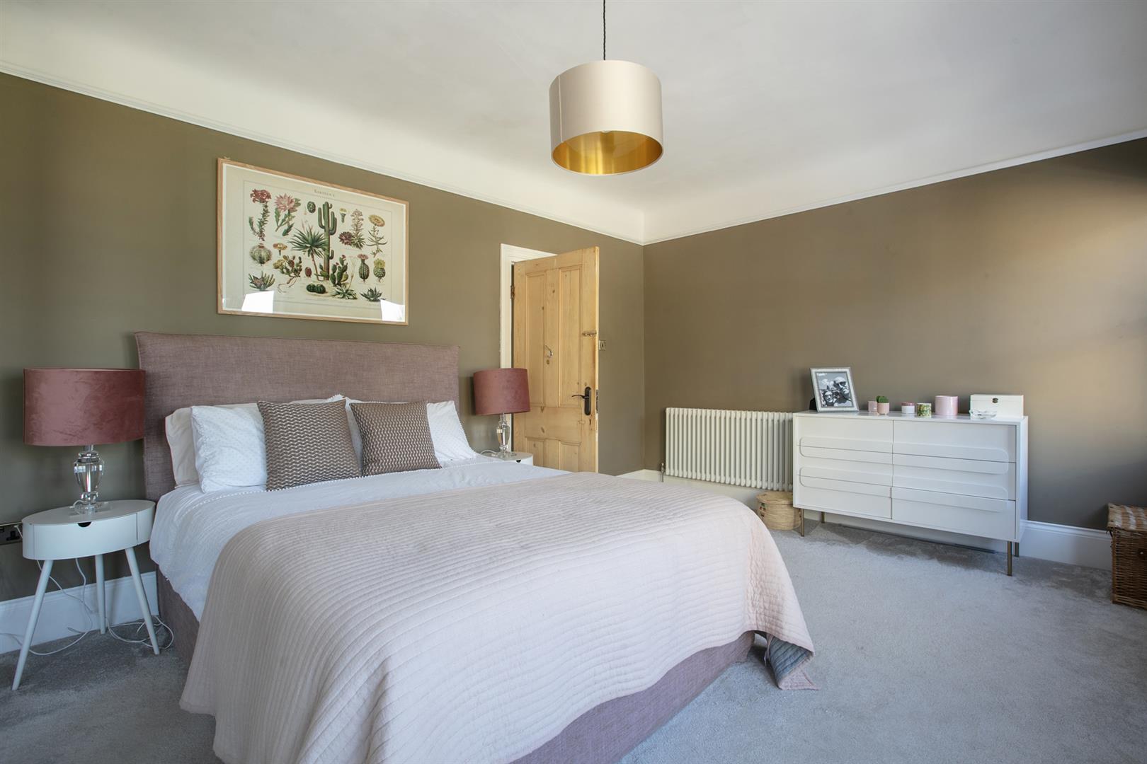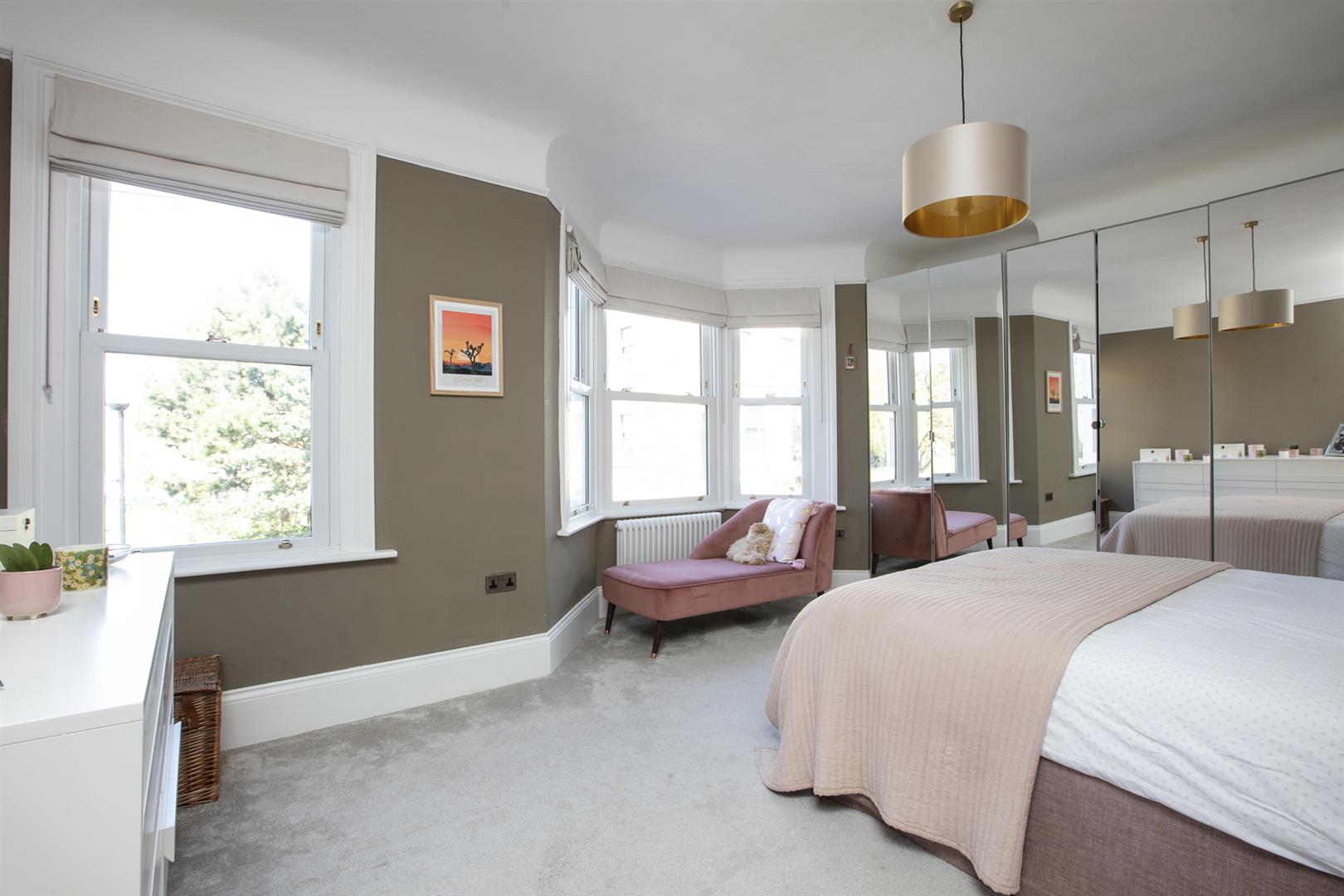 Upward bound you enjoy an original staircase, painted white and with a tasteful grey runner. The first return is similarly carpeted and leads to a reassuringly well proportioned rear-facing double bedroom with garden views - it's a notably pleasant aspect. Farrow and Ball's 'Drawing Room Blue' offer a moody contrast. Next to this sits the family bathroom which has both bath and shower, antique style loo and wash hand basin - with Farrow and Ball 'Down pipe' on the walls. The front aspect master double has the most wonderful parkside vista. We can imagine curling up with a book in that wide bay window no matter what the weather. The house enjoys such a sense of privacy without being directly over-looked. Bedroom three is another rear-facing double with peaceful views.
