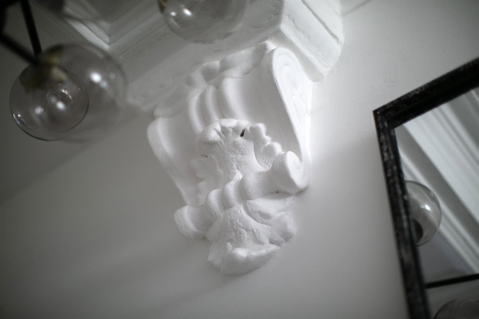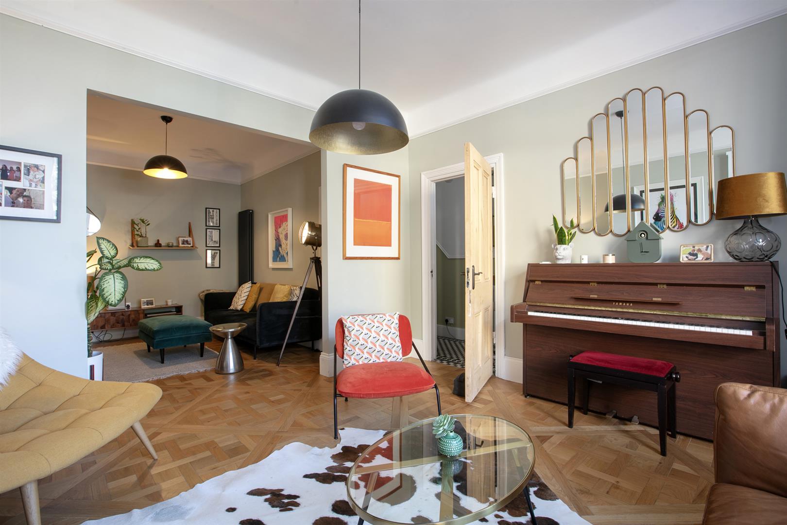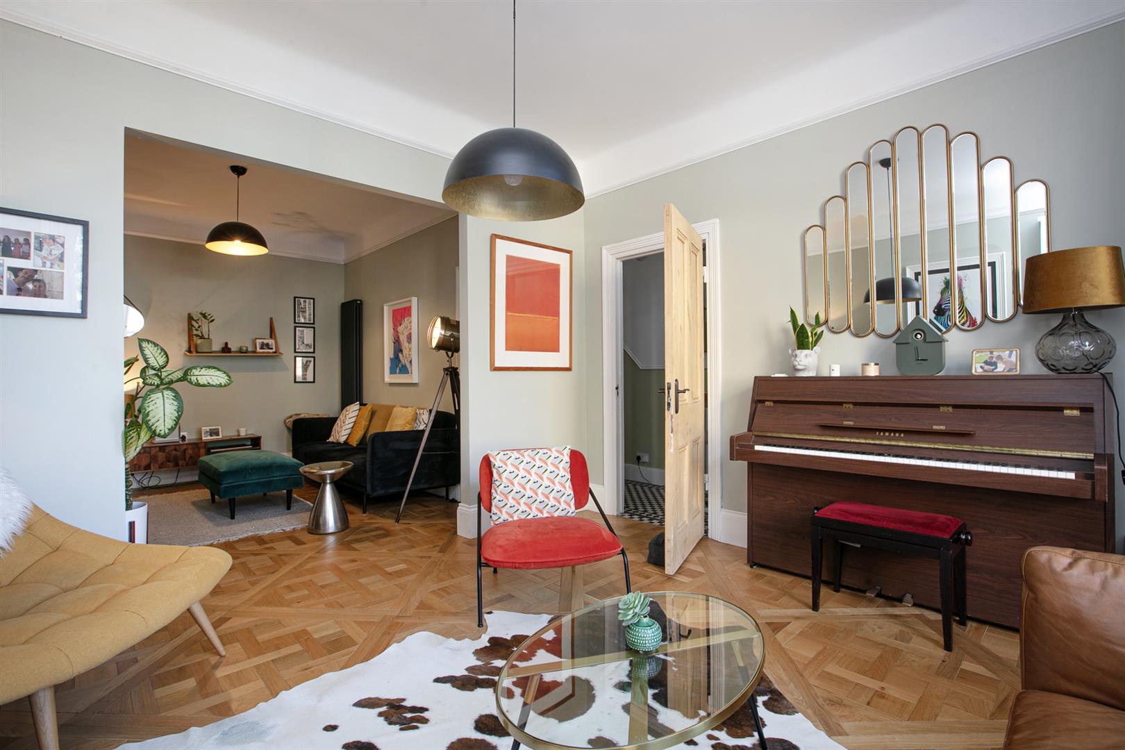 The house sits opposite Harold Moody Park which is currently enjoying a complete transformation. The space has been extended and landscaped to include abundant new greenery and play areas. Inward bound you meet a welcoming hallway with high ceilings, corbals and tasteful coving. The walls are Farrow and Ball's 'Cooking Apple Green'. A generous double reception (presented in 'Cromarty') boasts the most gorgeous Parquet flooring and an imposing original feature fireplace with tiling. There's a nifty integrated 'work-from'home' cubby and further fitted storage.