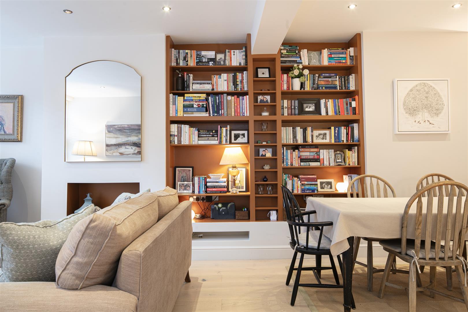 The exterior is particularly handsome, enjoying London stock brickwork and some mature greenery. Past the off-street parking area you enter into an inviting hallway with wooden panelling to dado level. The living area runs open-plan to the full impressive depth of the property - over 18m in total! A seating area fronts the property with seven double glazed wooden framed sash windows with louvered shutters and floor to ceiling shelving for your books and holiday snaps. A wide dining area leads past a deep understairs storage point, and down one step to the kitchen with its sparkly-white countertops and splashback, modern appliances and plenty of storage. The walk-in pantry and the central island offer even more storage to meet the needs of any family, while the separate laundry room with fitted cupboards and space for customary appliances works had to keep the rest of the house tidy and neat.