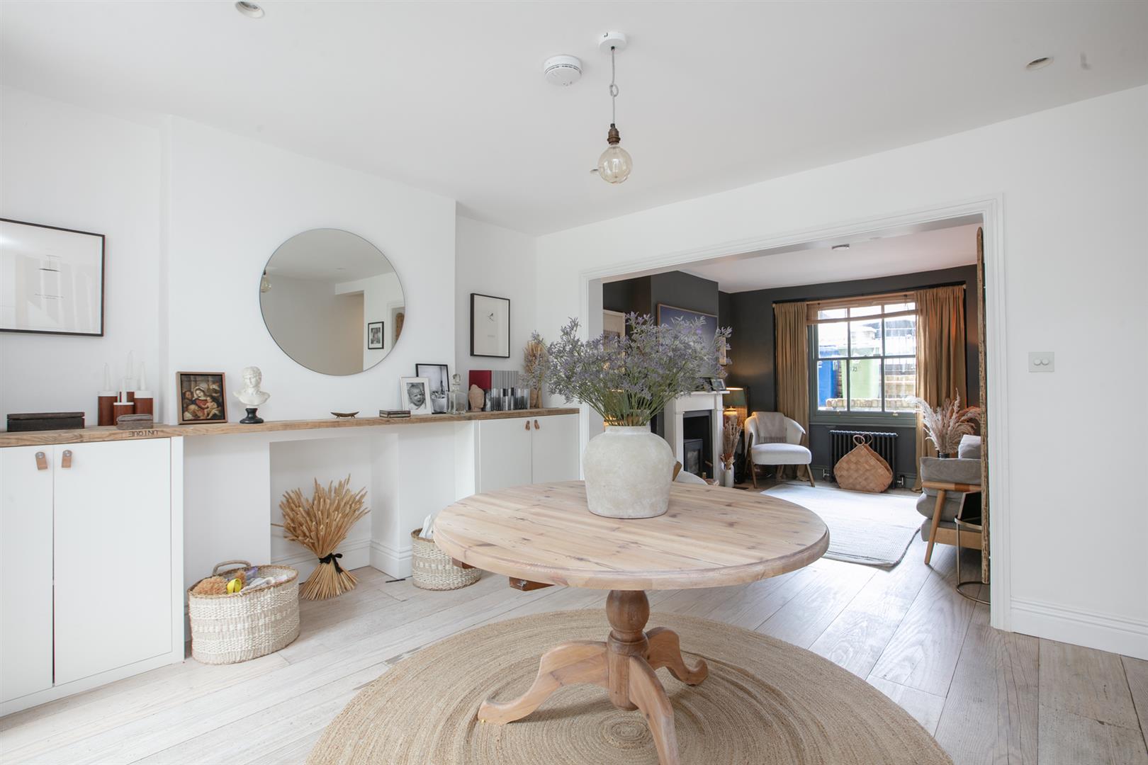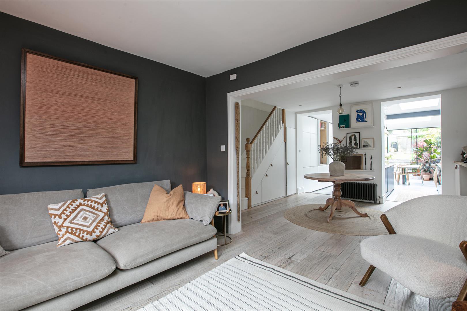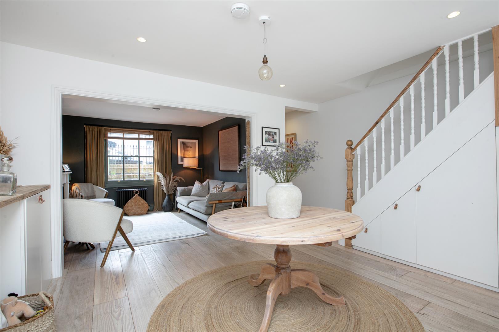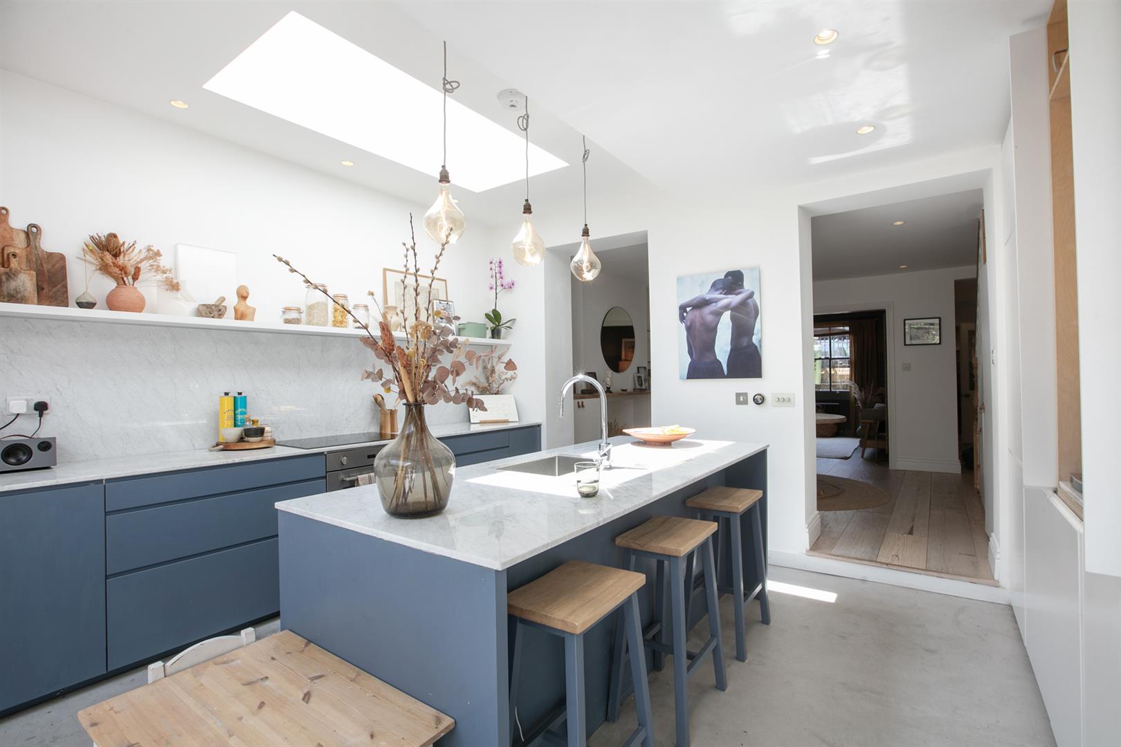 Heading downward you meet that glorious, full-width living area that flows the full depth of the property. A comfortable lounge faces front through a double glazed sash window. There's a handsome wood burning stove with marble mantel, rustic wooden shelving and yummy 'Downpipe' grey on the walls. Further front access is also offered to the front, next to recessed storage. A formal dining area proceeds the lounge with lovely low level storage units and further under stairs storage. The kitchen/diner is simply divine! Stretching over 9 metres it includes unrivalled cooking, dining and lounging potential and sparkles with natural light. Your carrara-topped marble island and matching counters supply abundant dicing, slicing and spicing space. Extra wide anti-slam wooden cabinets are cleverly designed with a higher profile for maximum storage. An electric skylight opens overhead via remote control for an ingenious alternative to a bulky extractor fan.