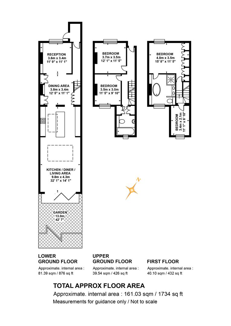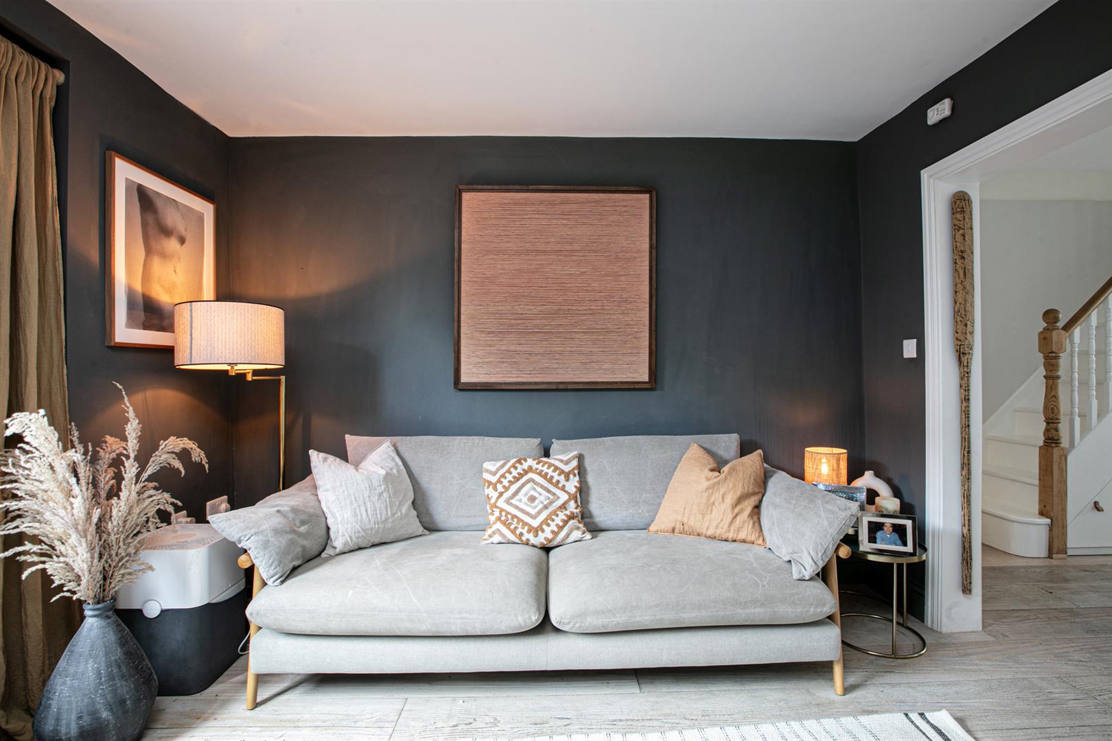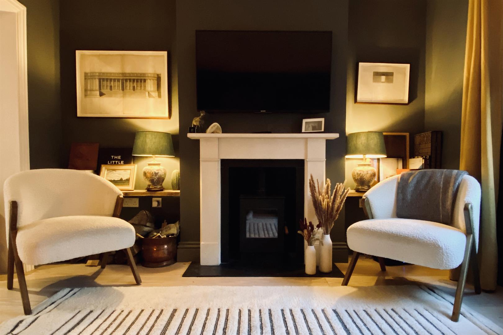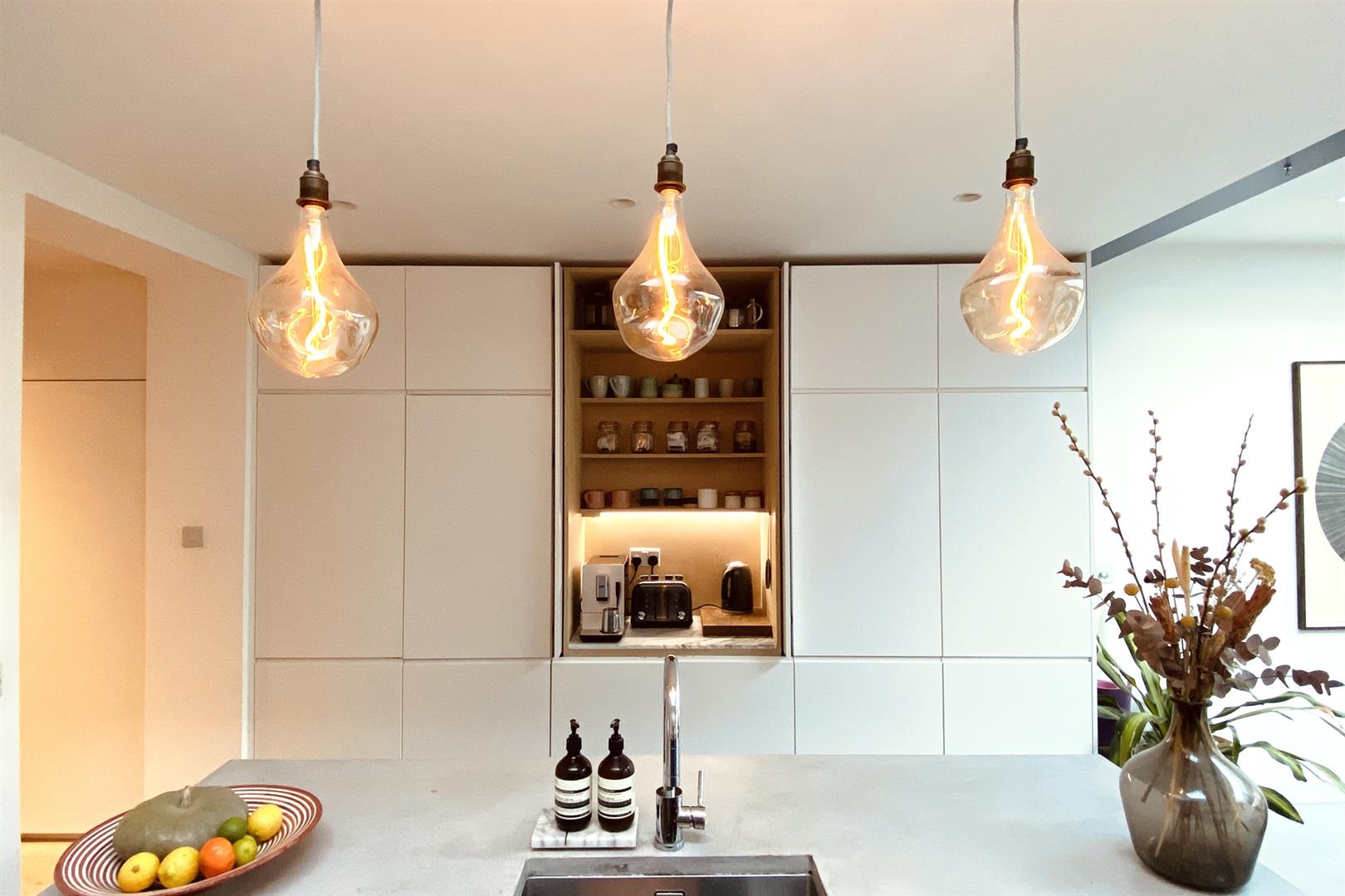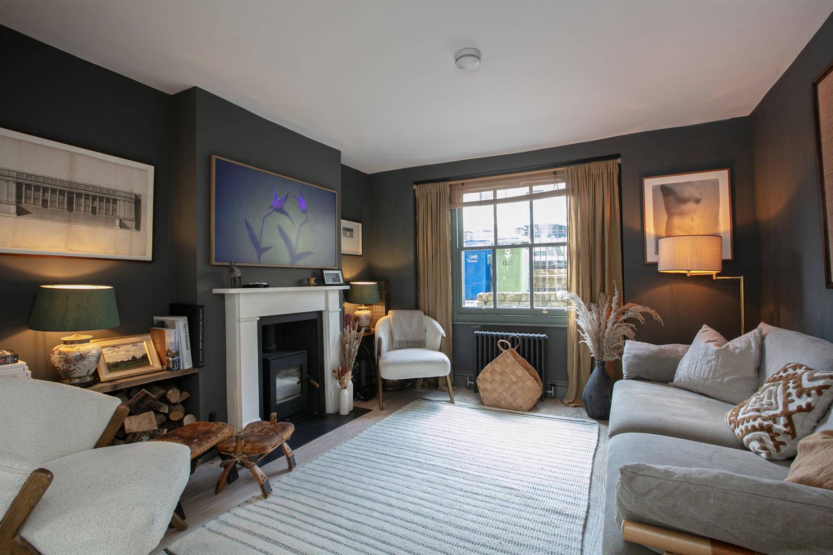 Heading downward you meet that glorious, full-width living area that flows the full depth of the property. A comfortable lounge faces front through a double glazed sash window. There's a handsome wood burning stove with marble mantel, rustic wooden shelving and yummy 'Downpipe' grey on the walls. Further front access is also offered to the front, next to recessed storage. A formal dining area proceeds the lounge with lovely low level storage units and further under stairs storage. The kitchen/diner is simply divine! Stretching over 9 metres it includes unrivalled cooking, dining and lounging potential and sparkles with natural light. Your carrara-topped marble island and matching counters supply abundant dicing, slicing and spicing space. Extra wide anti-slam wooden cabinets are cleverly designed with a higher profile for maximum storage. An electric skylight opens overhead via remote control for an ingenious alternative to a bulky extractor fan.