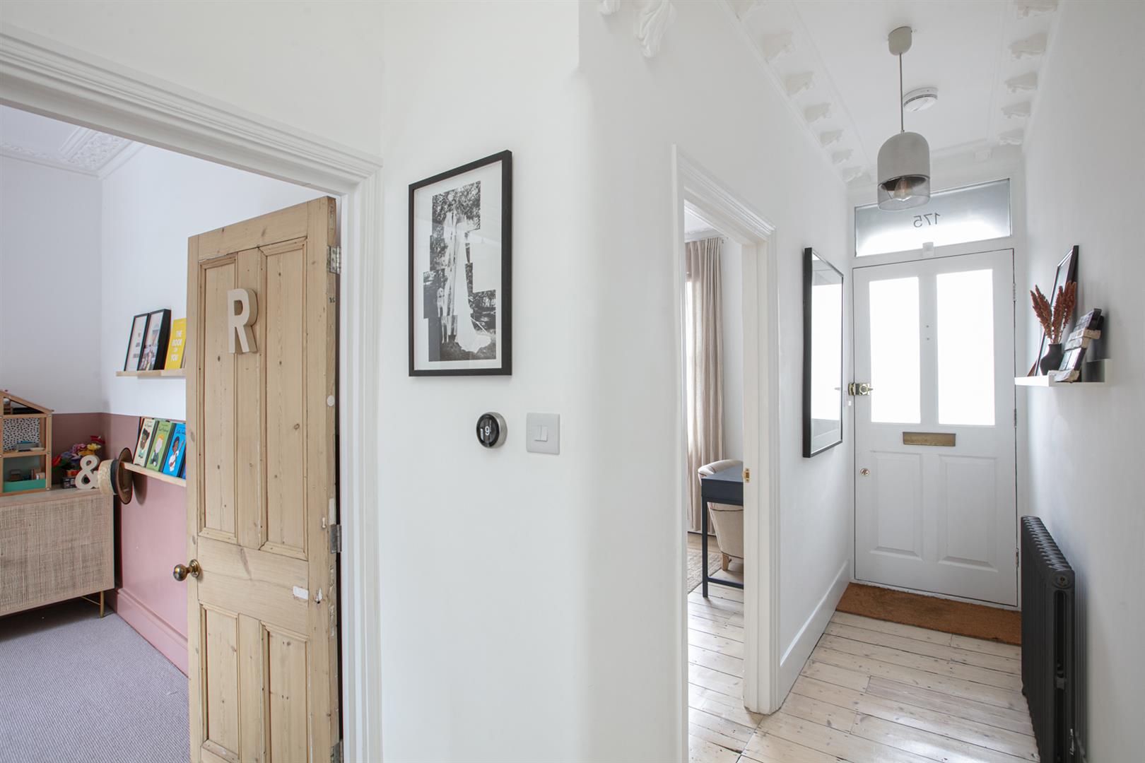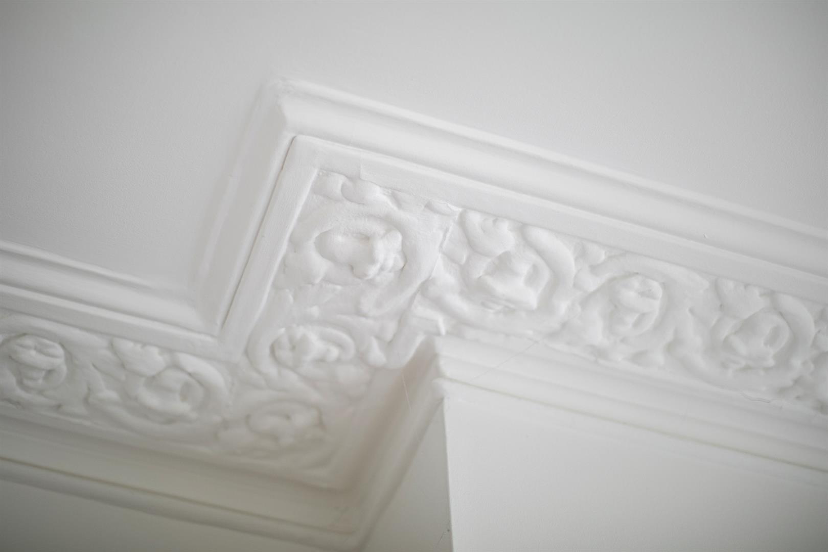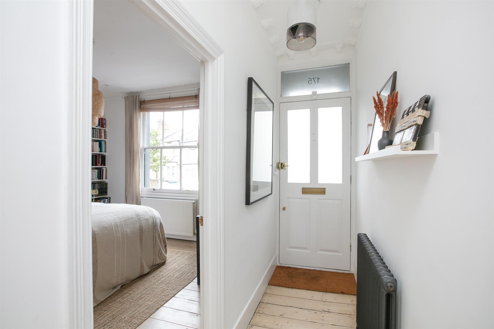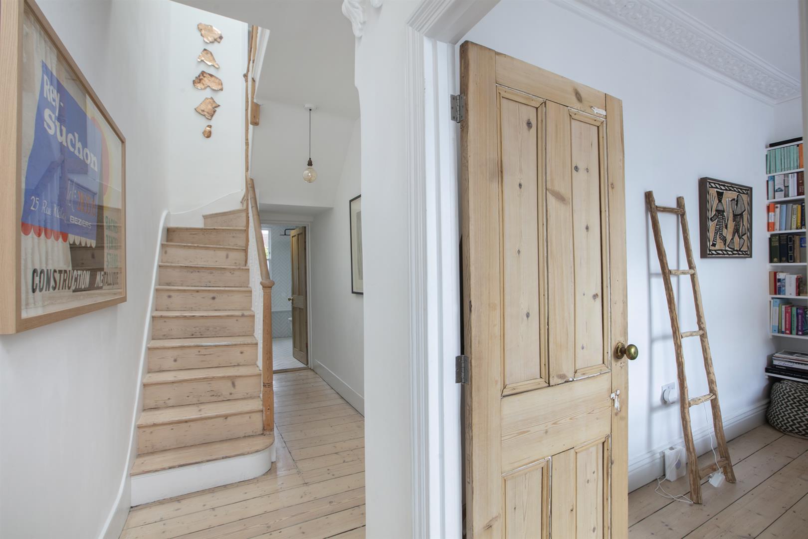 A bright and airy upper ground floor hall greets you with rustic timber flooring, cornicing and corbals. The walls are soothing and neutral - it's the perfect first impression. To your right sits the first of your double bedrooms - a front-facing airy space with ornate cornicing and integrated shelving. A second double bedroom faces rear with a pretty feature fireplace and more splendid cornicing. Completing this level is a stylish bathroom with funky Parquet tiling, crisp white suite, storage and a matt black drencher over the bath.