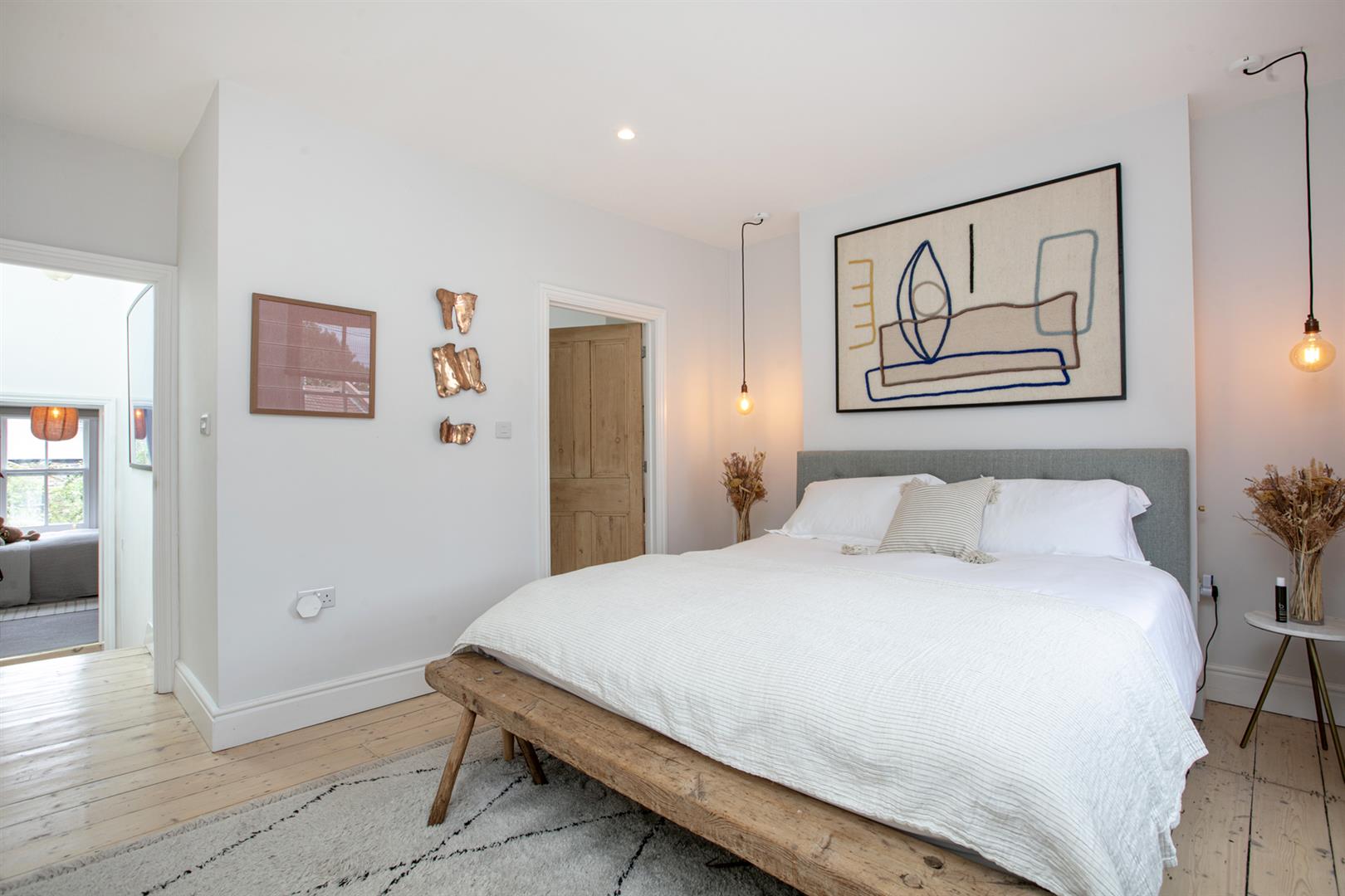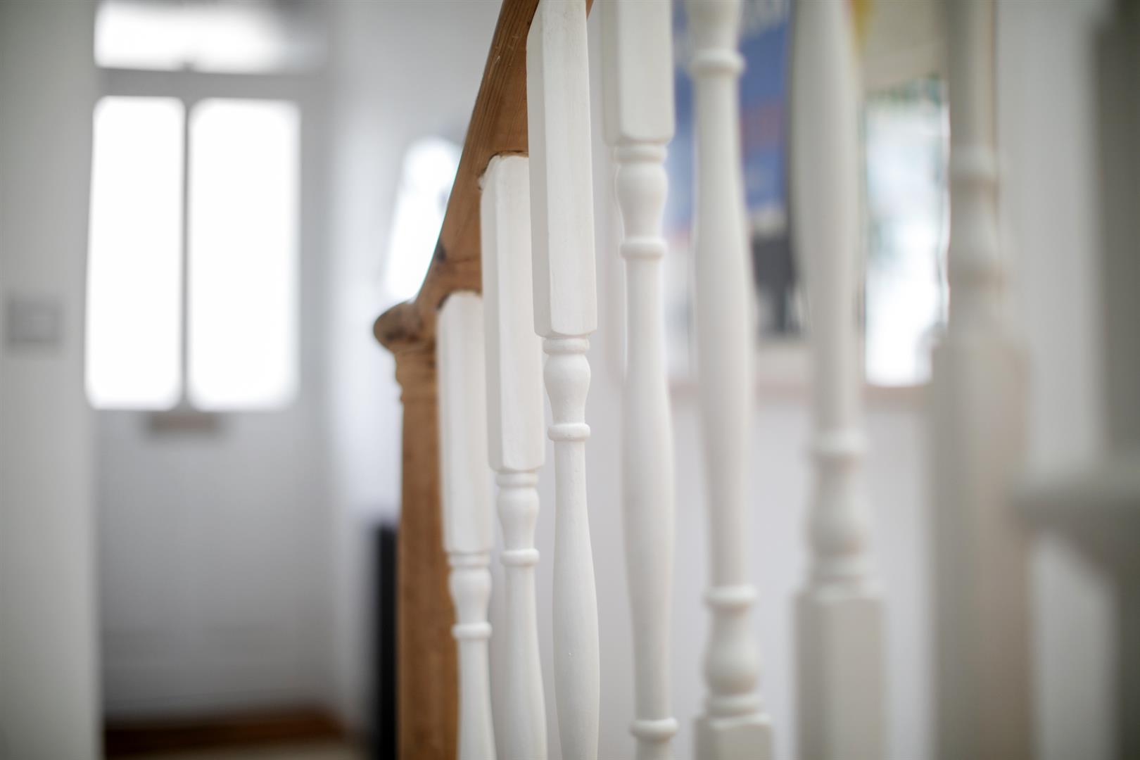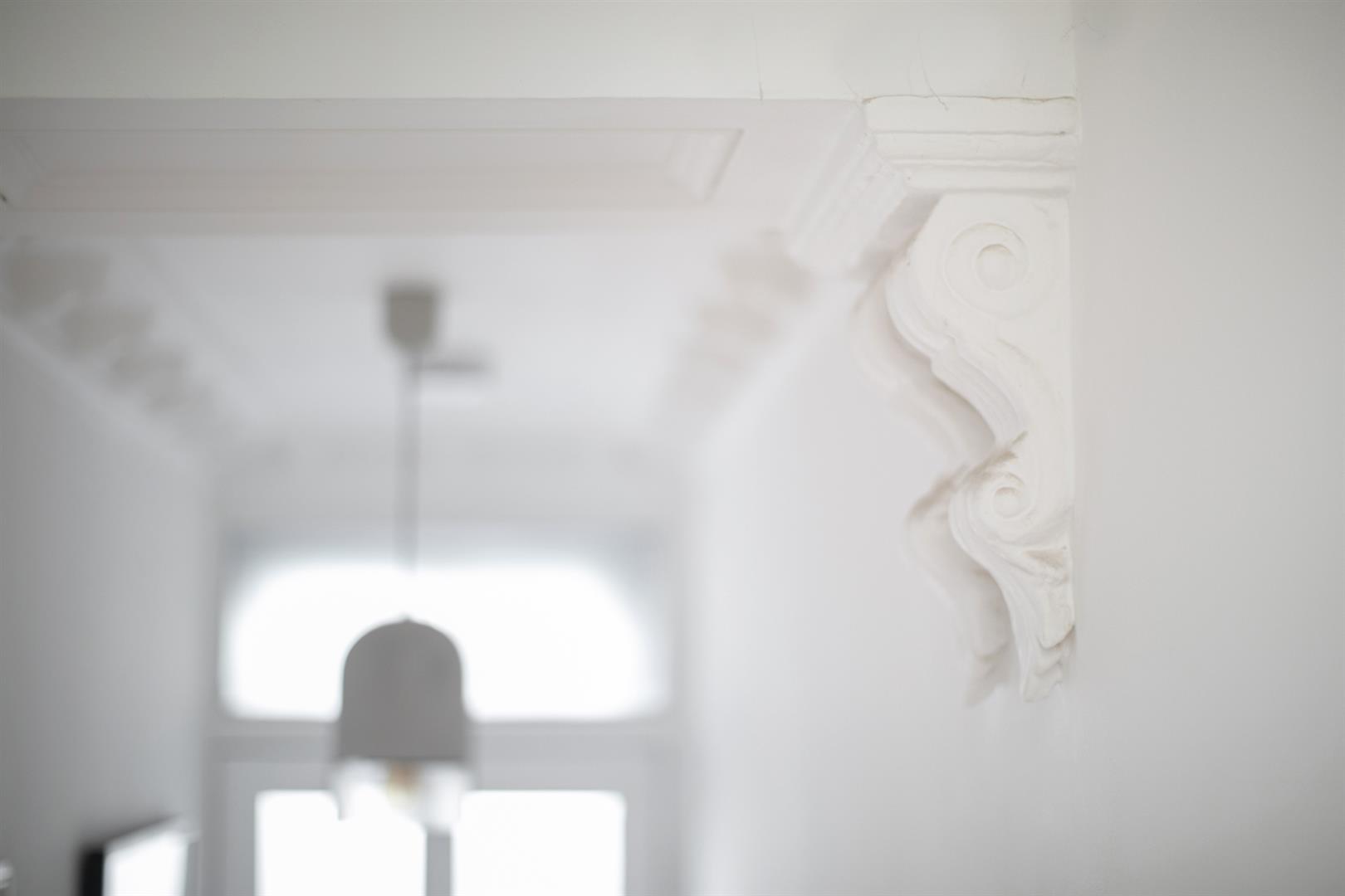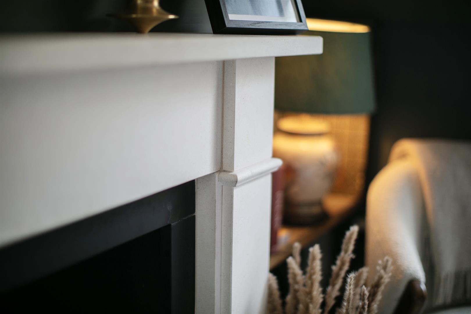 A bright and airy upper ground floor hall greets you with rustic timber flooring, cornicing and corbals. The walls are soothing and neutral - it's the perfect first impression. To your right sits the first of your double bedrooms - a front-facing airy space with ornate cornicing and integrated shelving. A second double bedroom faces rear with a pretty feature fireplace and more splendid cornicing. Completing this level is a stylish bathroom with funky Parquet tiling, crisp white suite, storage and a matt black drencher over the bath.