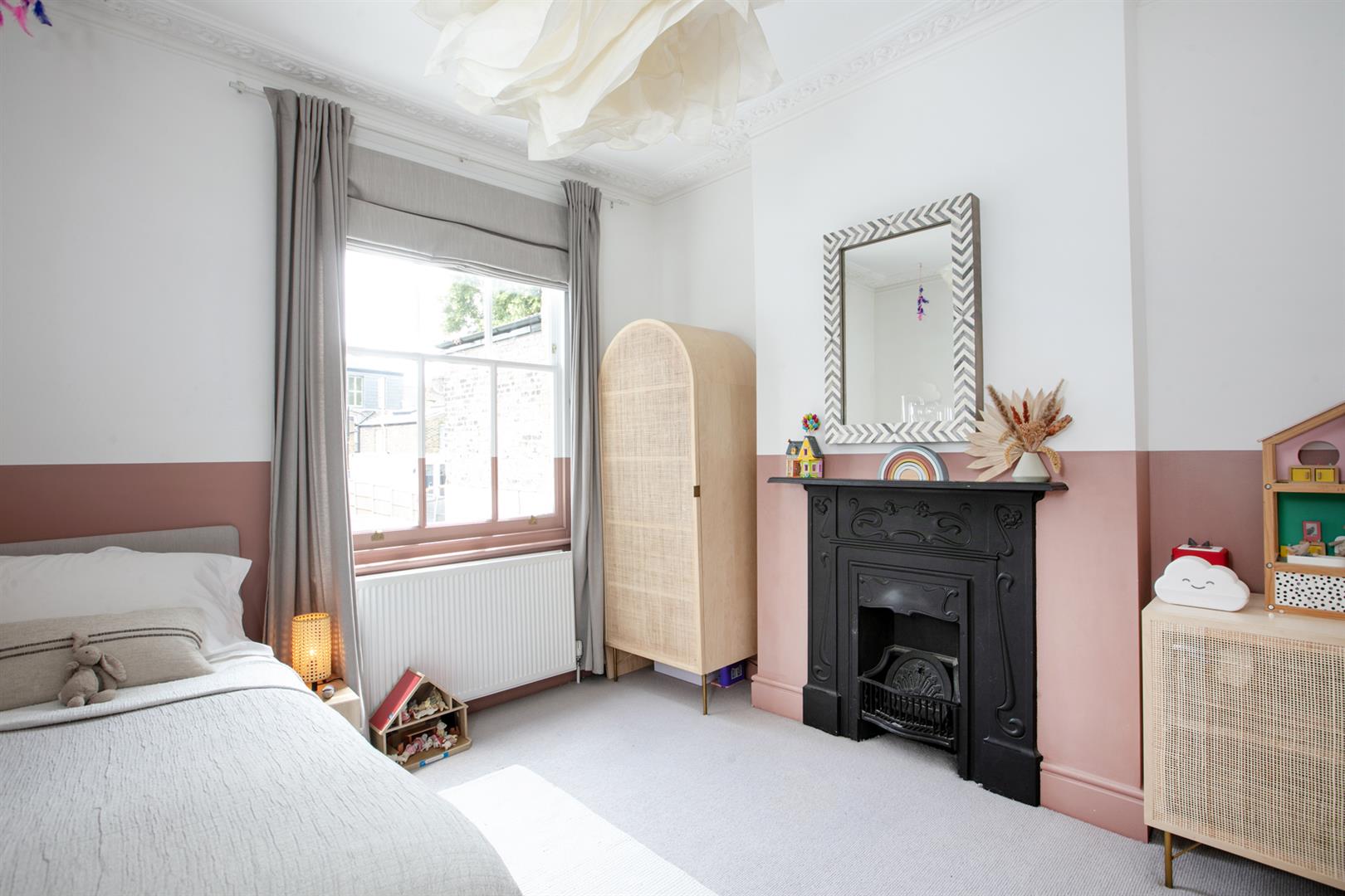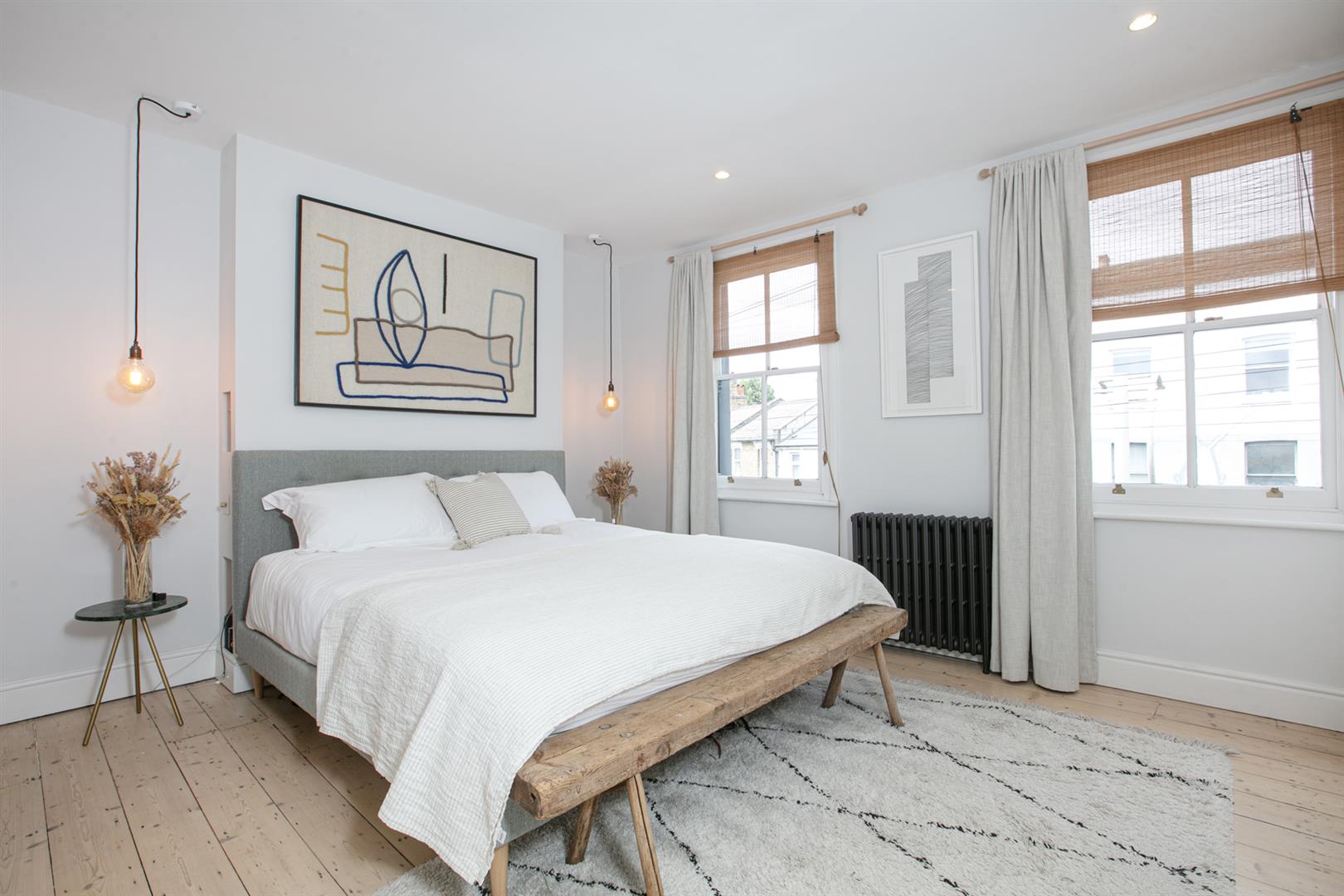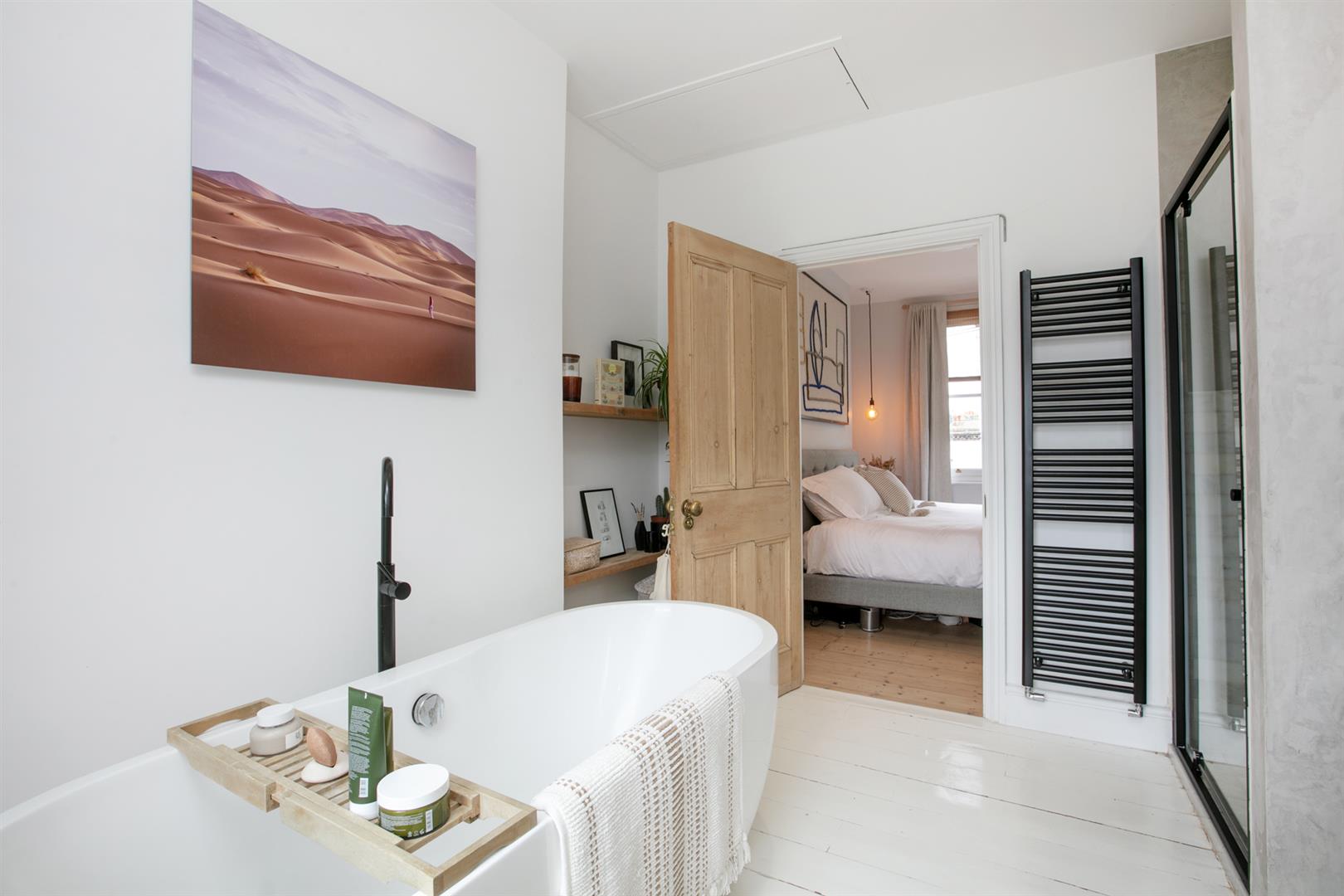 Back inside, head upward to the first floor via the original staircase. You'll note beautifully stained treads and risers and a clever glass siding that allows light spill downward from the entrance hall. The upper return hosts bedroom three - a sweet rear-facing carpeted room with lofty garden views. Bedroom four steals the show with two front-aspect double glazed sash windows and a generous wall of bespoke storage. A striking en suite adjoins donning a walk-in shower, contemporary freestanding bath and a thick-cut marble counter hosting twin circular wash hand basins.
