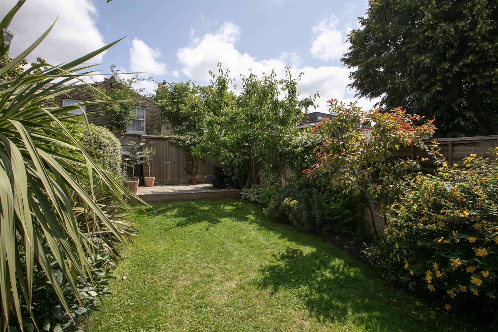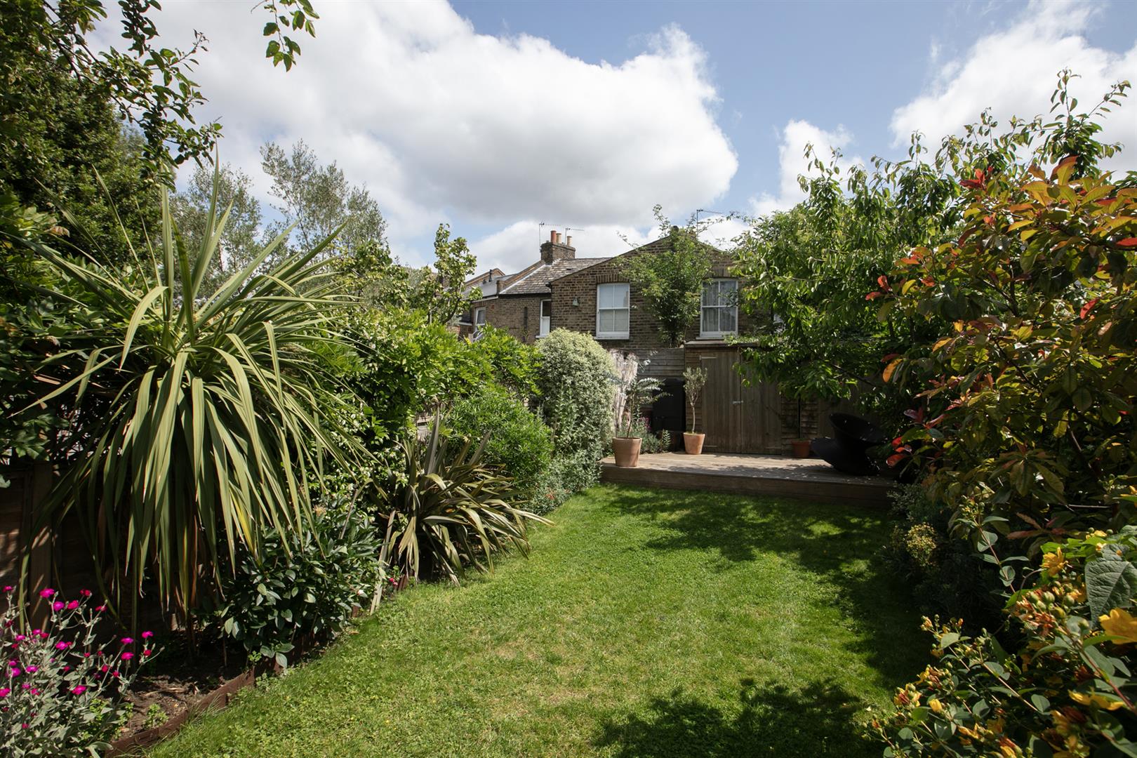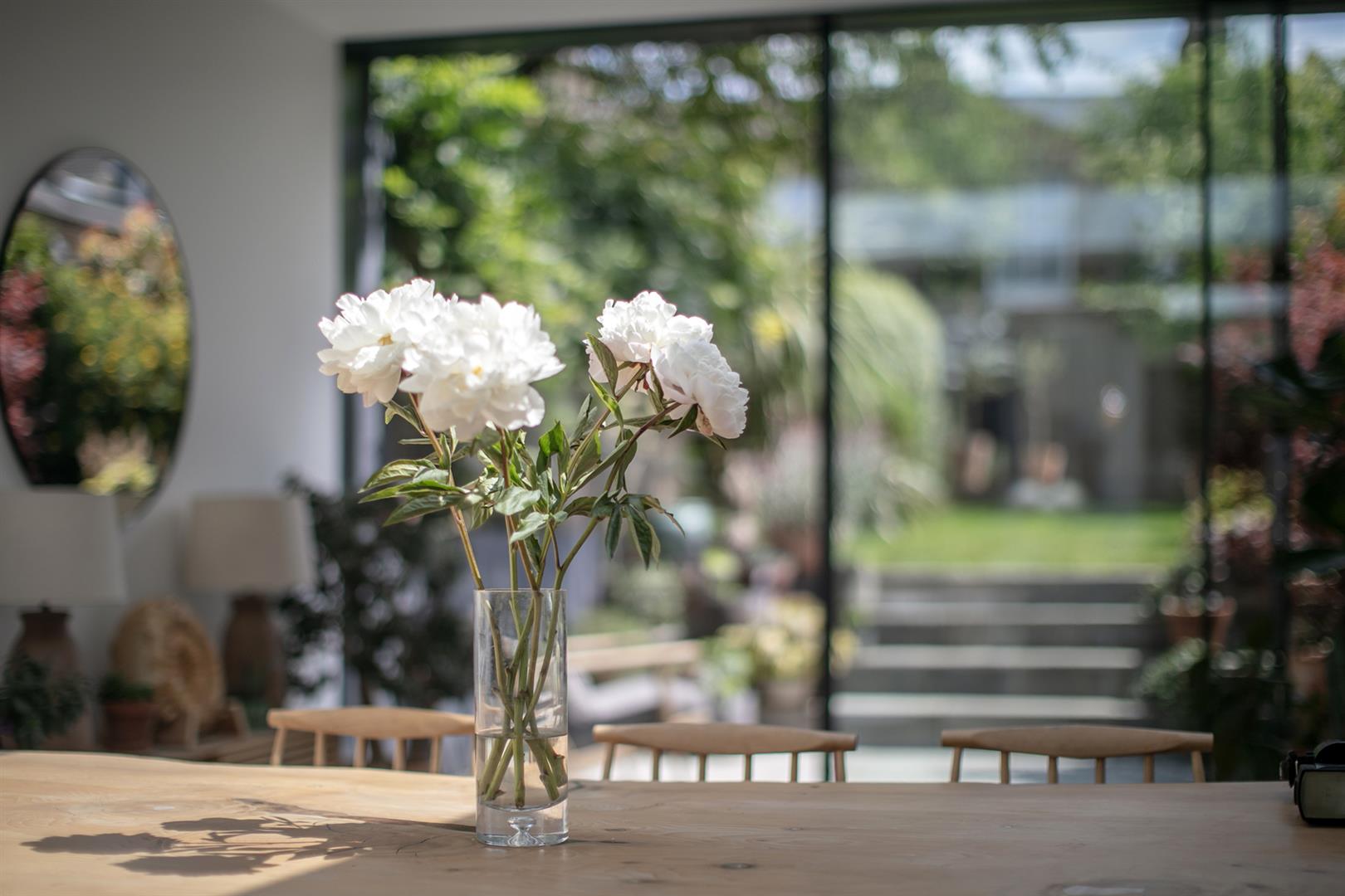 A spacious family dining area sits under the second (even larger) skylight. Spectacular full-width bespoke Compass sliding glass doors face rear framing your garden perfectly. Venturing outside rewards with a pretty paved patio and raised herb planter. Steps rise forth from here to a healthy lawn fringed on either side with a lush array of lovingly cultivated flora including peonies, Acer, mature wisteria, Japanese cherry blossom, fragrant Russian sage and jasmine.
