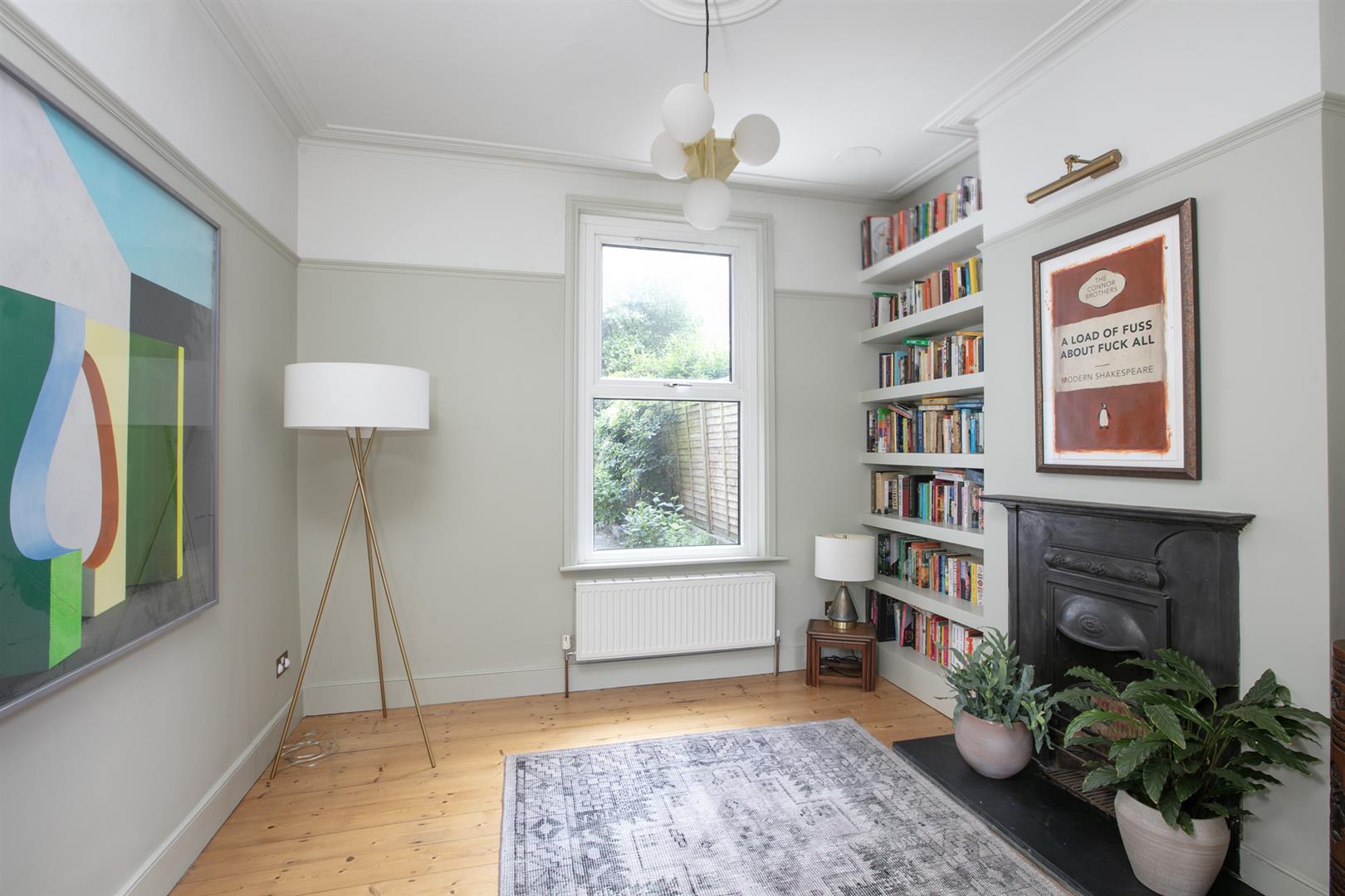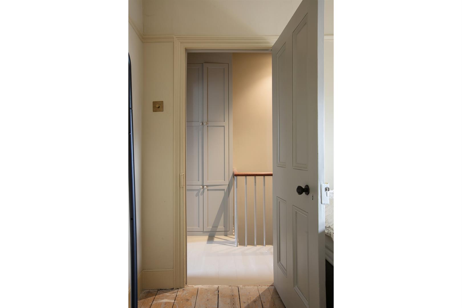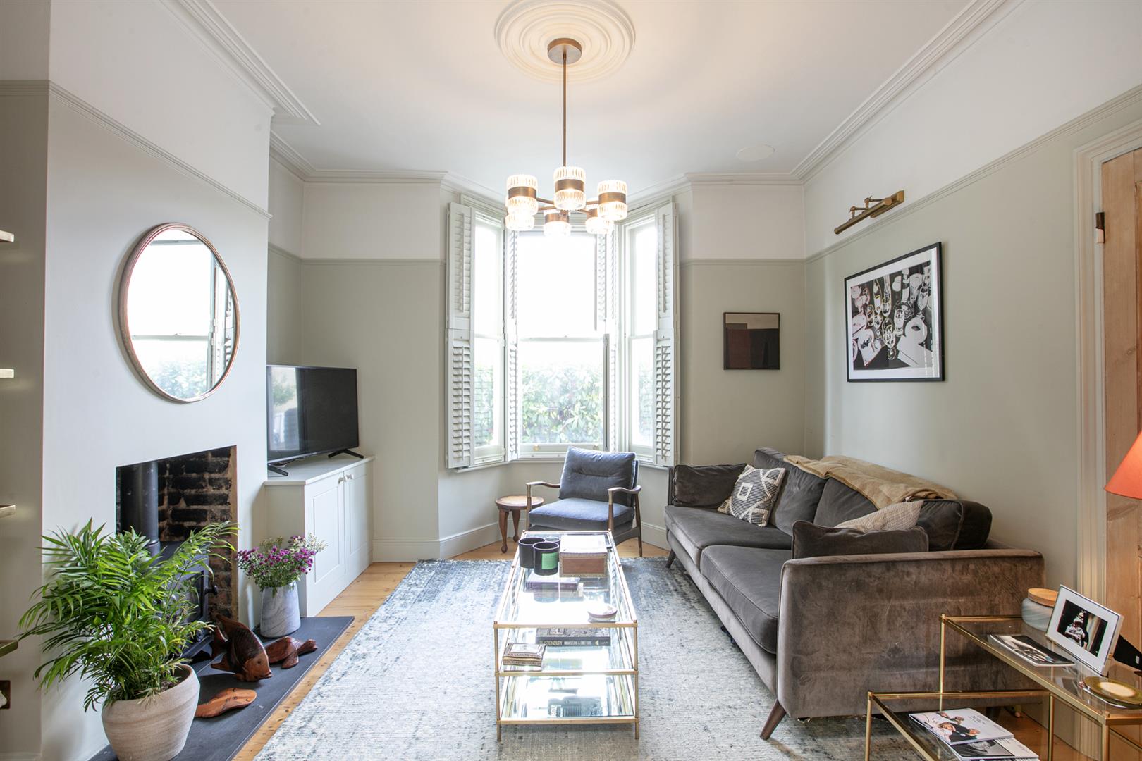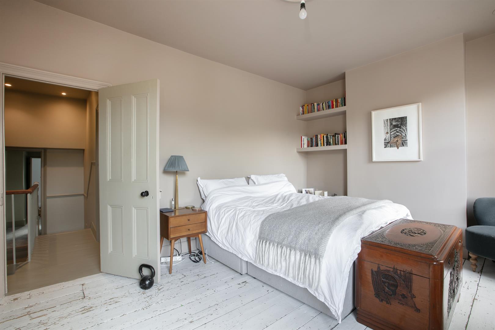Upward bound you meet a carpeted first return with more moodily dulcet wall tones. A rear-facing bedroom with stripped timber floors and a pretty streetscape sits next to the bathroom. This boasts a lovely double walk-in shower, contemporary roll top bath and crisp white suite. The first landing has gorgeous painted timber floors and fitted storage. A front-facing master bedroom spreads into the full width of the building with two large sash windows and a wall of floor-to-ceiling fitted storage. The ceiling has been colour-drenched for a uniform tasteful vibe. Bedroom three enjoys a calming rear aspect, original storage and dado rails. The loft enjoys solid boarding, lighting and a newly instated fitted ladder. It's fantastic for storage and fully insulated to improve energy efficiency.