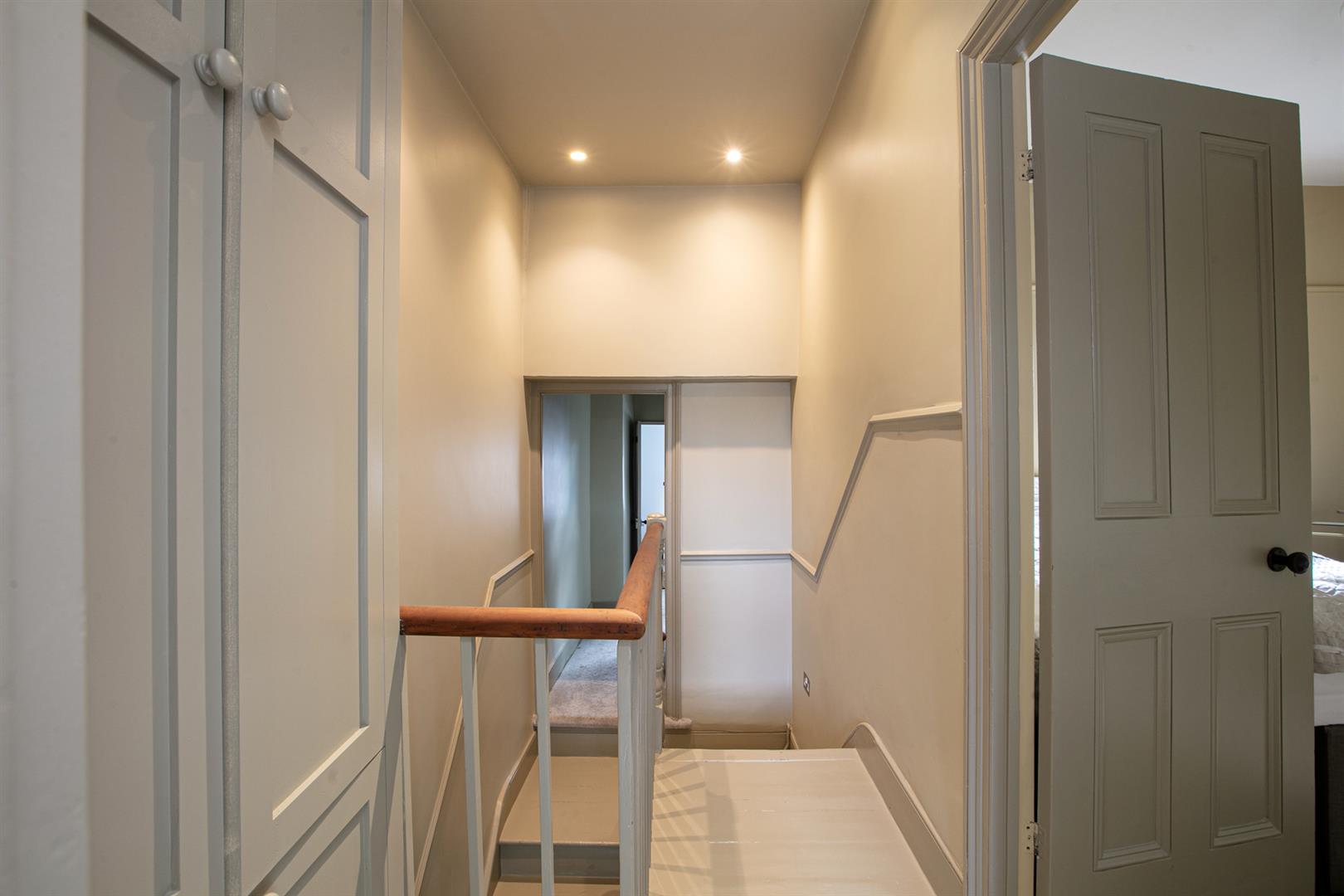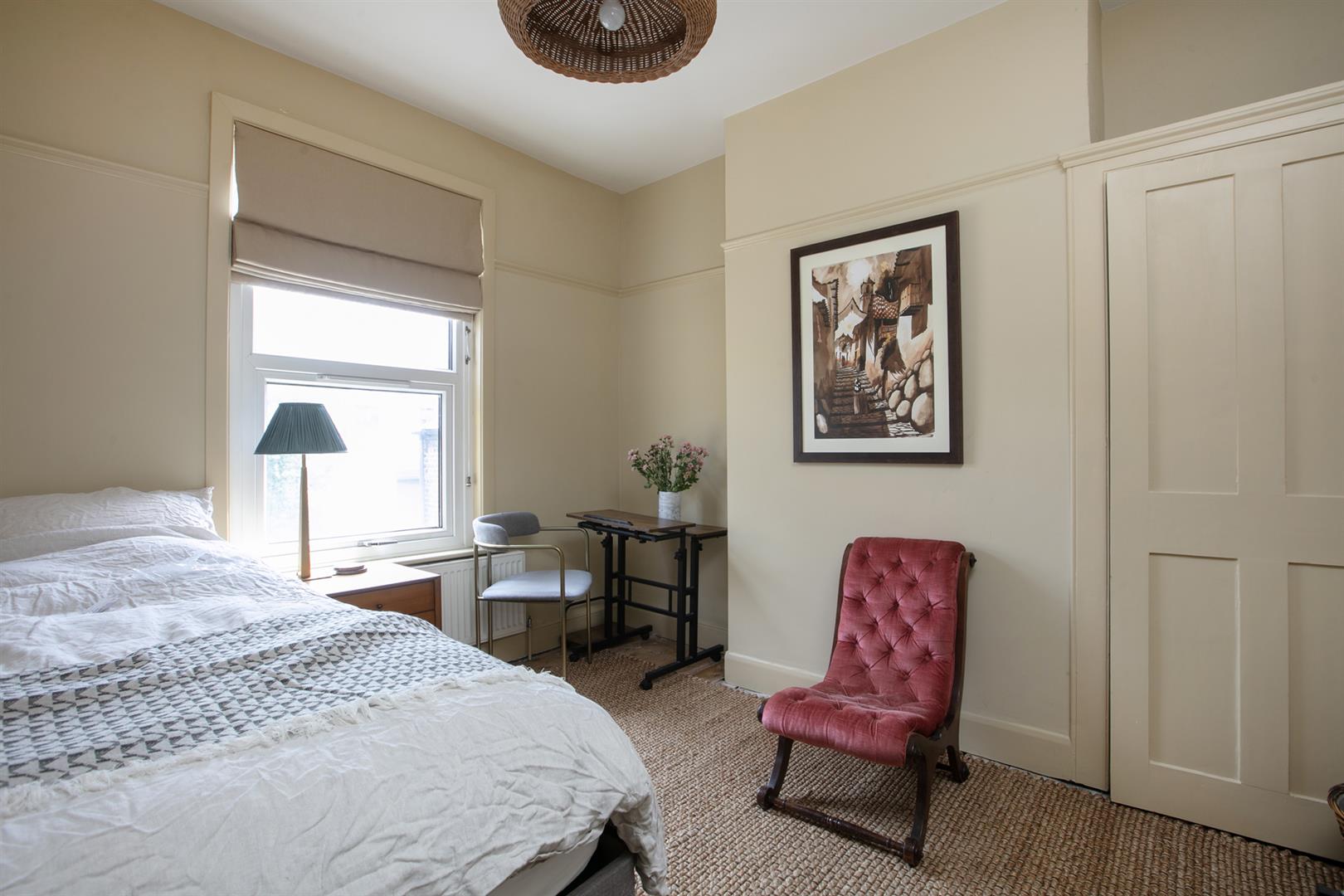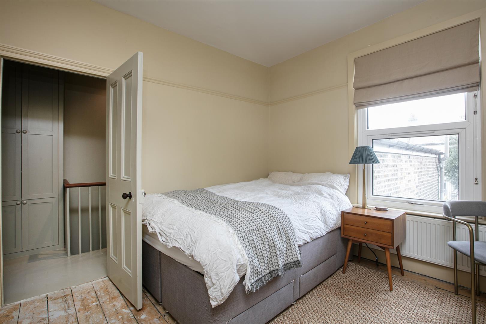 Upward bound you meet a carpeted first return with more moodily dulcet wall tones. A rear-facing bedroom with stripped timber floors and a pretty streetscape sits next to the bathroom. This boasts a lovely double walk-in shower, contemporary roll top bath and crisp white suite. The first landing has gorgeous painted timber floors and fitted storage. A front-facing master bedroom spreads into the full width of the building with two large sash windows and a wall of floor-to-ceiling fitted storage. The ceiling has been colour-drenched for a uniform tasteful vibe. Bedroom three enjoys a calming rear aspect, original storage and dado rails. The loft enjoys solid boarding, lighting and a newly instated fitted ladder. It's fantastic for storage and fully insulated to improve energy efficiency.
