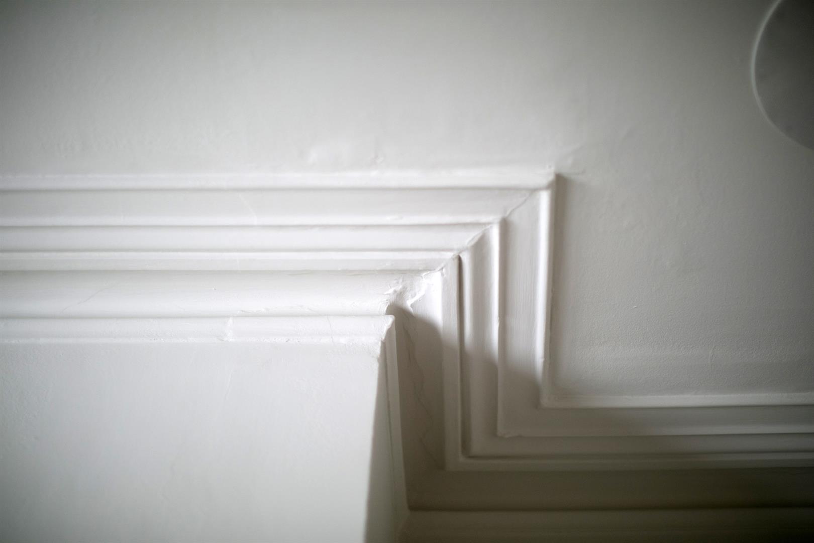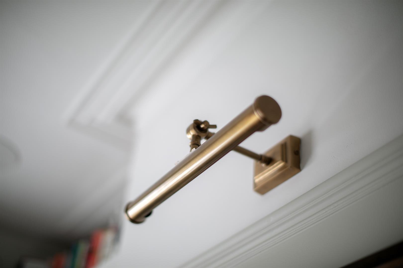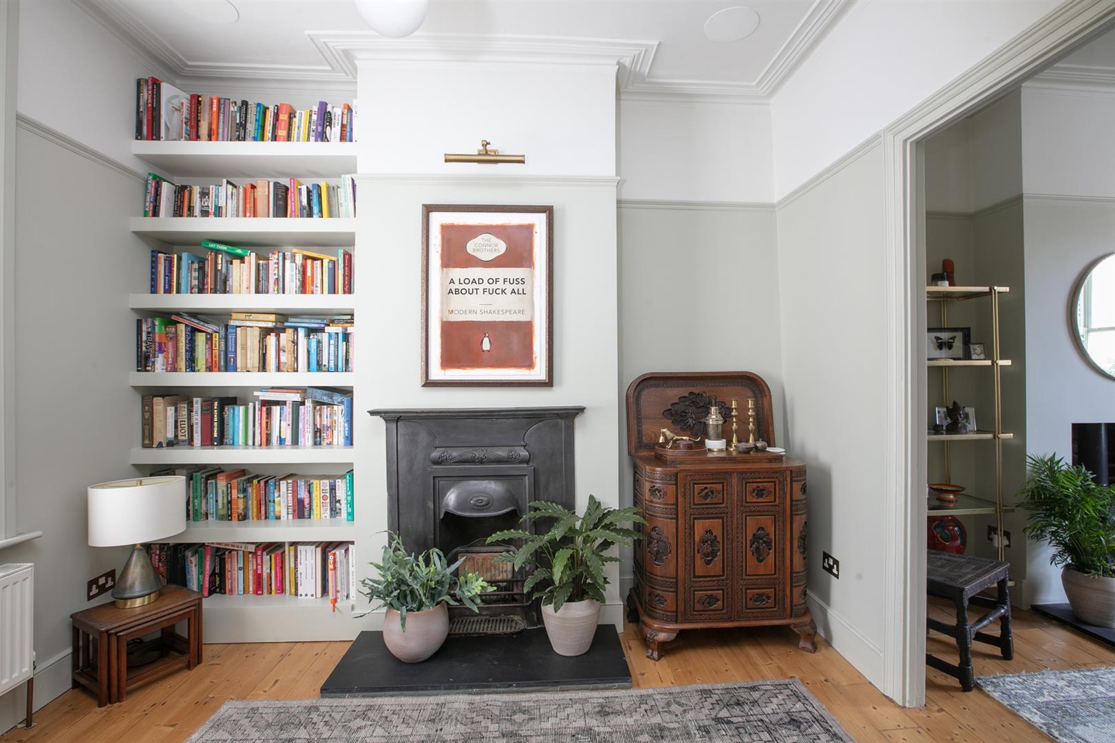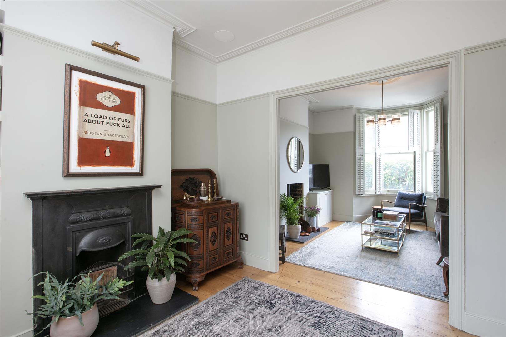The hall greets you with the usual period pleasantries - high ceilings, dado rails, cornicing and corbels. Breathtakingly expensive 'Corston Architectural' antique brass light fixtures and sockets (as throughout) finish the look perfectly. Stripped timber floors run to the double reception which stretches generously from the front bay to the rear sash windows. There's a wood burner and dishy feature fireplace, louvered blinds and low level storage units. The walls are Little Green's 'Green Stone' and there's a complimentary 'Green Stone Light' on the frieze. The first of the Integrated sound system is to be enjoyed here. The speakers are individually sprayed to match the ceiling colour meaning they blend in perfectly.