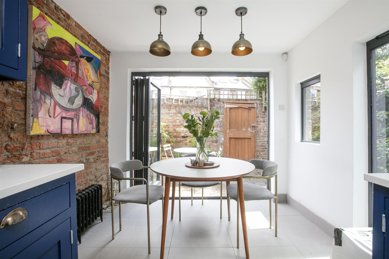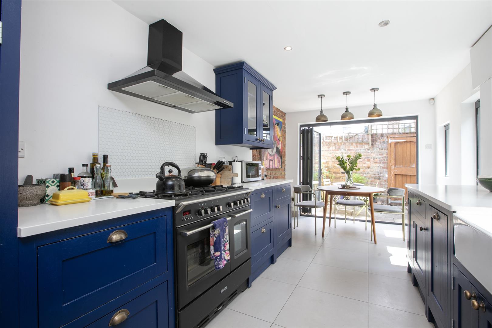 Further along the hall you find cleverly tucked laundry cupboard under the stairs next to a handy loo. A sliding door opens politely to the kitchen/diner which has plenty of cabinet and counter space. You'll also note a ceramic butler sink, five ring gas range, integrated fridge/freezer and dishwasher. The dining area sits to the rear preceding lovely bi-fold doors to the wrap-around patio garden. Direct access to Sternall Lane makes it easier for the cyclists and dog owners amongst us.