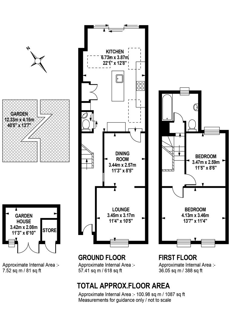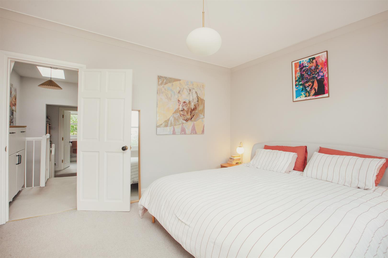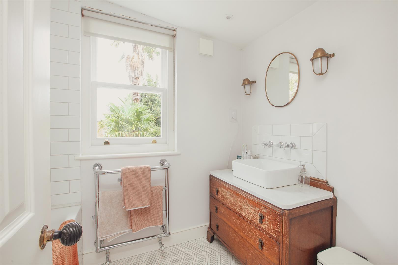 Upstairs you find a pleasant carpeted landing leading to a front aspect double bedroom with two double glazed sash window, school house radiator and cool grey walls. Bedroom two - another fine double faces rear with much the same styling. The bathroom completes the tour with honeycomb floor tiles, bath with drencher, heated towel rail and a lovely contemporary wash hand basin atop a vintage wooden cabinet.