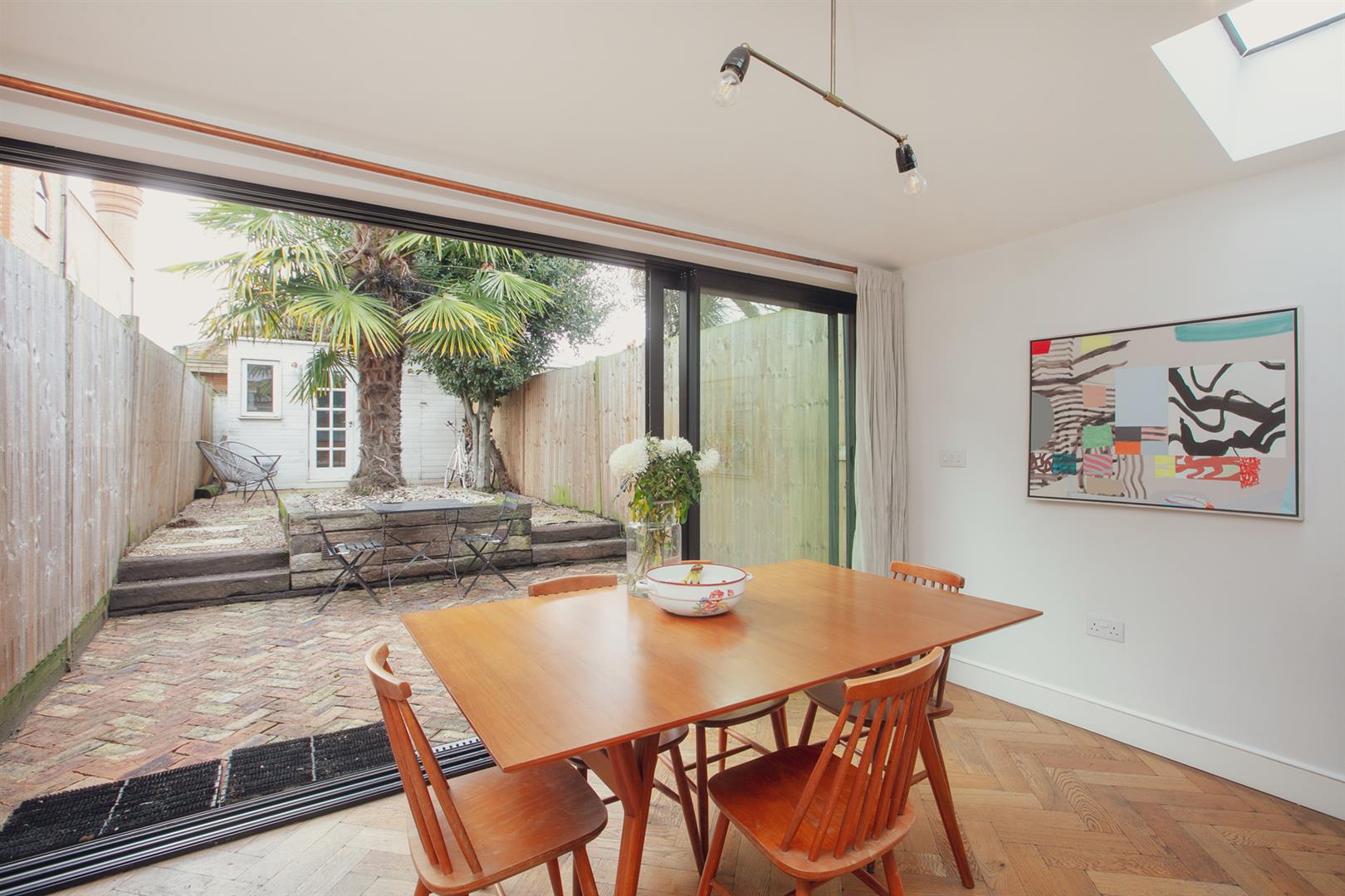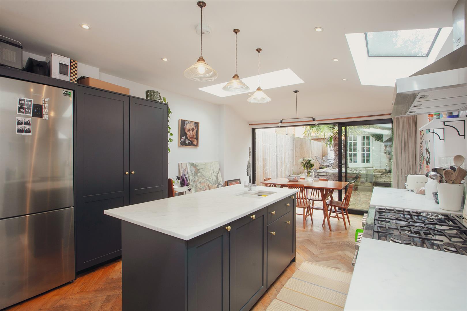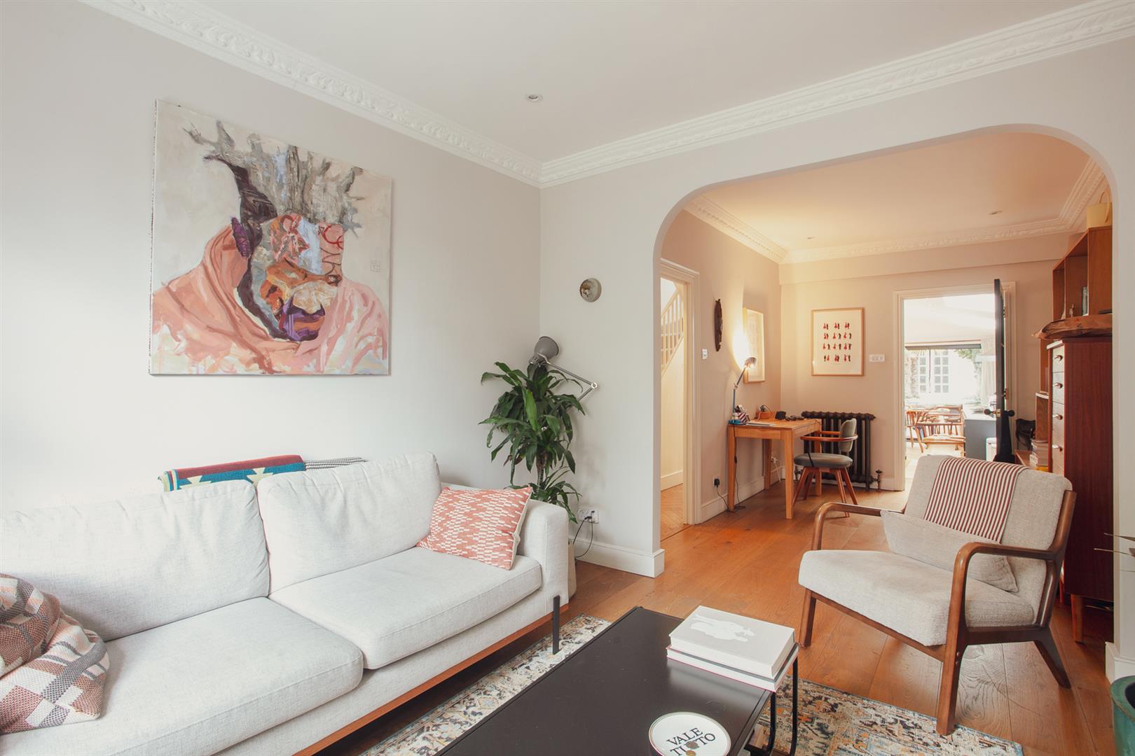 A pretty exterior sits behind mature foliage and a nicely sized front garden with space for bikes and bins. The hall introduces the timelessly tasteful theme of soft white walls and textured parquet flooring. There's an arched cornice and simple coving too. The double reception sits to the right and has complimentary wide board wooden flooring, school house radiator and a large front aspect double glazed sash window peering over the front garden. To the rear there's a tasteful glass pane door leading down one step to the full-width kitchen/diner extension which exudes cosiness while supplying a bright, spacious, dining, cooking and entertaining space.