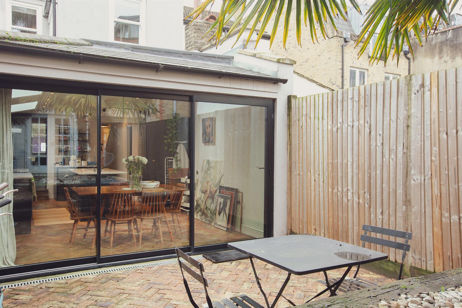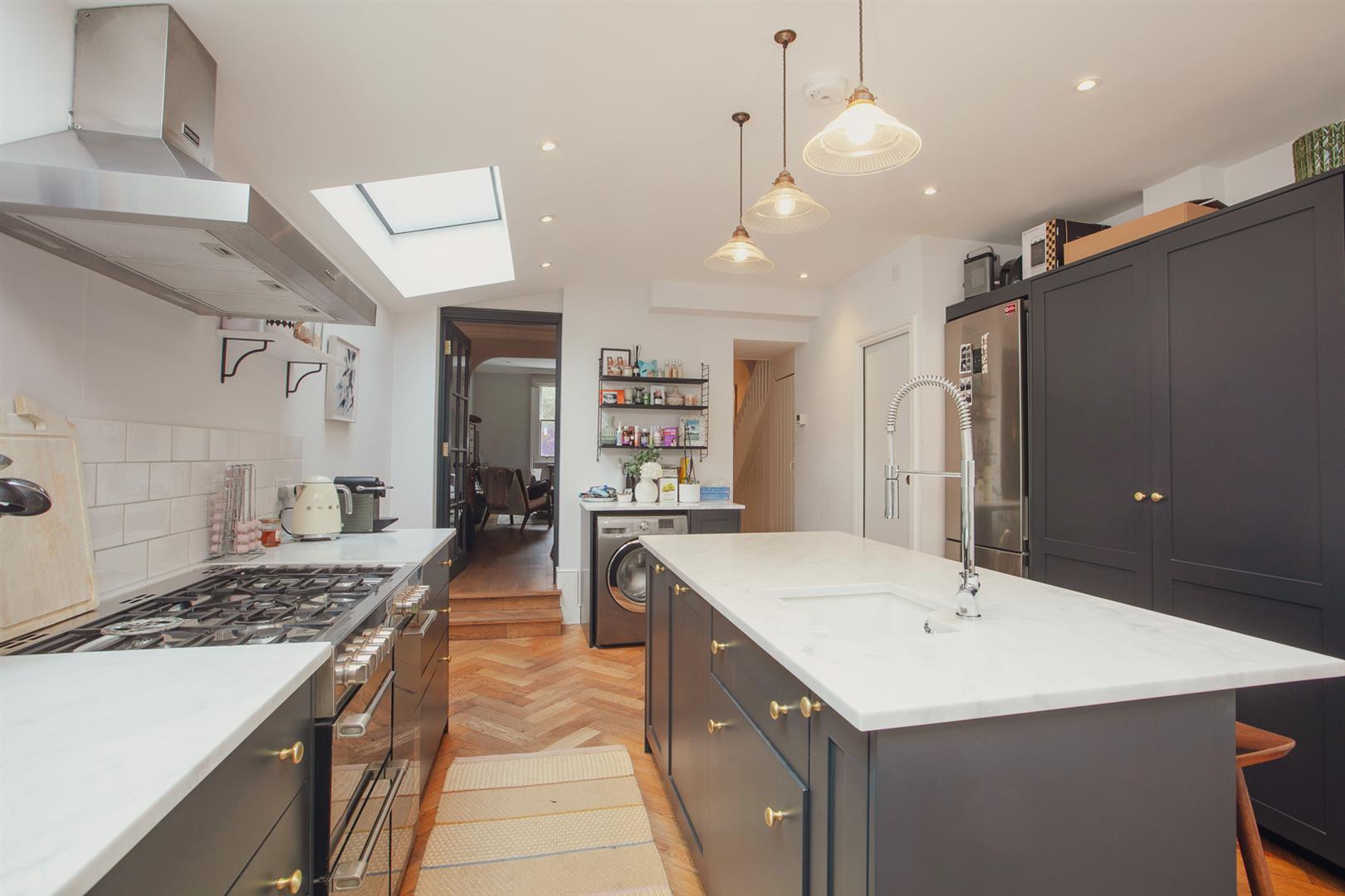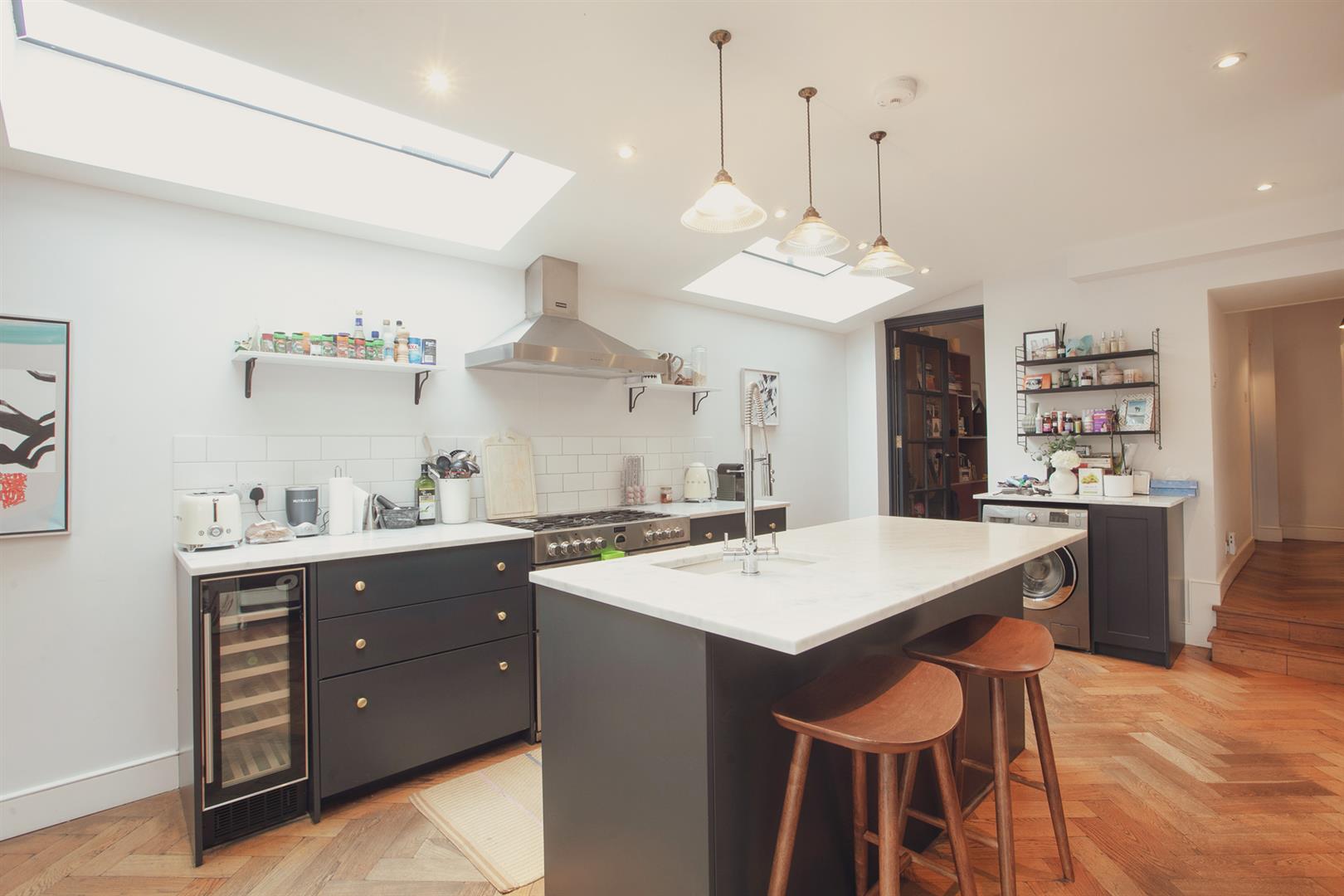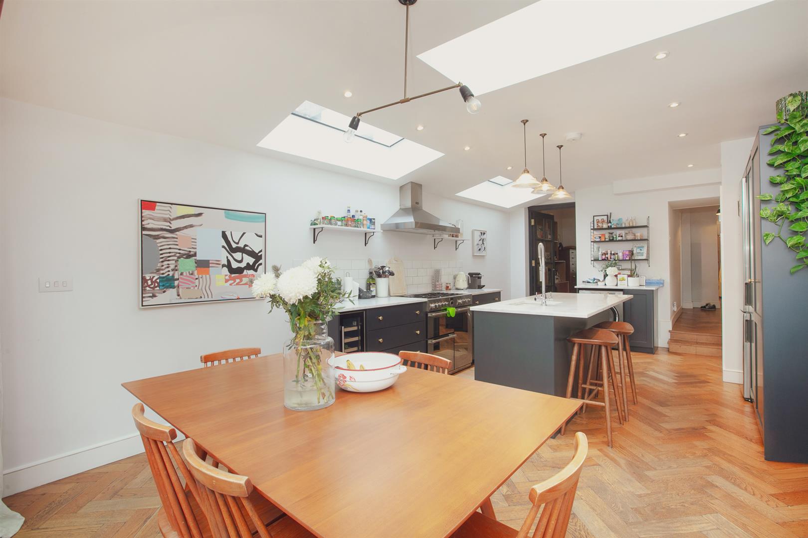 A pretty exterior sits behind mature foliage and a nicely sized front garden with space for bikes and bins. The hall introduces the timelessly tasteful theme of soft white walls and textured parquet flooring. There's an arched cornice and simple coving too. The double reception sits to the right and has complimentary wide board wooden flooring, school house radiator and a large front aspect double glazed sash window peering over the front garden. To the rear there's a tasteful glass pane door leading down one step to the full-width kitchen/diner extension which exudes cosiness while supplying a bright, spacious, dining, cooking and entertaining space.