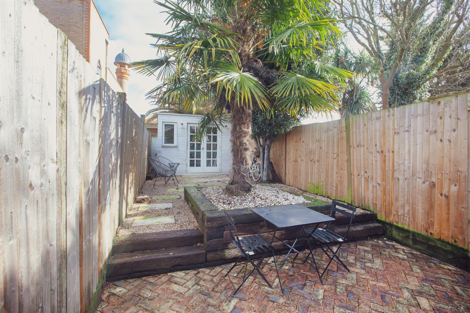 Three large skylights ensure airiness and there's a delightful island with breakfast bar-dining for up to four people. Contemporary counters sit atop sleek, dusky cabinets. Appliances include a five ring gas range and integrated dishwasher and there's a neatly tucked wc on the far wall. The dining area precedes fantastic sliding glass doors which opens to the brick-bed patio. A mature tree offers dapples shade and there's another raised patio space preceding the pretty wooden studio - it offers any amount of uses!
