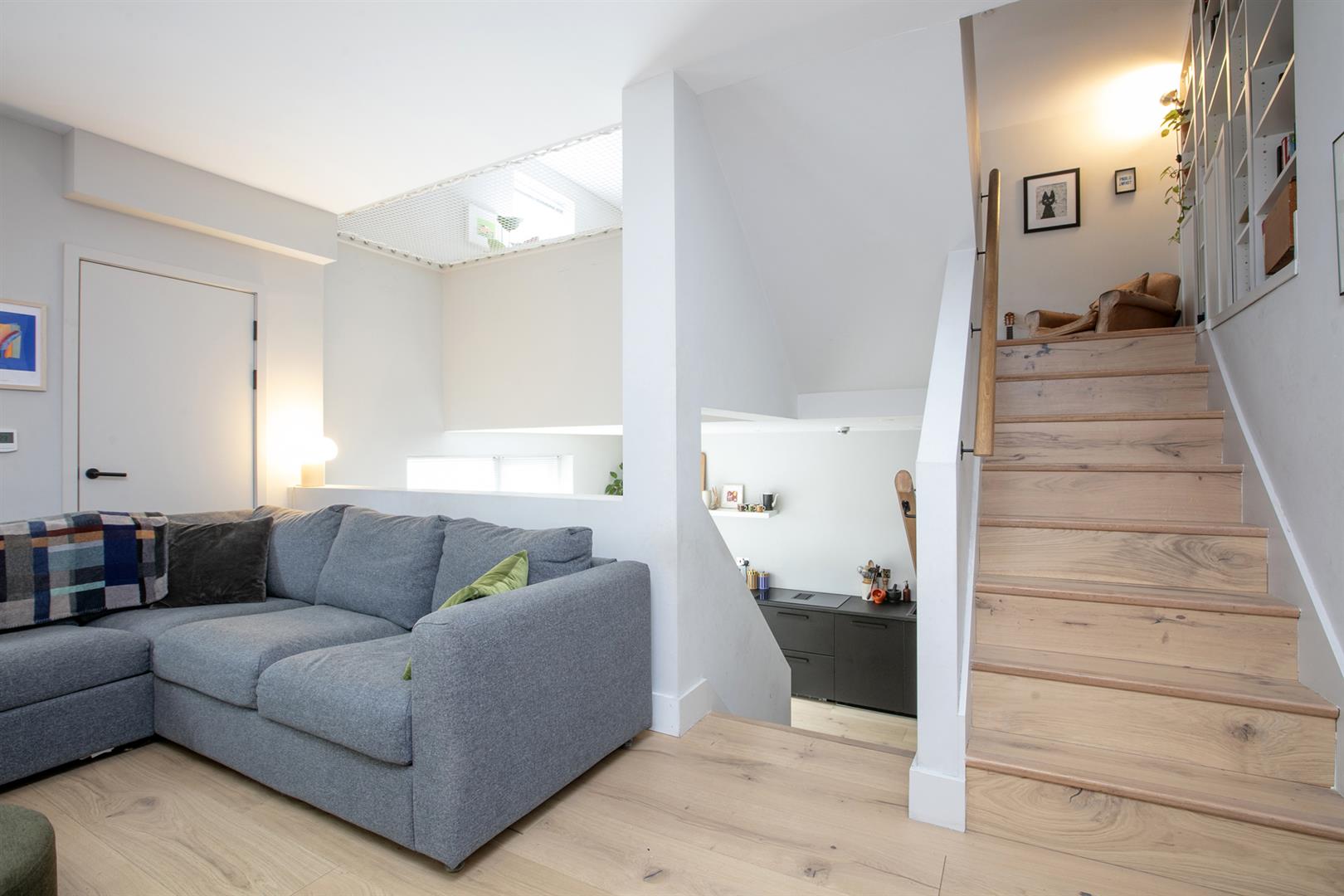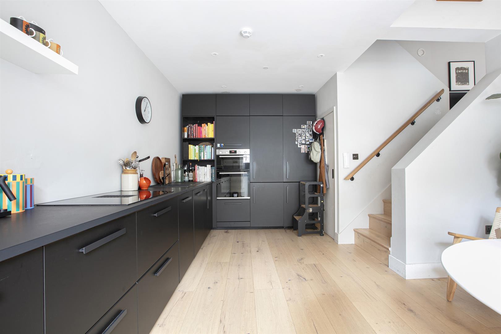 The handsome modern exterior sits behind high secure gates which open to your paved front garden. This hosts the bike and seamless bin storage. Creeping Jasmine supplies a wonderfully welcoming aroma. A further gate to the left opens to a lower front paved patio. The main reception greets you with tonnes of light and that splendid Swedish oiled oak flooring. There's a handy wc and adjoining recessed storage. An open mezzanine supplies light from above and below. Descending a half flight you meet a large kitchen/diner with sleek matt black cabinets and complimentary counters. Appliances include integrated dishwasher, fridge freezer and washing machine and there's a tumle dryer tucked into another recessed storage spot. The induction hob boasts an integrated extractor. A comfortable dining area precedes wide glass doors that open onto the lower front patio. There's even an integrated cat flap - currently used by Donut - an elegant ginger (not included in the sale).