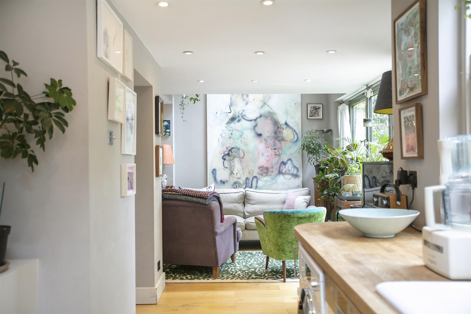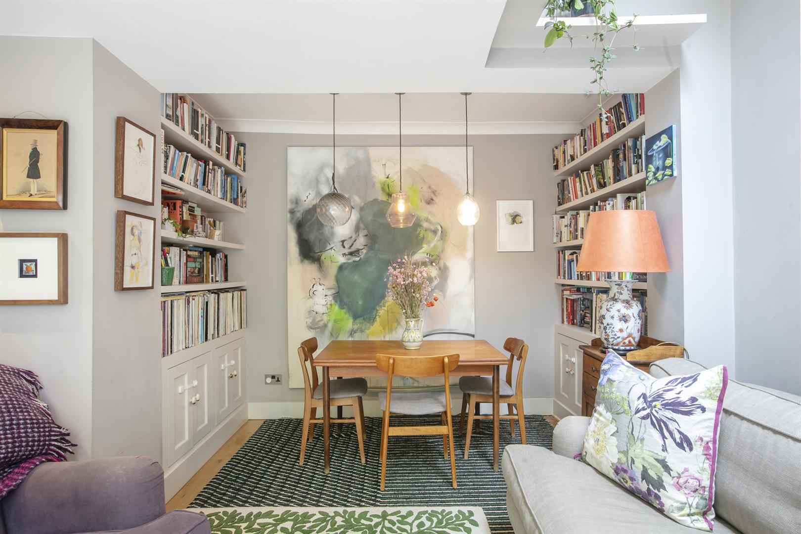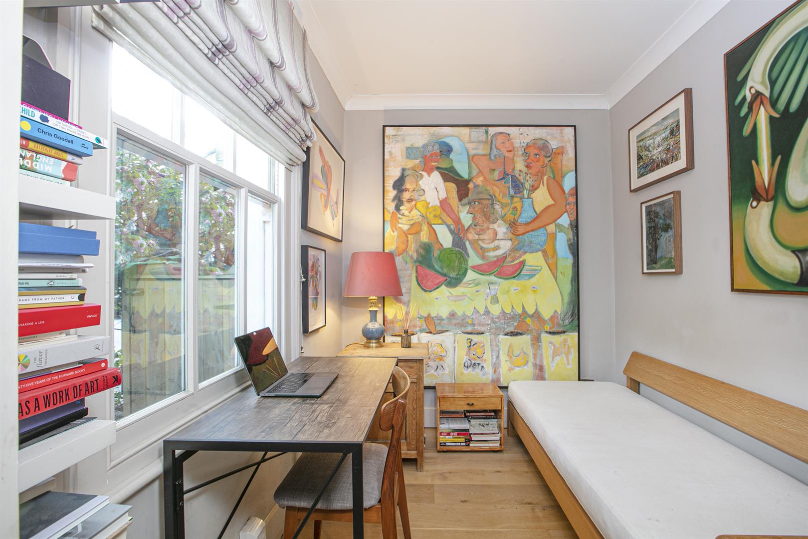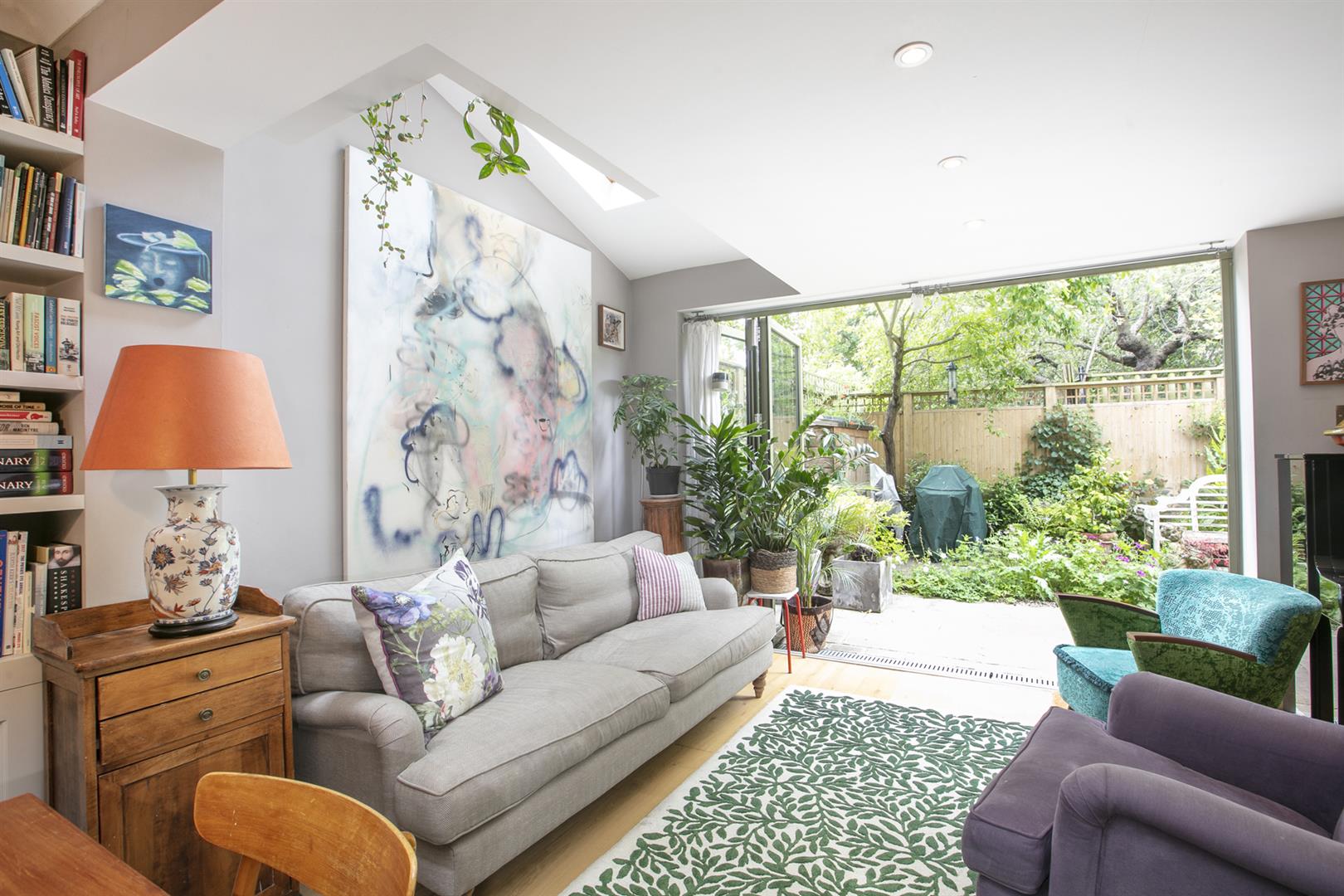 The living space runs open plan from the kitchen with bi-fold doors opening wide to the garden. Skylights supply oodles of light and there's more bespoke storage and shelving. The rear garden is a leafy peaceful and private space with lots of mature shrubs and planter beds. The study/third bedroom sits on the far side of the entrance hall. It's the perfect spot for guest storage or working from home.