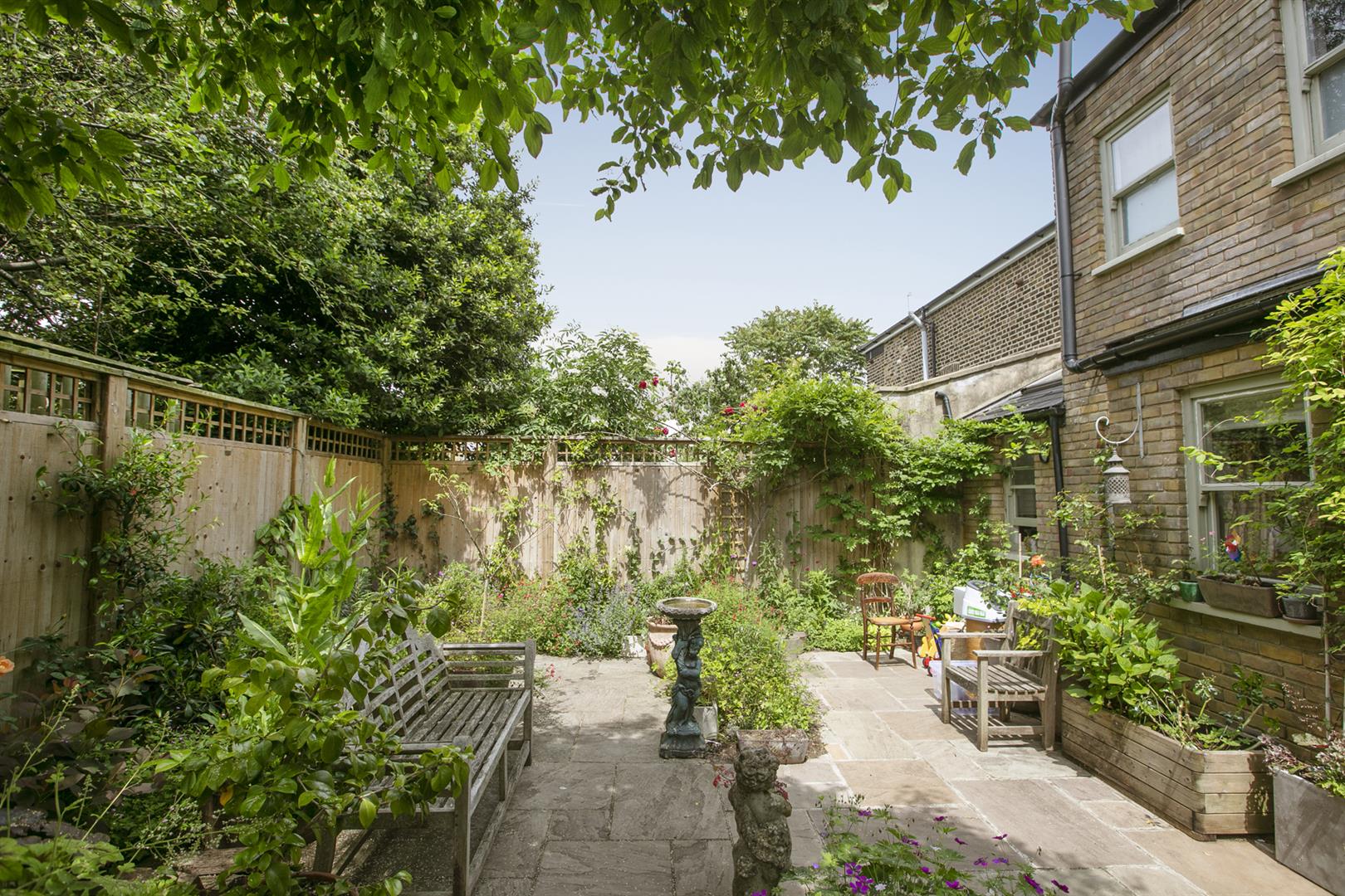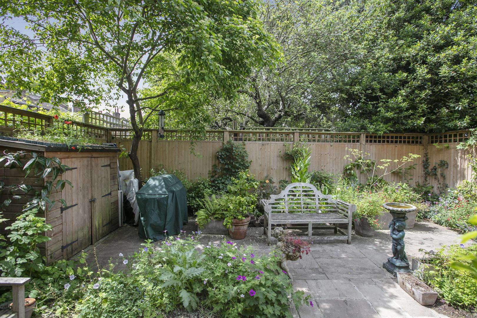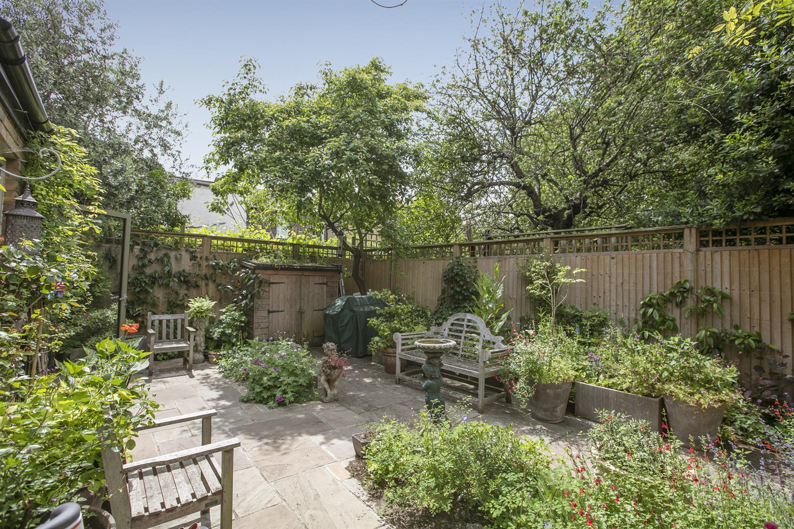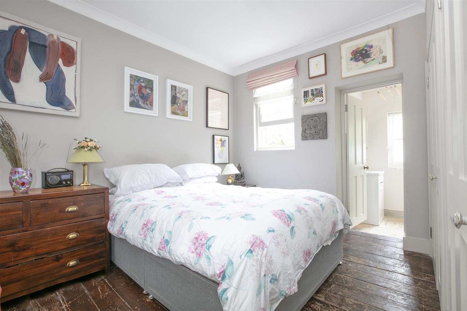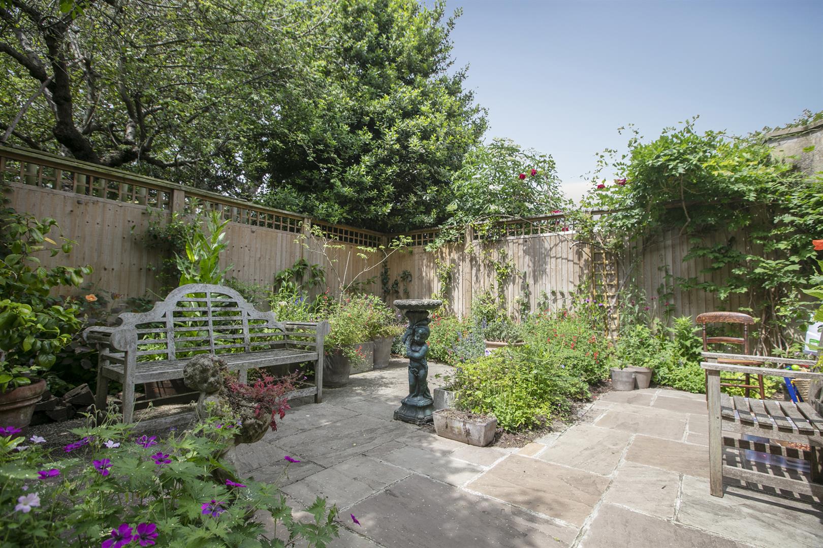 The living space runs open plan from the kitchen with bi-fold doors opening wide to the garden. Skylights supply oodles of light and there's more bespoke storage and shelving. The rear garden is a leafy peaceful and private space with lots of mature shrubs and planter beds. The study/third bedroom sits on the far side of the entrance hall. It's the perfect spot for guest storage or working from home.