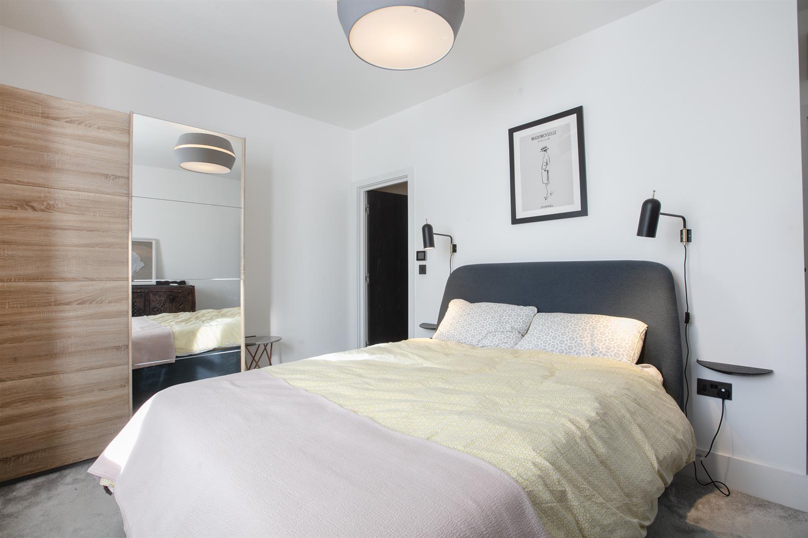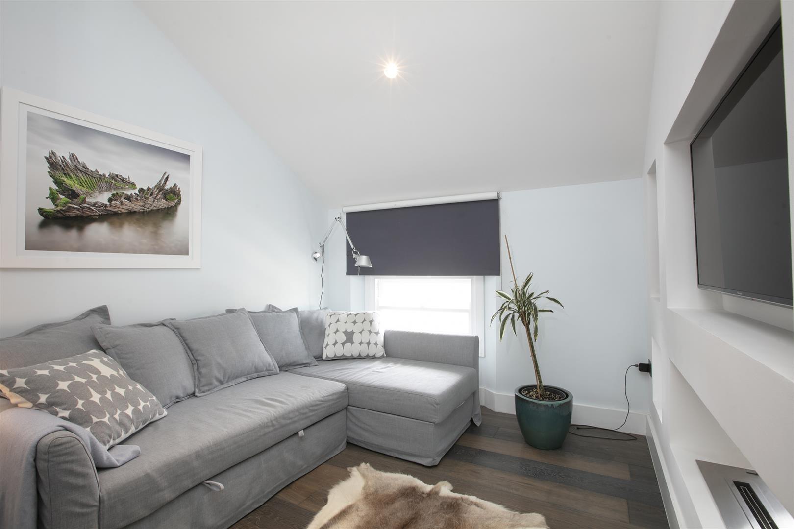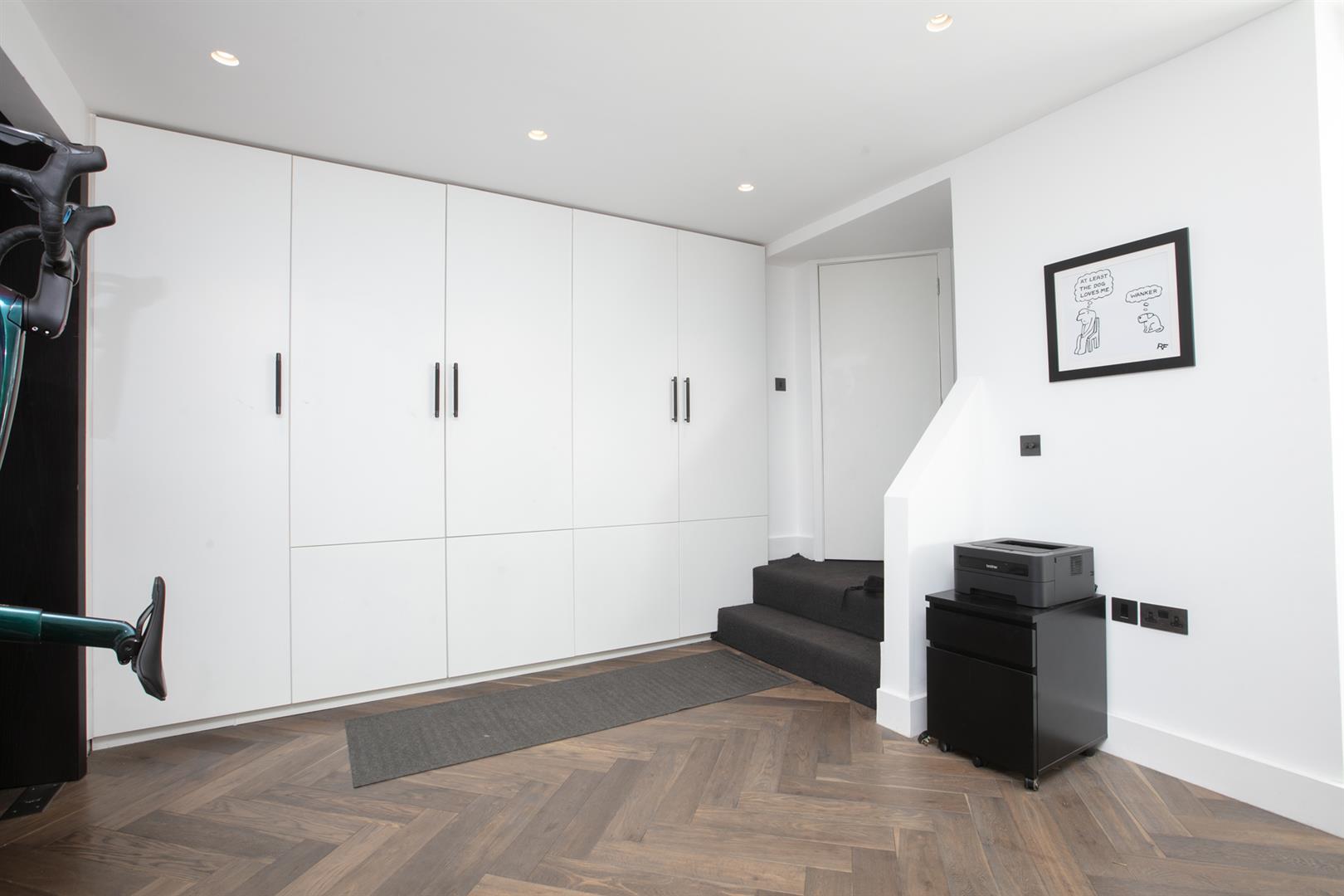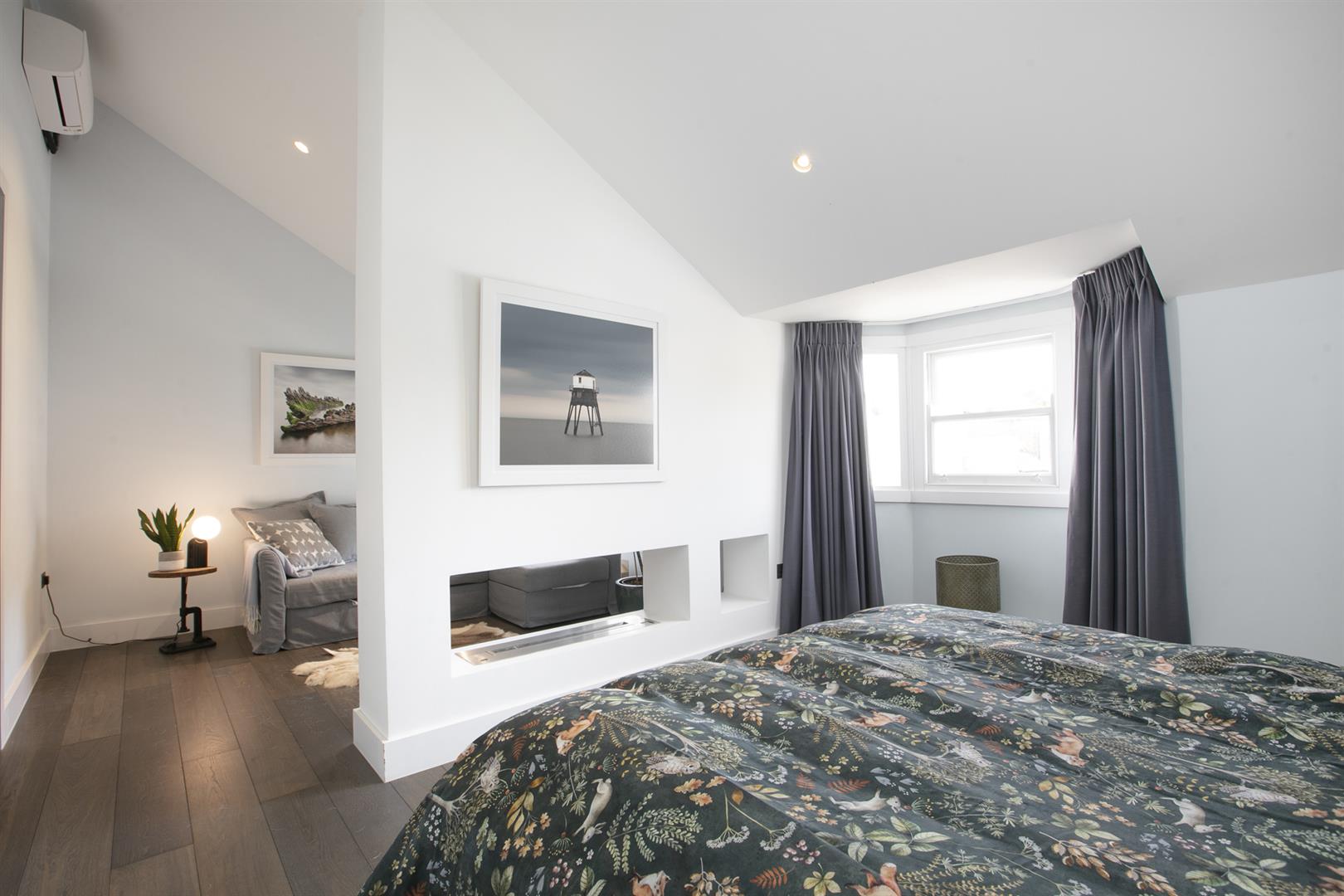 Moving up to the first floor you find a large double bedroom facing rear with views toward Canary Wharf. A second double fronts the street into the bay window. An adjoining en suite shower room sits to the rear. This floor is completed by a third (single) bedroom and a well appointed bathroom. Upward again to the second floor reveals a gobsmacking master suite which spans the full width of the building and incorporates generous seating and slumber space. A further ethanol fireplace will set the mood nicely. Another sizeable double bedroom, currently laid out as a huge dressing room, has ubquitous built-in storage and an adjoining bathroom with contemporary free-standing bath, double walk-in shower and huge Velux skylight.