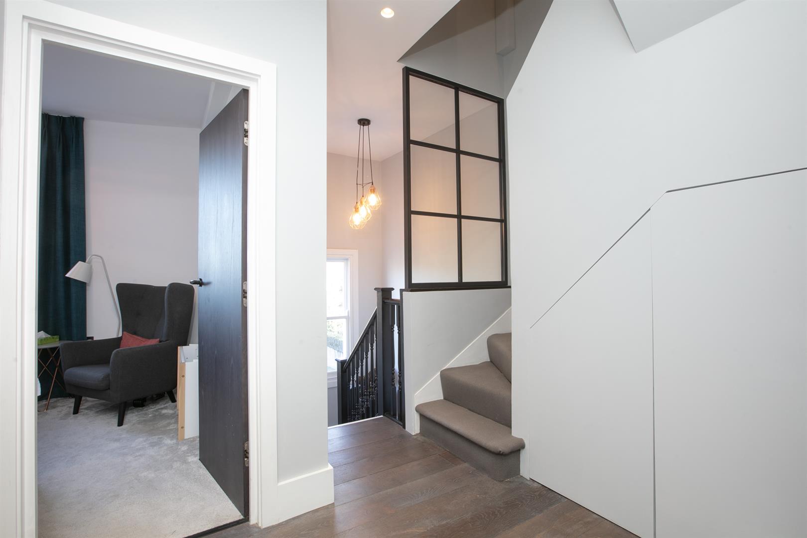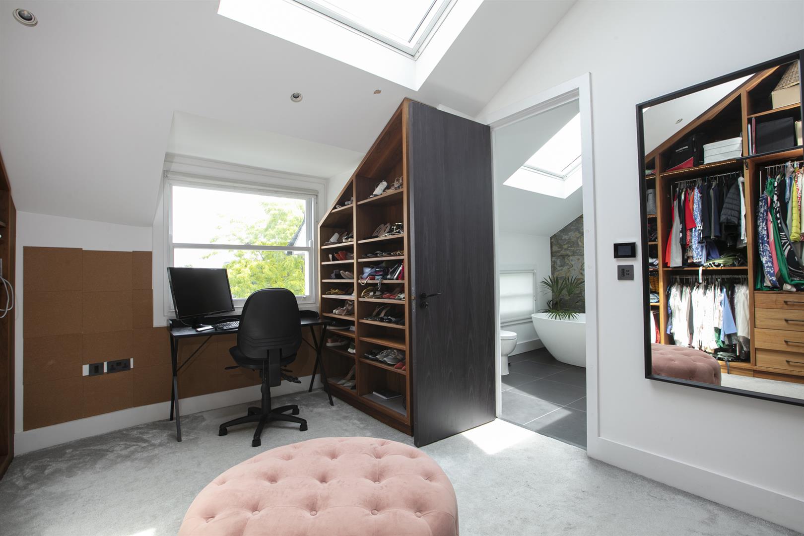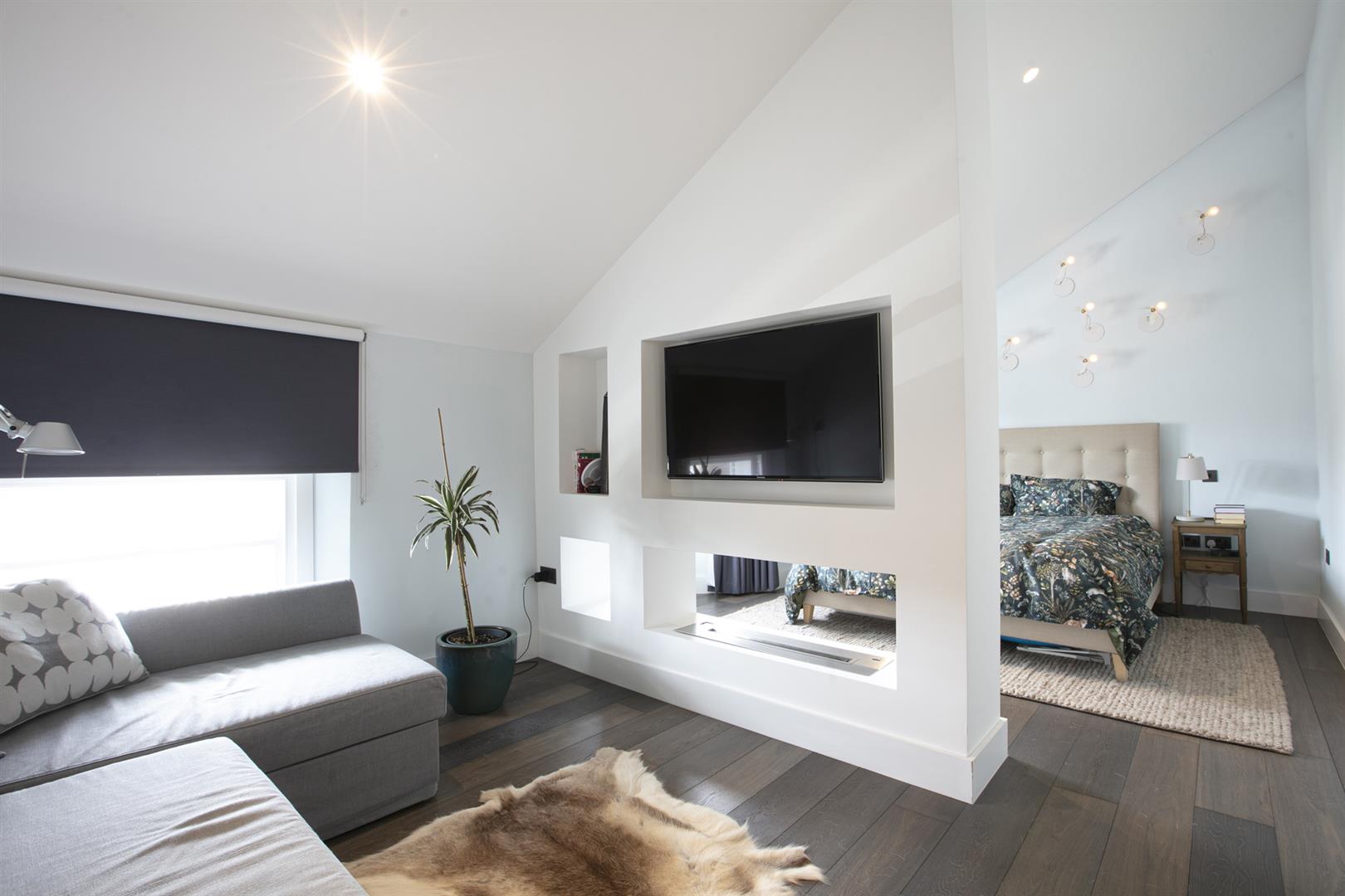 Moving up to the first floor you find a large double bedroom facing rear with views toward Canary Wharf. A second double fronts the street into the bay window. An adjoining en suite shower room sits to the rear. This floor is completed by a third (single) bedroom and a well appointed bathroom. Upward again to the second floor reveals a gobsmacking master suite which spans the full width of the building and incorporates generous seating and slumber space. A further ethanol fireplace will set the mood nicely. Another sizeable double bedroom, currently laid out as a huge dressing room, has ubquitous built-in storage and an adjoining bathroom with contemporary free-standing bath, double walk-in shower and huge Velux skylight.