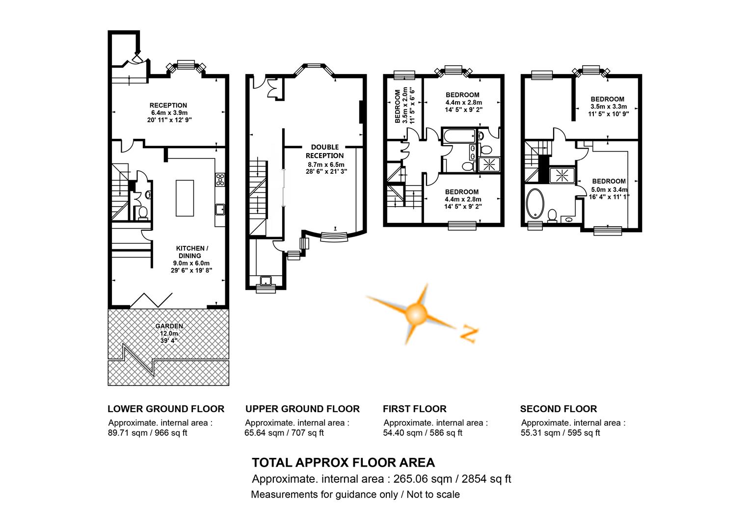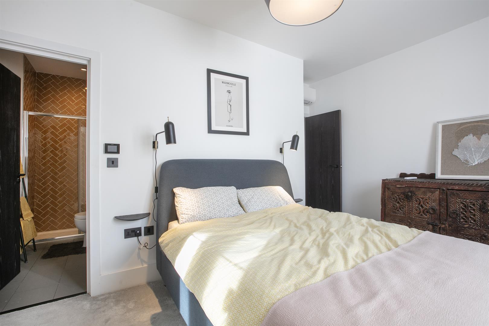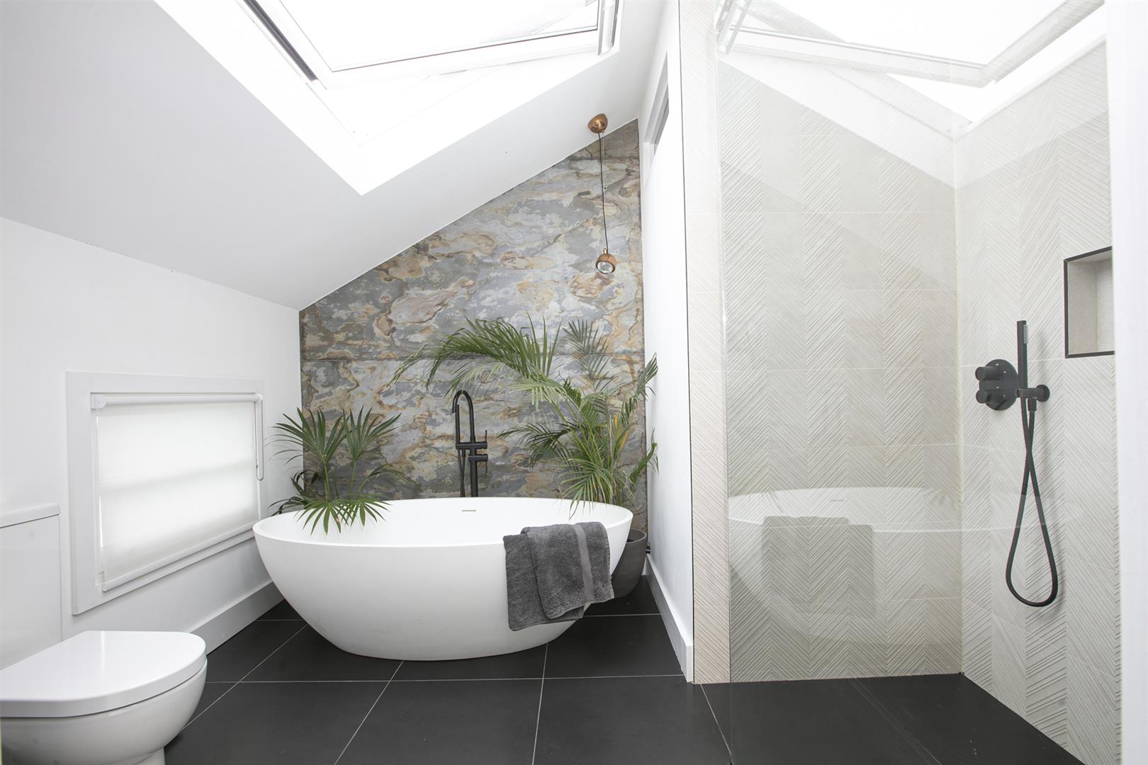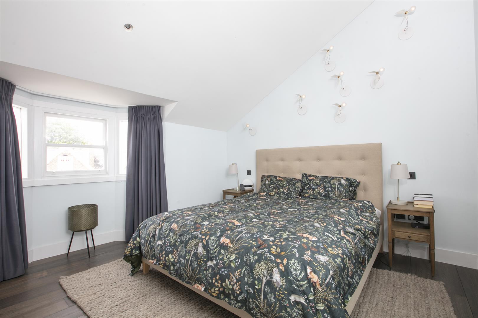 Moving up to the first floor you find a large double bedroom facing rear with views toward Canary Wharf. A second double fronts the street into the bay window. An adjoining en suite shower room sits to the rear. This floor is completed by a third (single) bedroom and a well appointed bathroom. Upward again to the second floor reveals a gobsmacking master suite which spans the full width of the building and incorporates generous seating and slumber space. A further ethanol fireplace will set the mood nicely. Another sizeable double bedroom, currently laid out as a huge dressing room, has ubquitous built-in storage and an adjoining bathroom with contemporary free-standing bath, double walk-in shower and huge Velux skylight.
