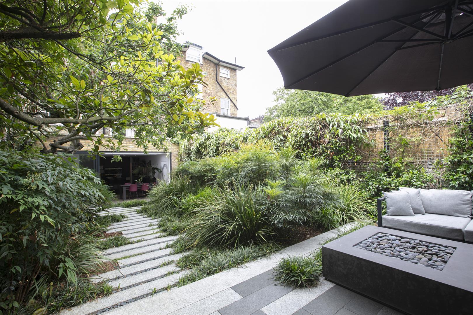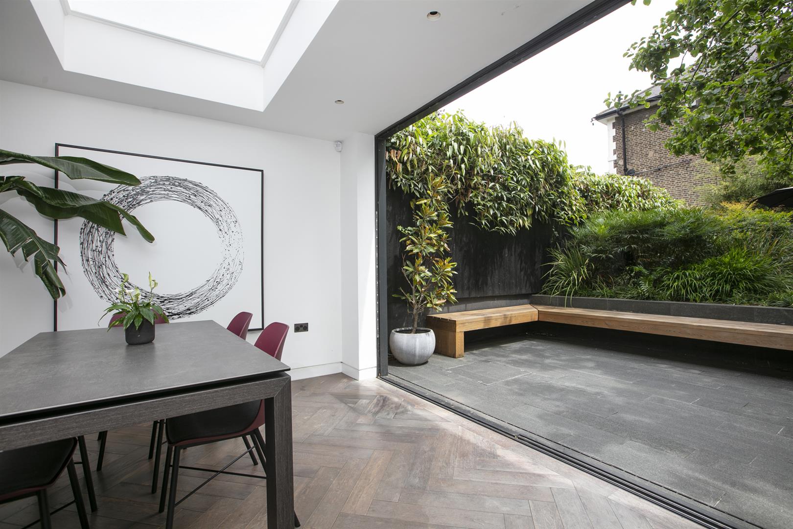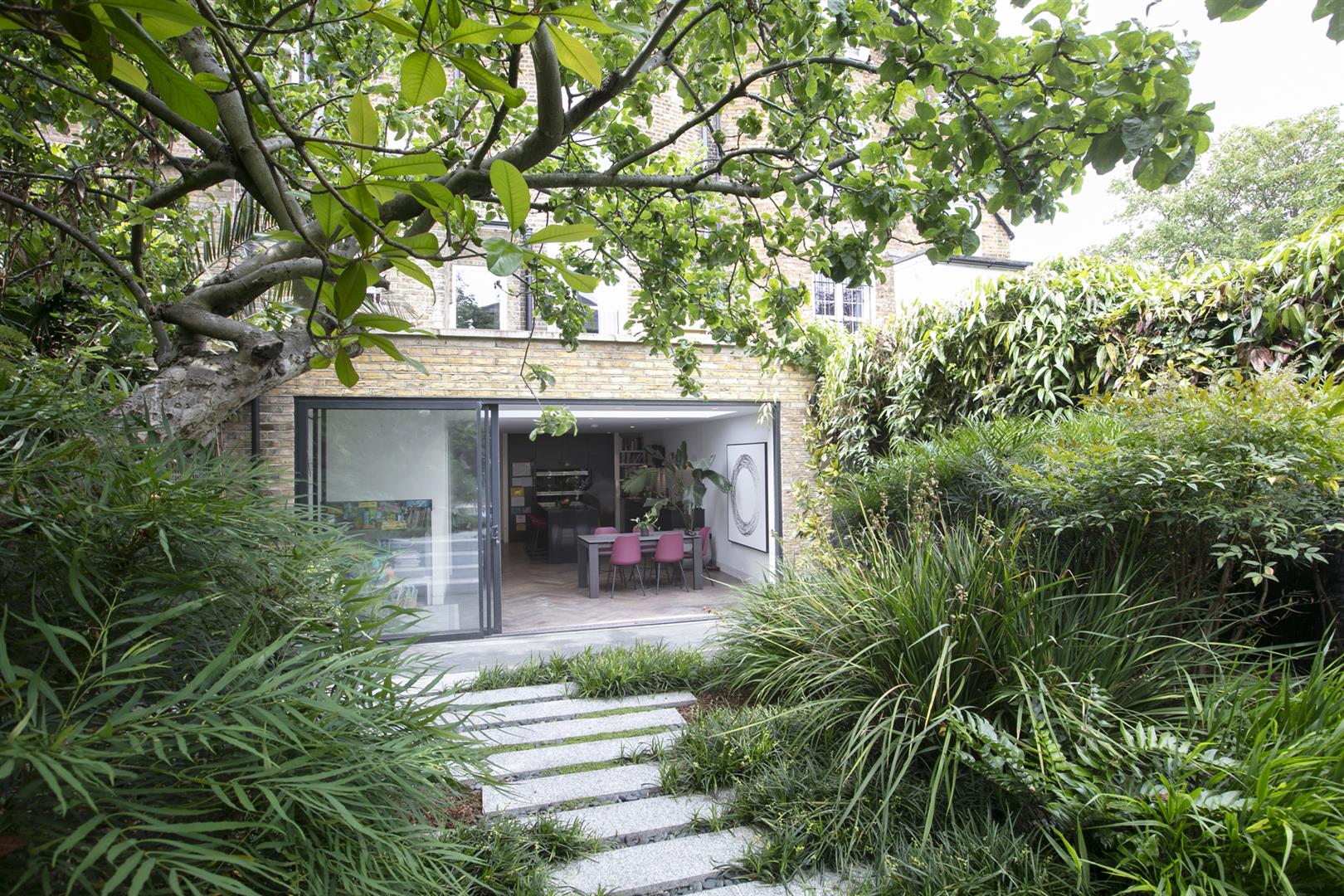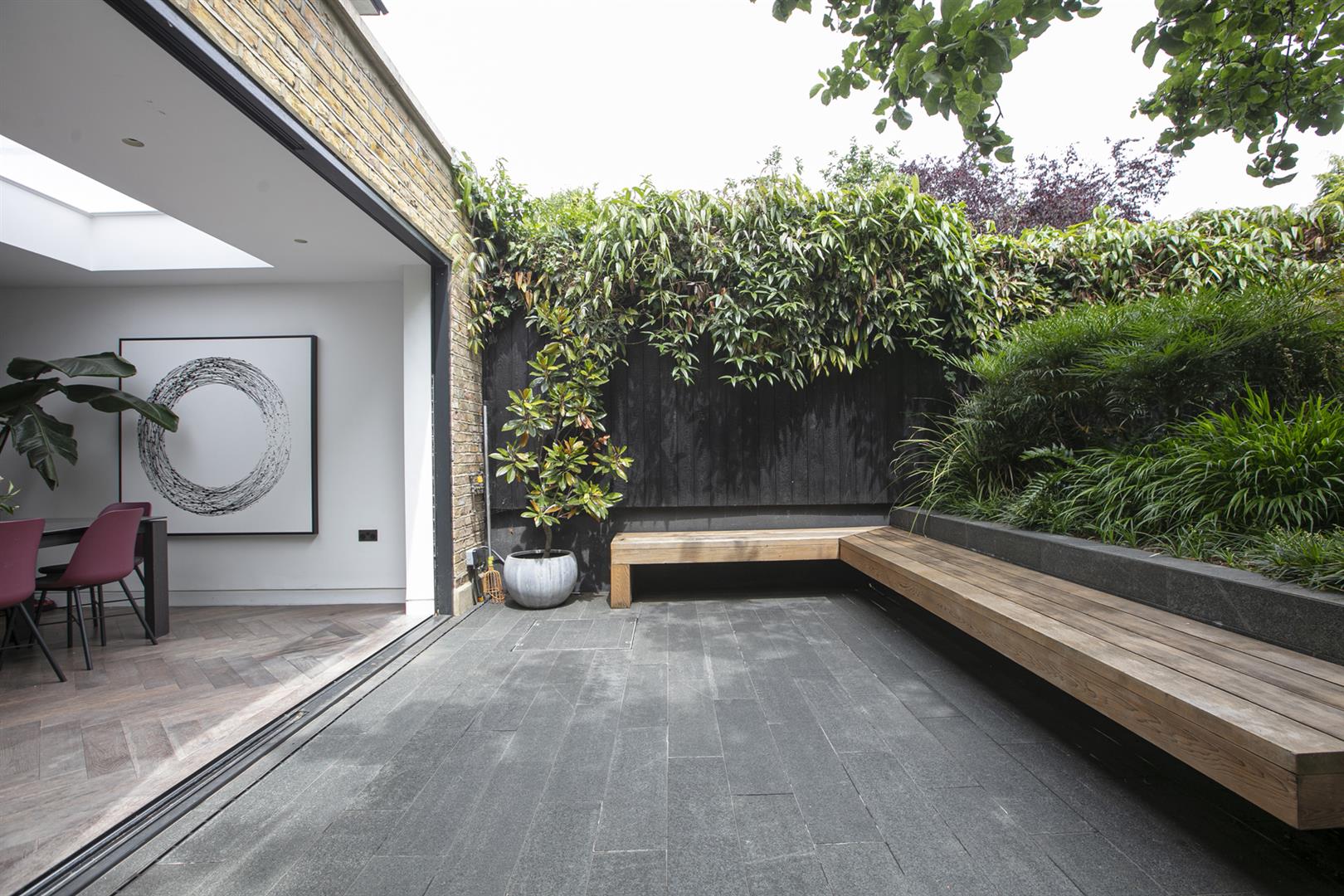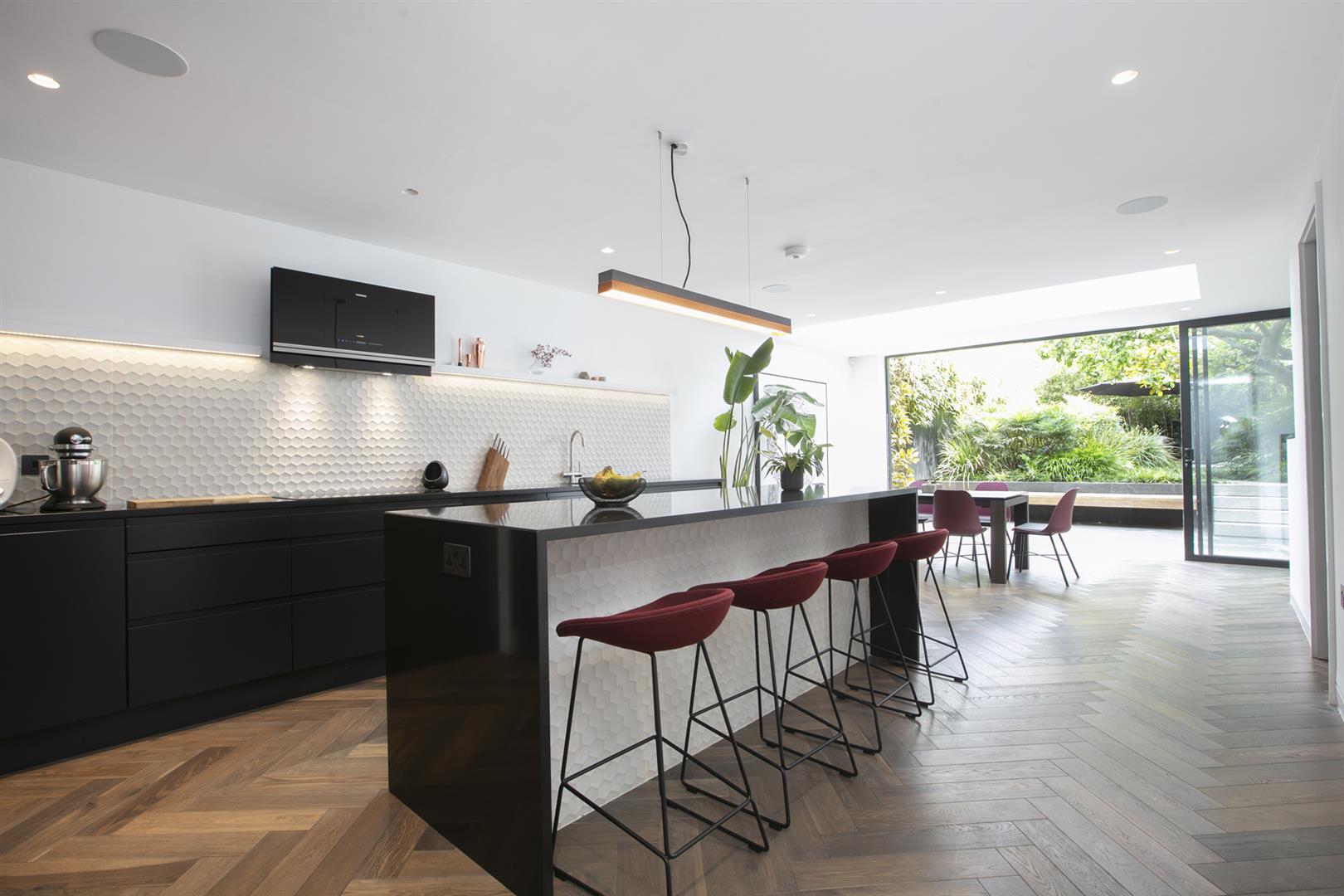Heading downward you meet a further front-facing reception with deep recessed storage and direct front access - great for mucky dogs and unruly kids. A handy wc sits under the stairs. The uniquely fabulous kitchen/diner takes the rear of the lower ground floor with an elegant run of contemporary cabinets and counters. Appliances include an induction hob, integrated coffee machine, double steam oven, dishwasher and a full height fridge and full height separate freezer. There's enough space to seat both sides for Christmas dinner and a cute play area for the kids neatly slotted into the alcove of the adjoining pantry. A wall of wide sliding glass doors open to the fantastic patio and split level garden where an array of well maintained leafiness offers perfect dappled light. A further rear patio enjoys a lovely view back to the house.