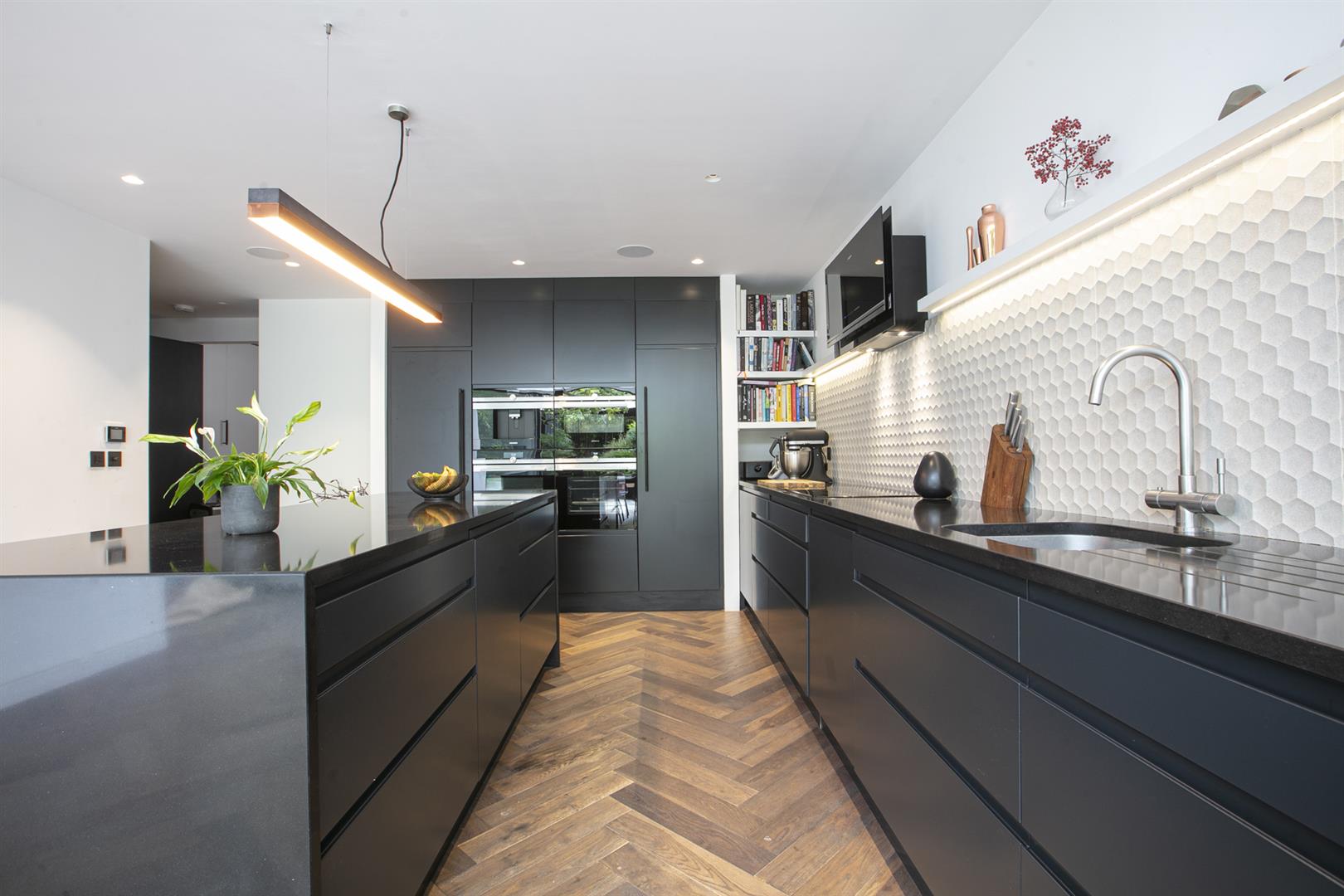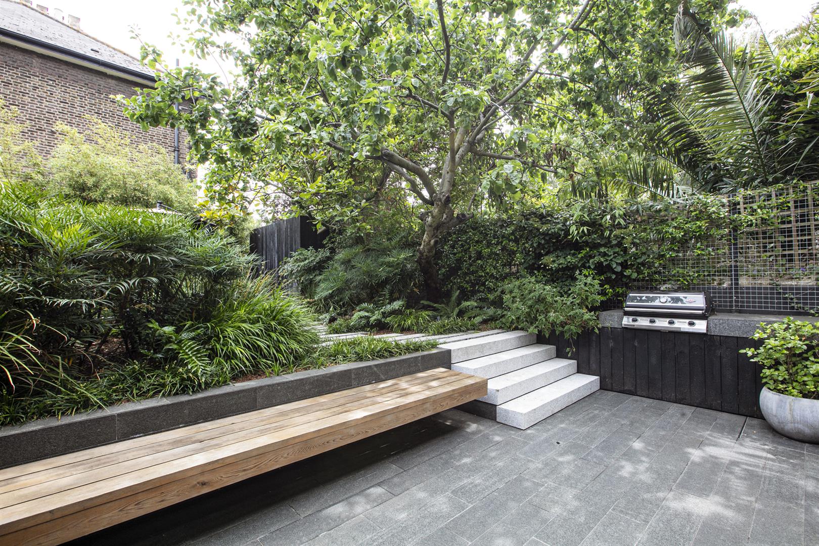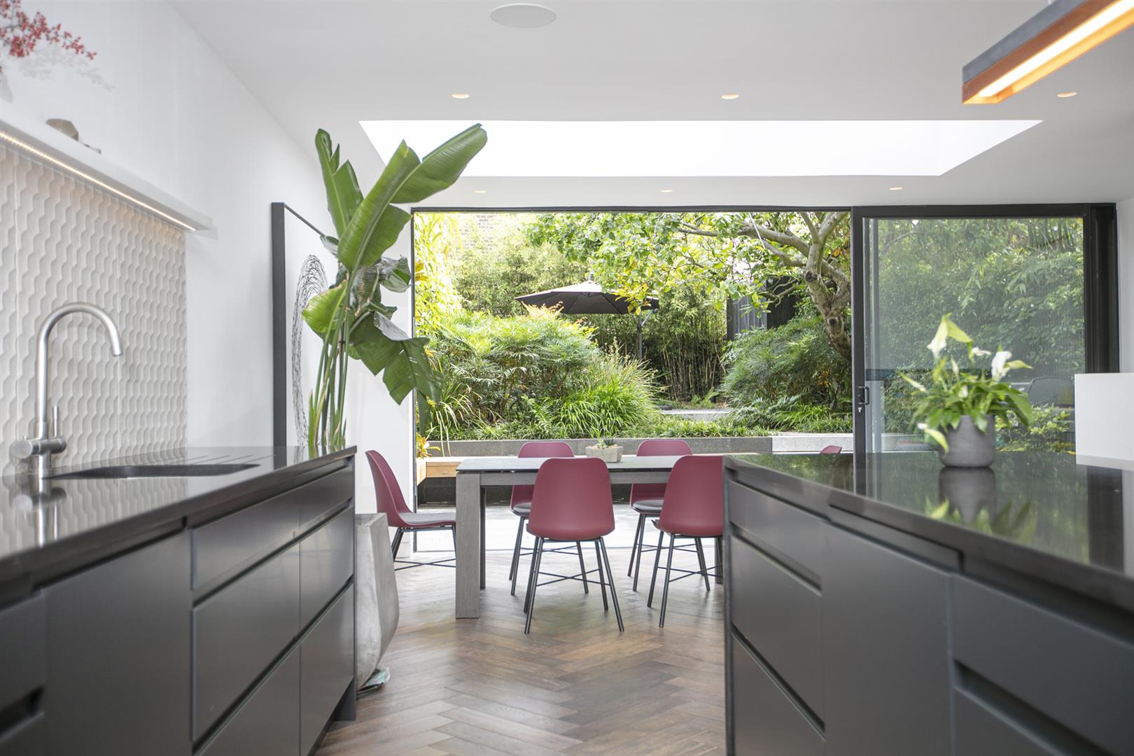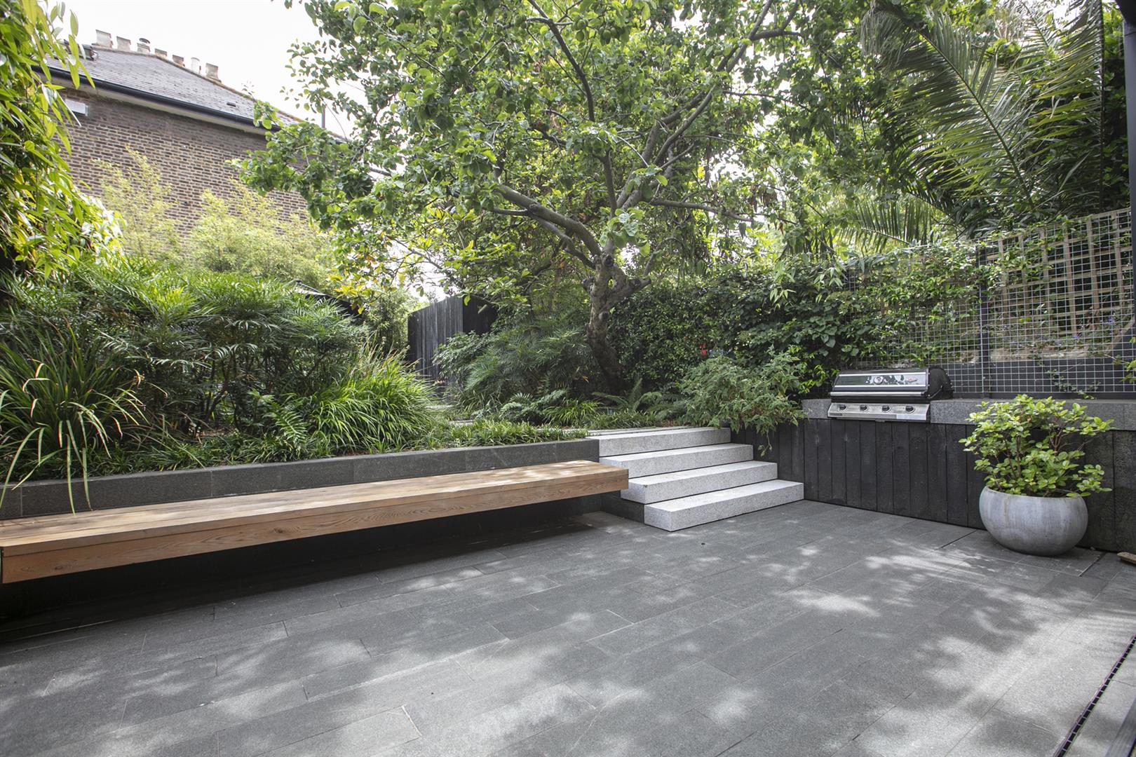 Heading downward you meet a further front-facing reception with deep recessed storage and direct front access - great for mucky dogs and unruly kids. A handy wc sits under the stairs. The uniquely fabulous kitchen/diner takes the rear of the lower ground floor with an elegant run of contemporary cabinets and counters. Appliances include an induction hob, integrated coffee machine, double steam oven, dishwasher and a full height fridge and full height separate freezer. There's enough space to seat both sides for Christmas dinner and a cute play area for the kids neatly slotted into the alcove of the adjoining pantry. A wall of wide sliding glass doors open to the fantastic patio and split level garden where an array of well maintained leafiness offers perfect dappled light. A further rear patio enjoys a lovely view back to the house.