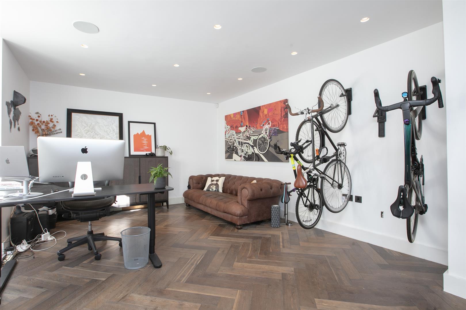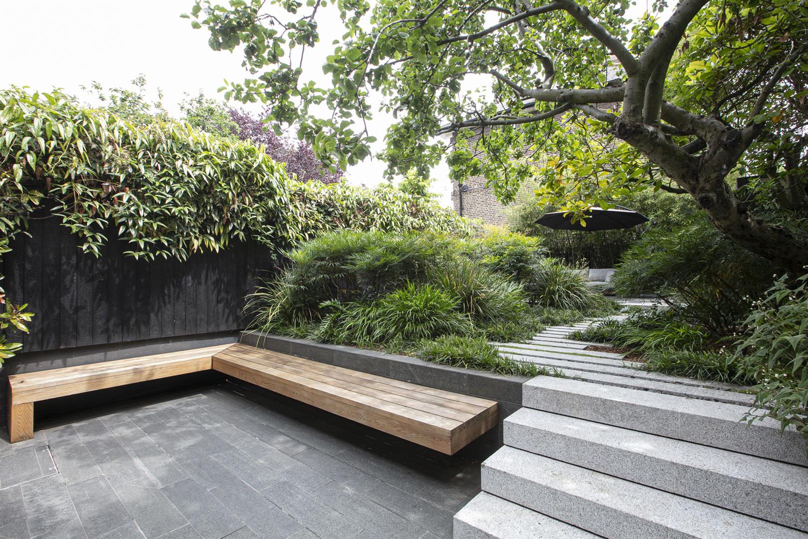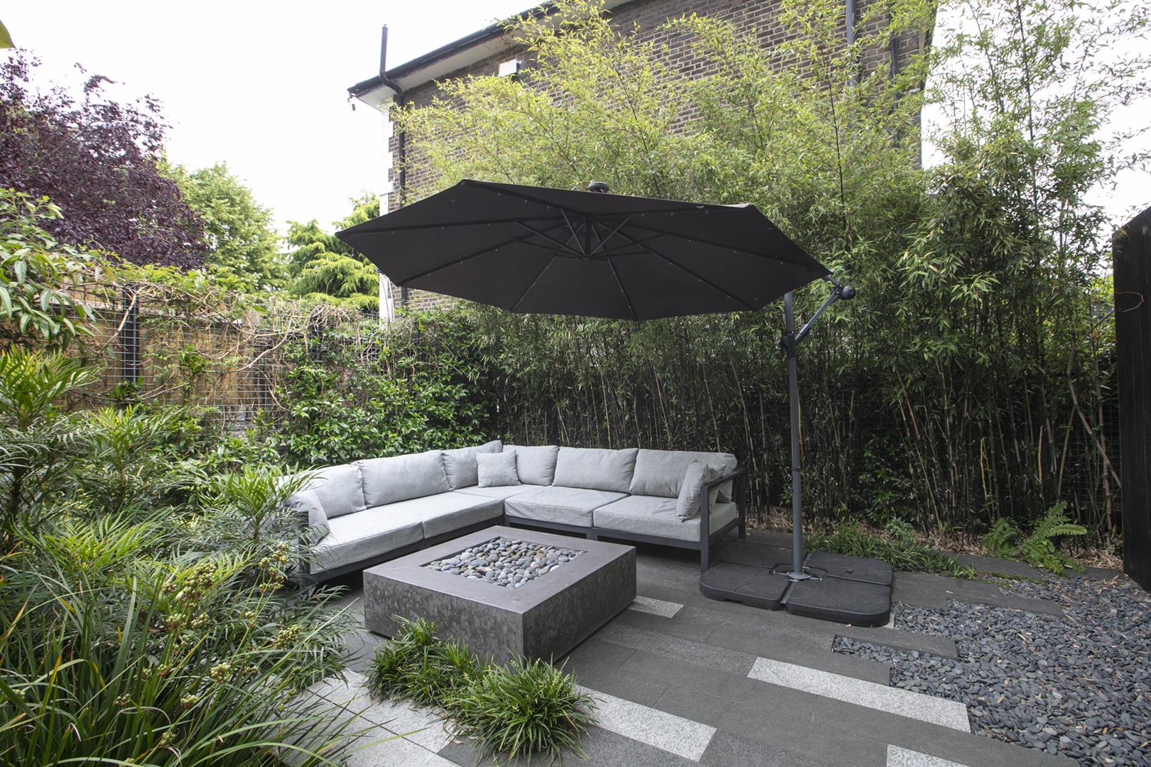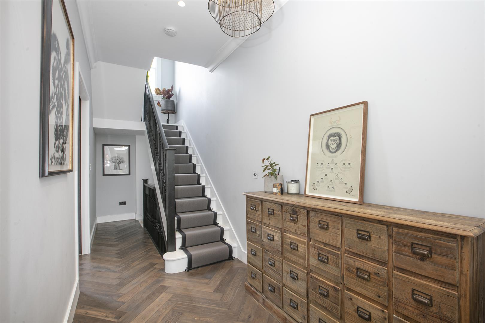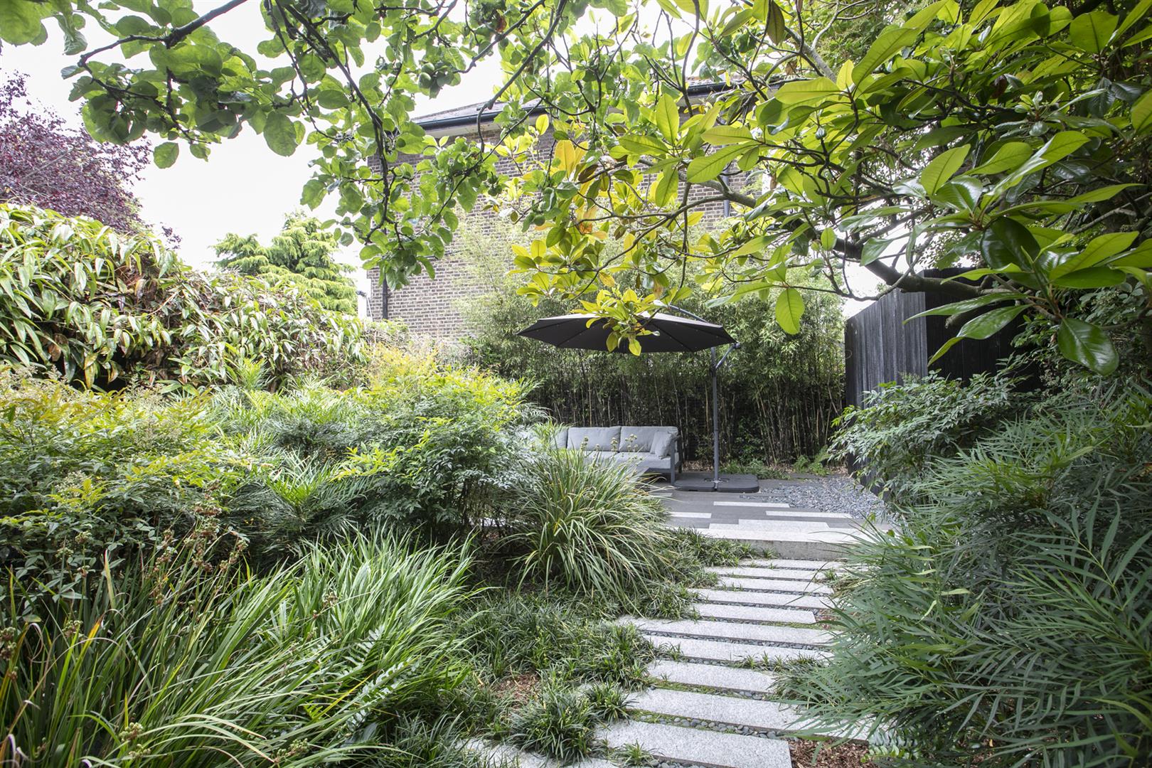 Heading downward you meet a further front-facing reception with deep recessed storage and direct front access - great for mucky dogs and unruly kids. A handy wc sits under the stairs. The uniquely fabulous kitchen/diner takes the rear of the lower ground floor with an elegant run of contemporary cabinets and counters. Appliances include an induction hob, integrated coffee machine, double steam oven, dishwasher and a full height fridge and full height separate freezer. There's enough space to seat both sides for Christmas dinner and a cute play area for the kids neatly slotted into the alcove of the adjoining pantry. A wall of wide sliding glass doors open to the fantastic patio and split level garden where an array of well maintained leafiness offers perfect dappled light. A further rear patio enjoys a lovely view back to the house.
